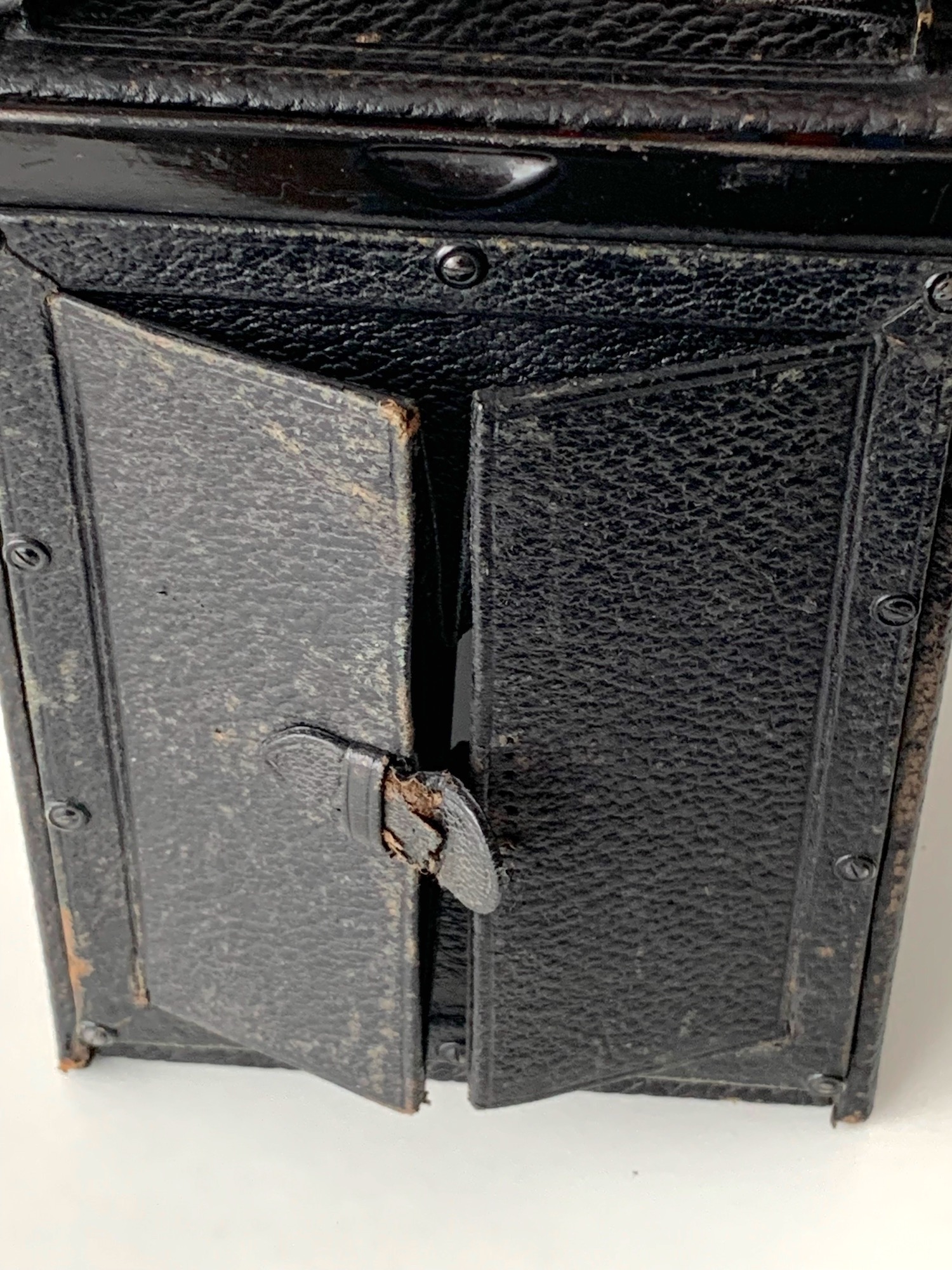 Das Mattscheibenrückteil weist dieselbe fünfstellige Seriennummer wie die Kamera auf; die zweigeteilte Lichtschachtabdeckung scheint typisch für frühe Goerz-Kameras. Die Rückseite ist mit einem Falz versehen; Normalfalz-Kassetten passen nicht, weil hier eine Breite von 10,7 cm erforderlich ist.