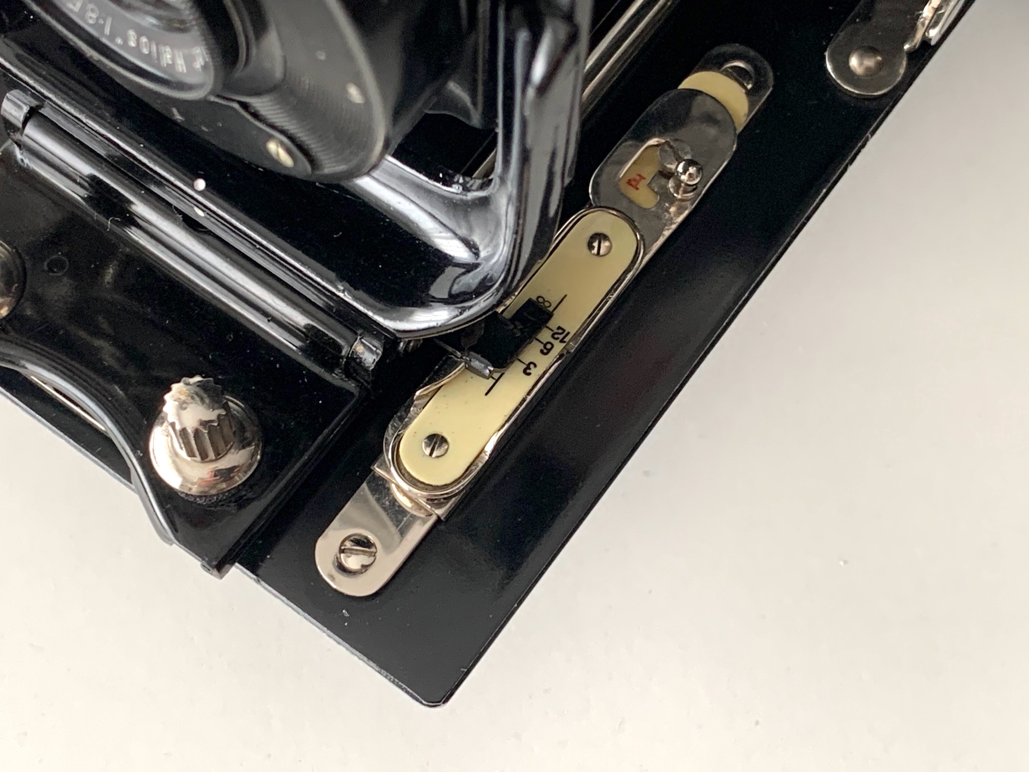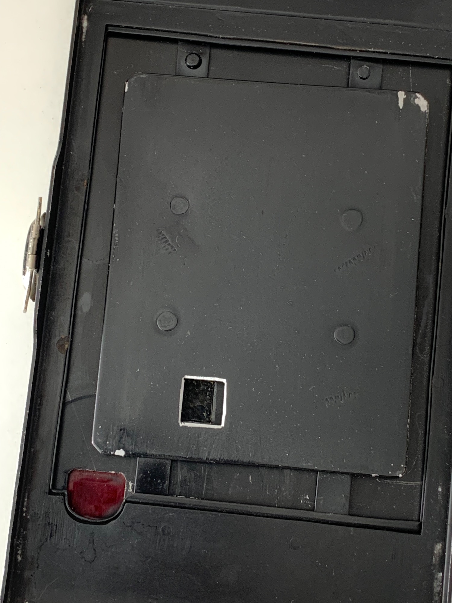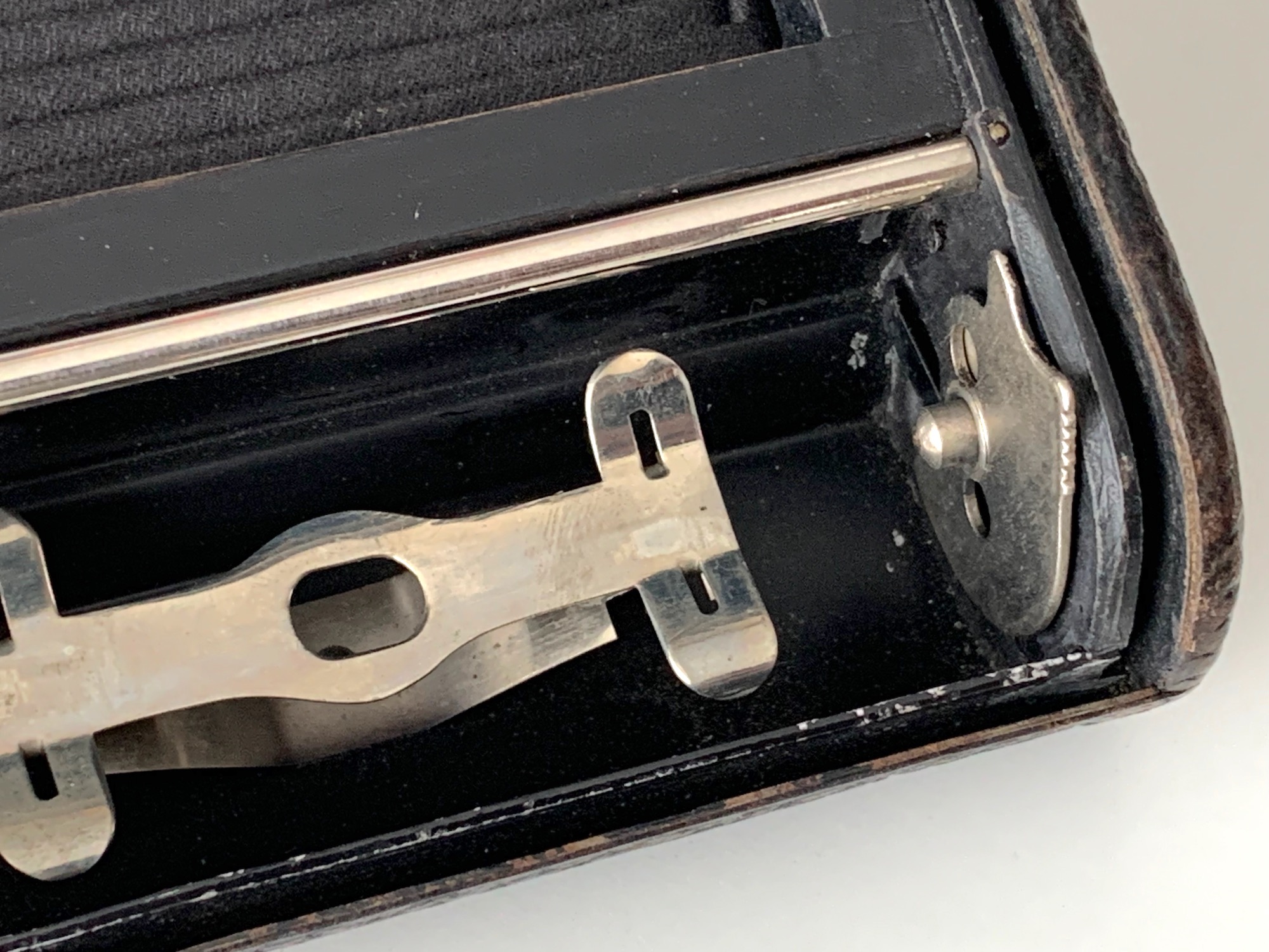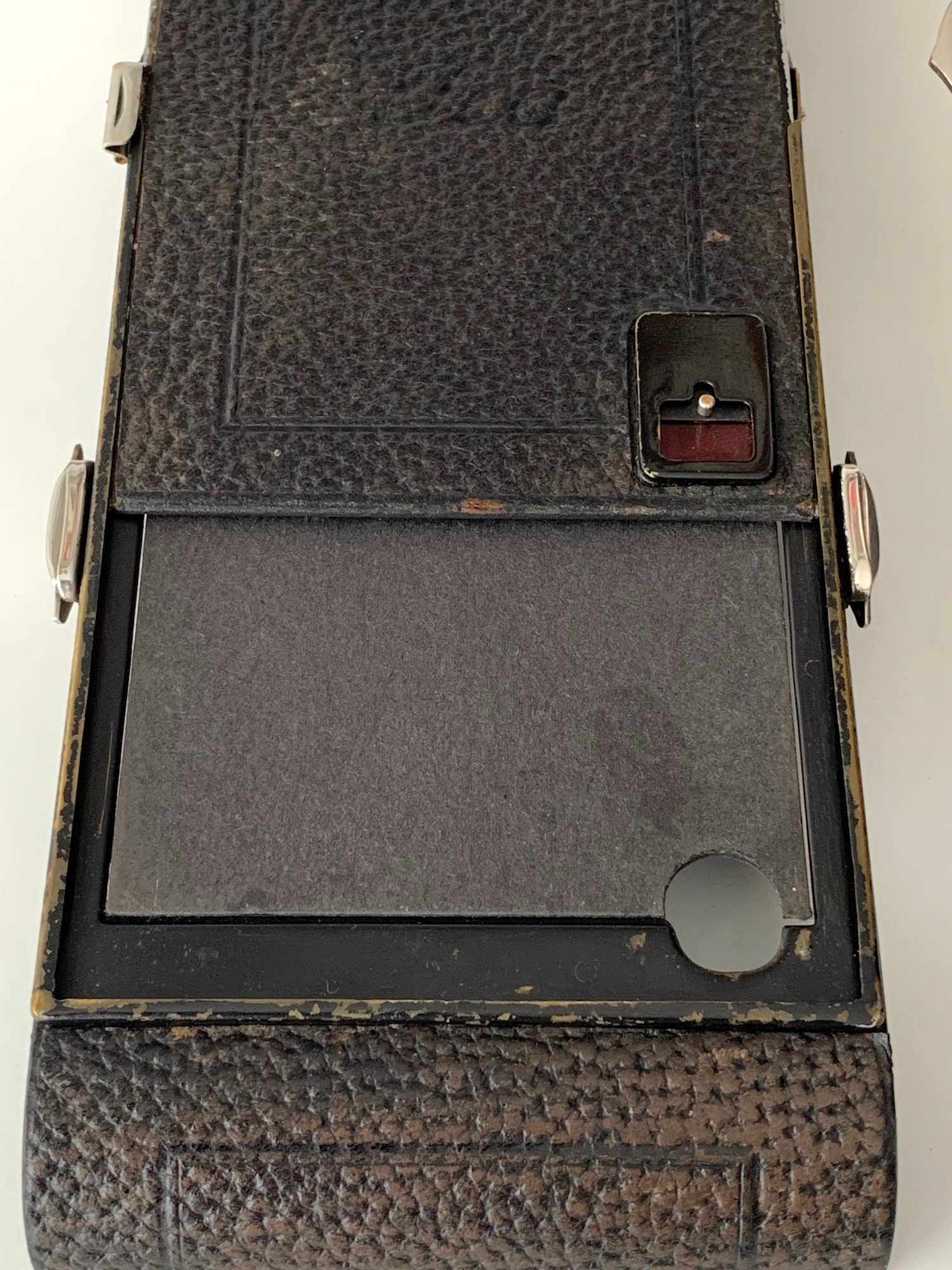 Interessant an diesem Exemplar ist ein Umbau, den ein früherer Nutzer vorgenommen hat und der irgendwann wieder rückgängig gemacht wurde. Die Kamera wurde durch Einlage einer federnden Andruckplatte für 120er Film umgerüstet. (Entsprechende Adapter habe ich schon öfter in solchen Kameras vorgefunden.) Für das Rotfenster wurde eine Bohrung in der Rückwand vorgenommen, die später durch die Belederung wieder geschlossen wurde. Wann das geschehen ist, kann ich nicht sagen; ich habe die Kamera so bekommen.