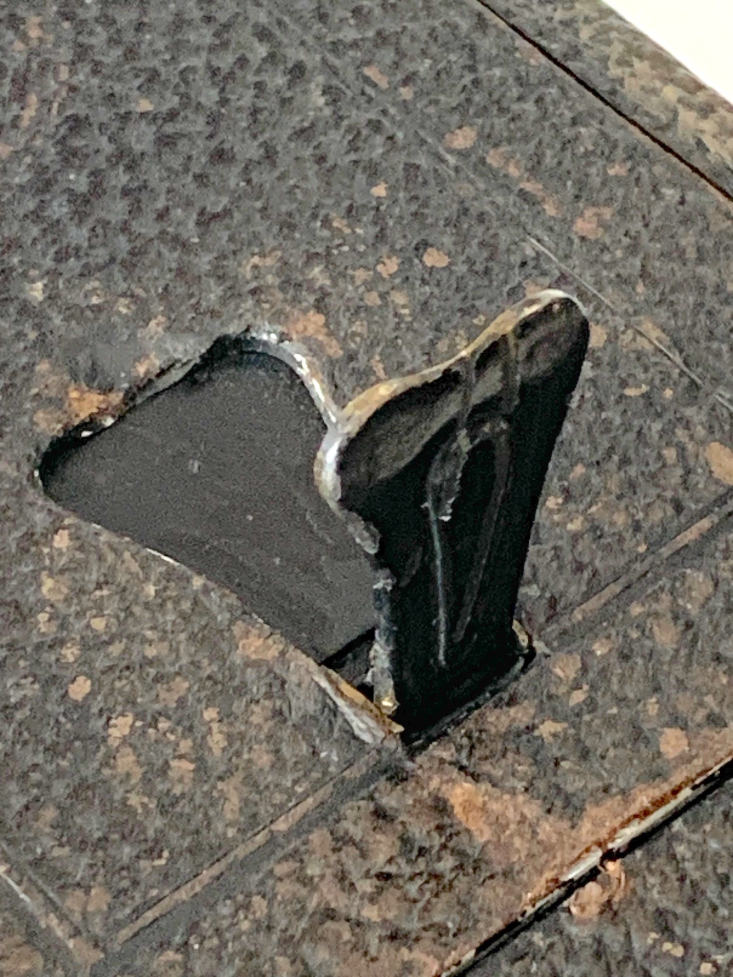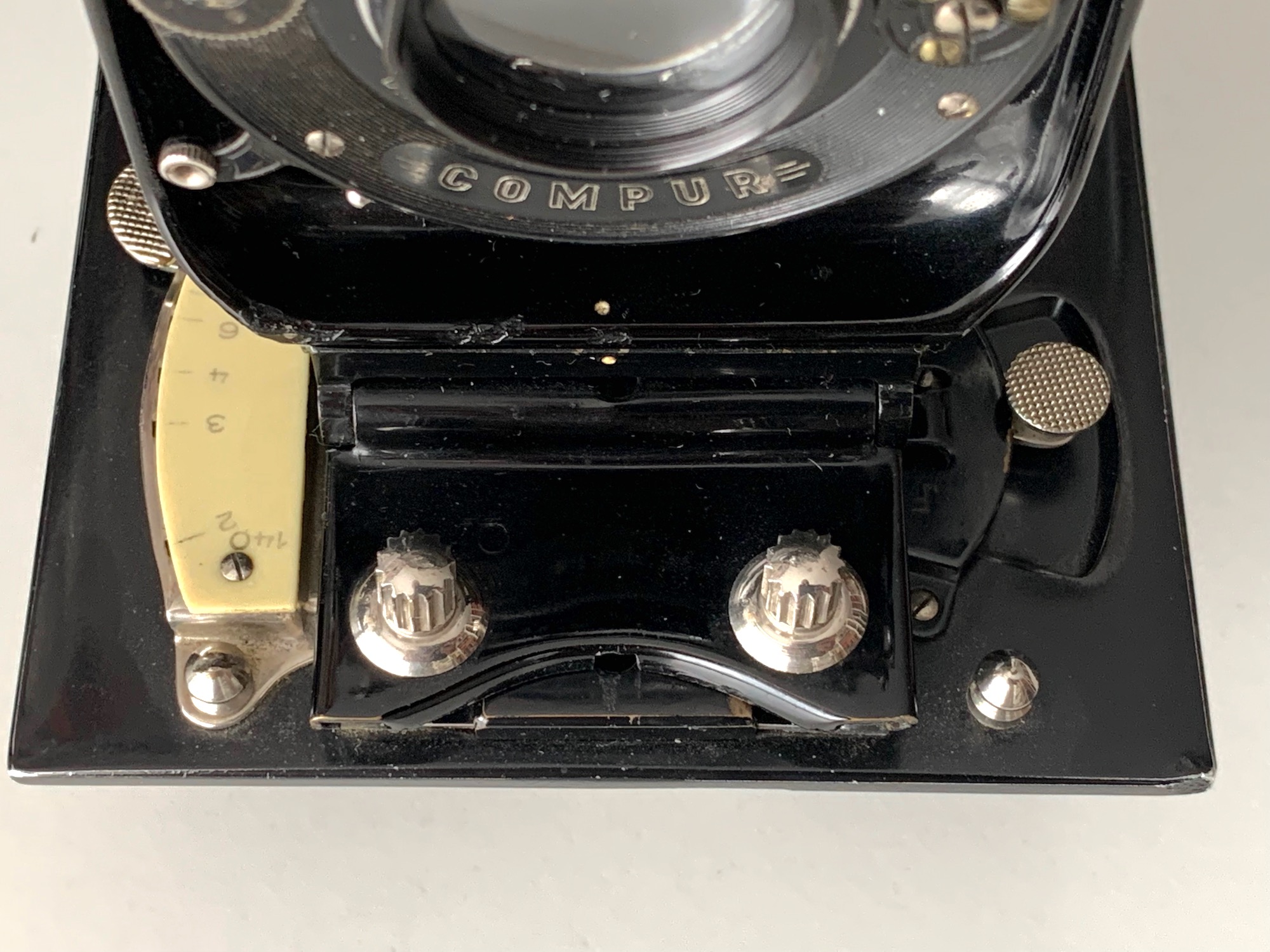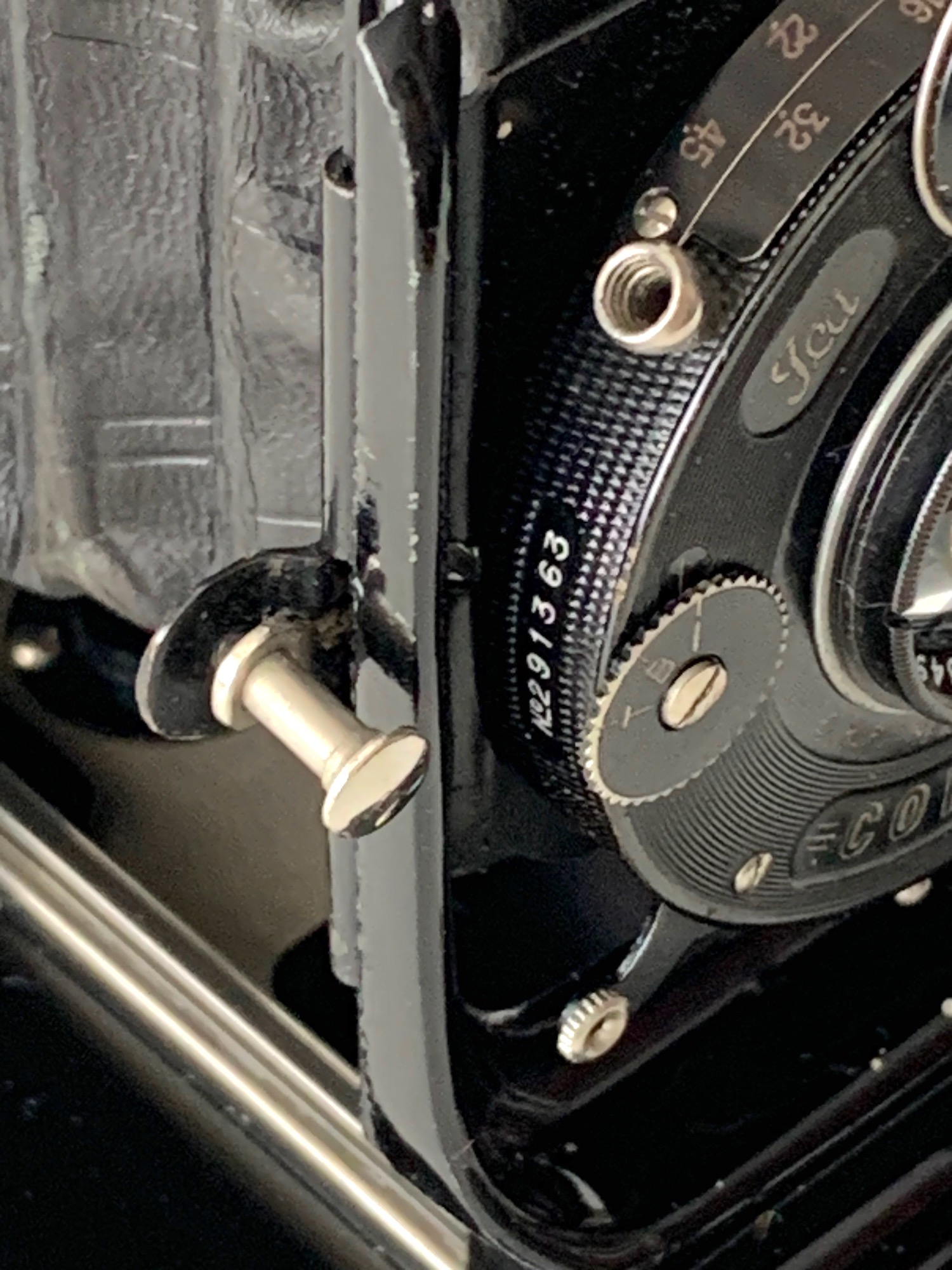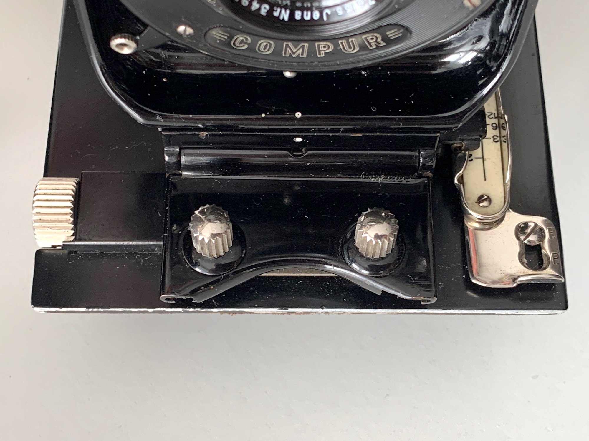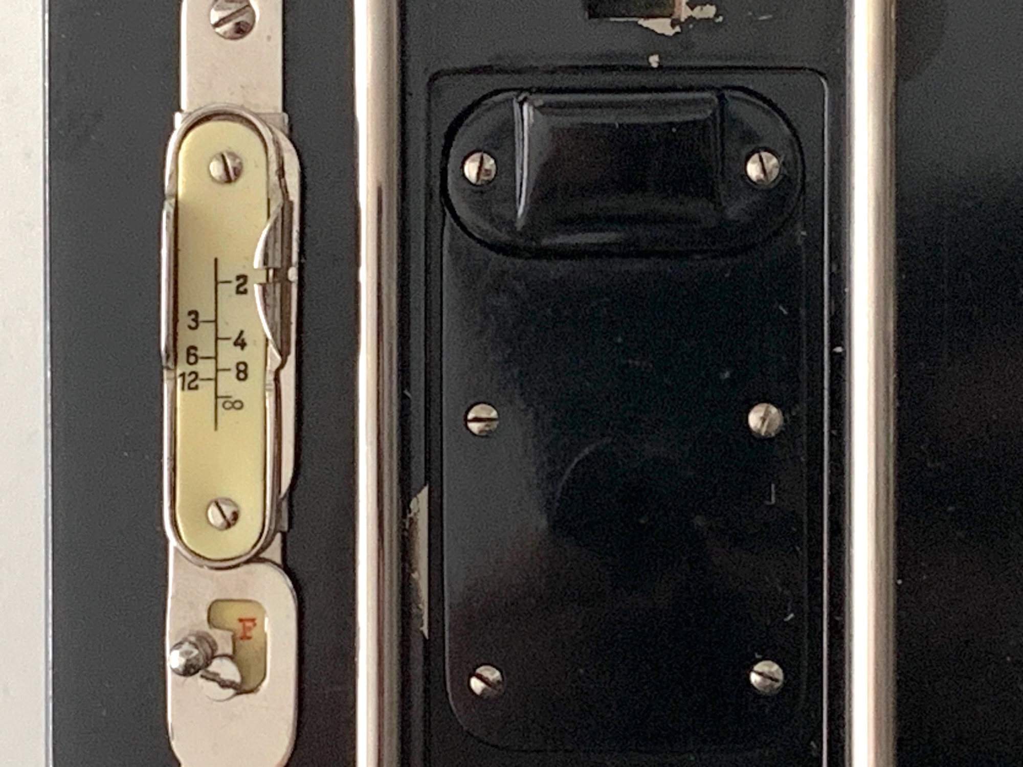 Interessant an diesem Exemplar ist ein Umbau, den ein früherer Nutzer vorgenommen hat und der irgendwann wieder rückgängig gemacht wurde. Die Kamera wurde durch Einlage einer federnden Andruckplatte für 120er Film umgerüstet. (Entsprechende Adapter habe ich schon öfter in solchen Kameras vorgefunden.) Für das Rotfenster wurde eine Bohrung in der Rückwand vorgenommen, die später durch die Belederung wieder geschlossen wurde. Wann das geschehen ist, kann ich nicht sagen; ich habe die Kamera so bekommen.
