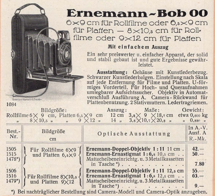 es dürfte sich um eine Bob 00 handeln, das einfachste Modell der Bob-Reihe. es gab sie im Format 6x9 bzw. 6,5x9 oder 8x10,5. Charakteristische Merkmale sind die Fokussierung ohne Trieb, die Mittelschraube als Handhabe, die einfachen Spreizen/Scharniere. Die Kamera dürfte einen Kunstlederbezug und Kunstlederbalgen haben. Der Verschluss ist ein Ernemann Automat 25–100; lat. Katalog 1925 war sie u.a. mit Doppel-Objektiv 11/11 zu haben. Ich lese bei Deinem Exemplar auch 10,5 cm als Brennweite, aber hier gab es im Zeitraum 1917-25, in den Göllner sie datiert, sicherlich Änderungen. Anbei der betr. Ausschnitt aus dem Katalog 1925.