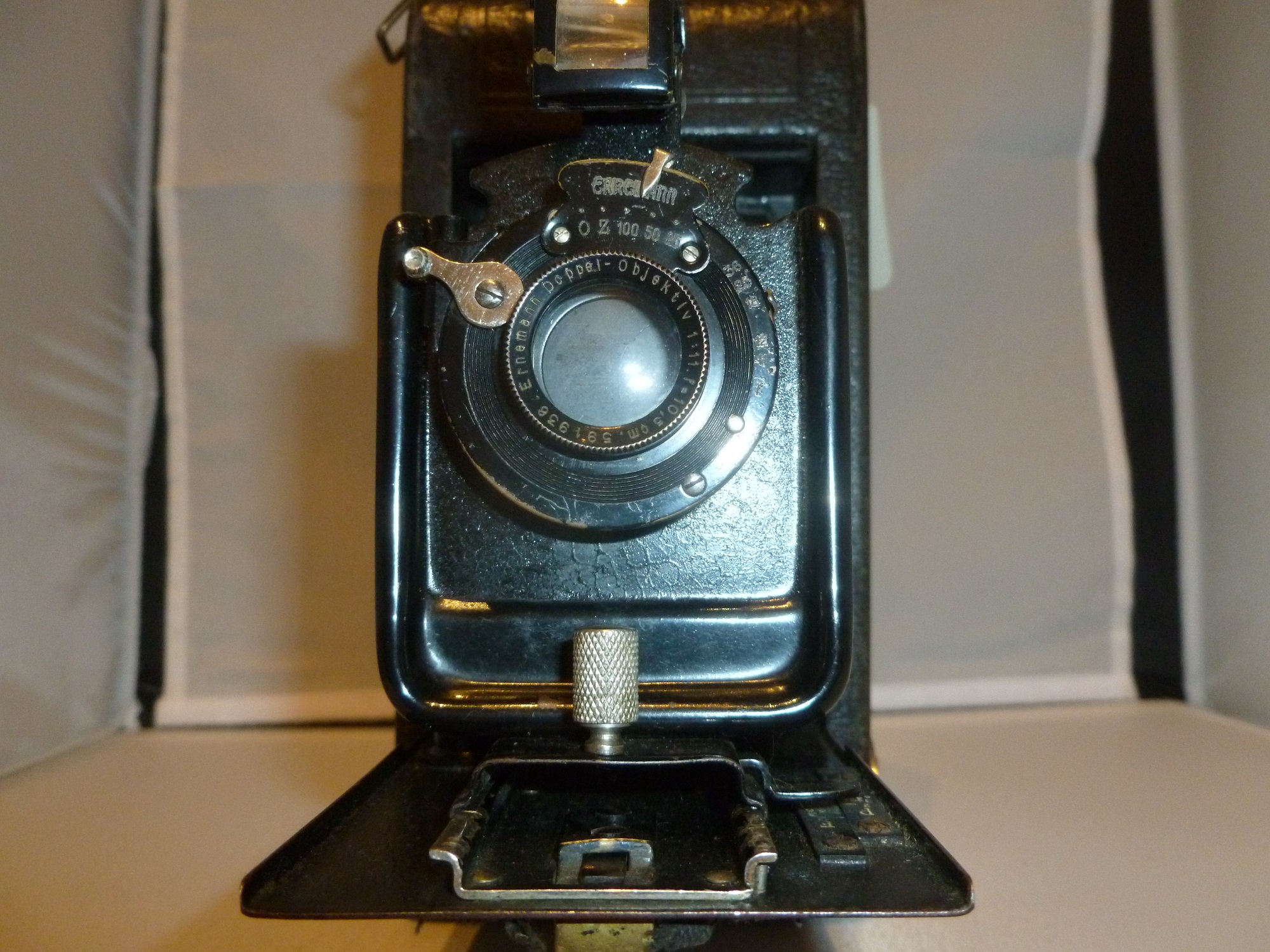 vor einigen Jahren habe ich eine Ernemann gekauft obwohl ich kein Ernemann Sammler bin, gekauft habe ich nur wegen des Händlerschildes ws sich dann aber nicht aus der richtigen Stadt stammte, also typischer Fehlkauf. Vielleicht kann mir jemand helfen und die Kamera bestimmen.