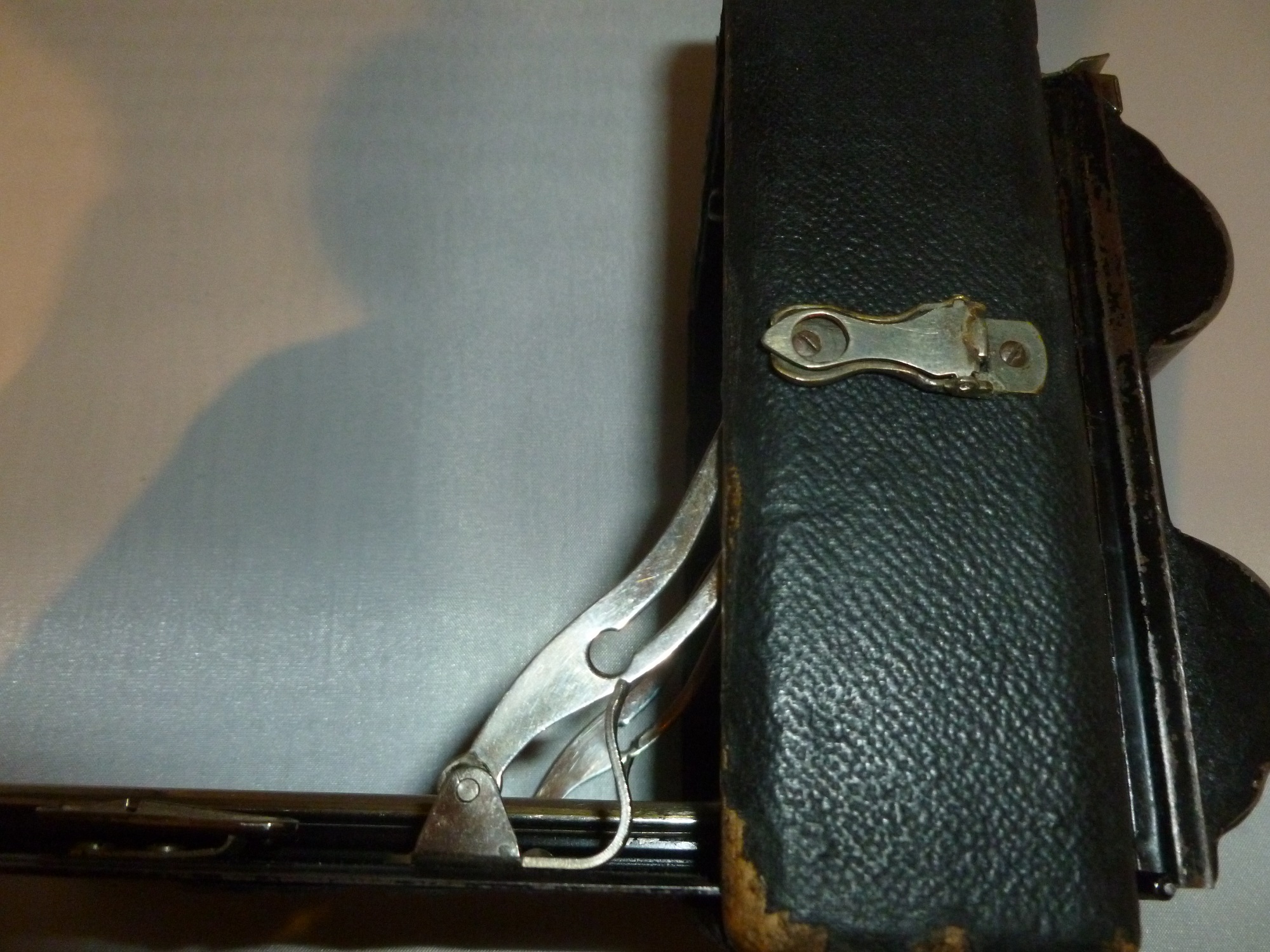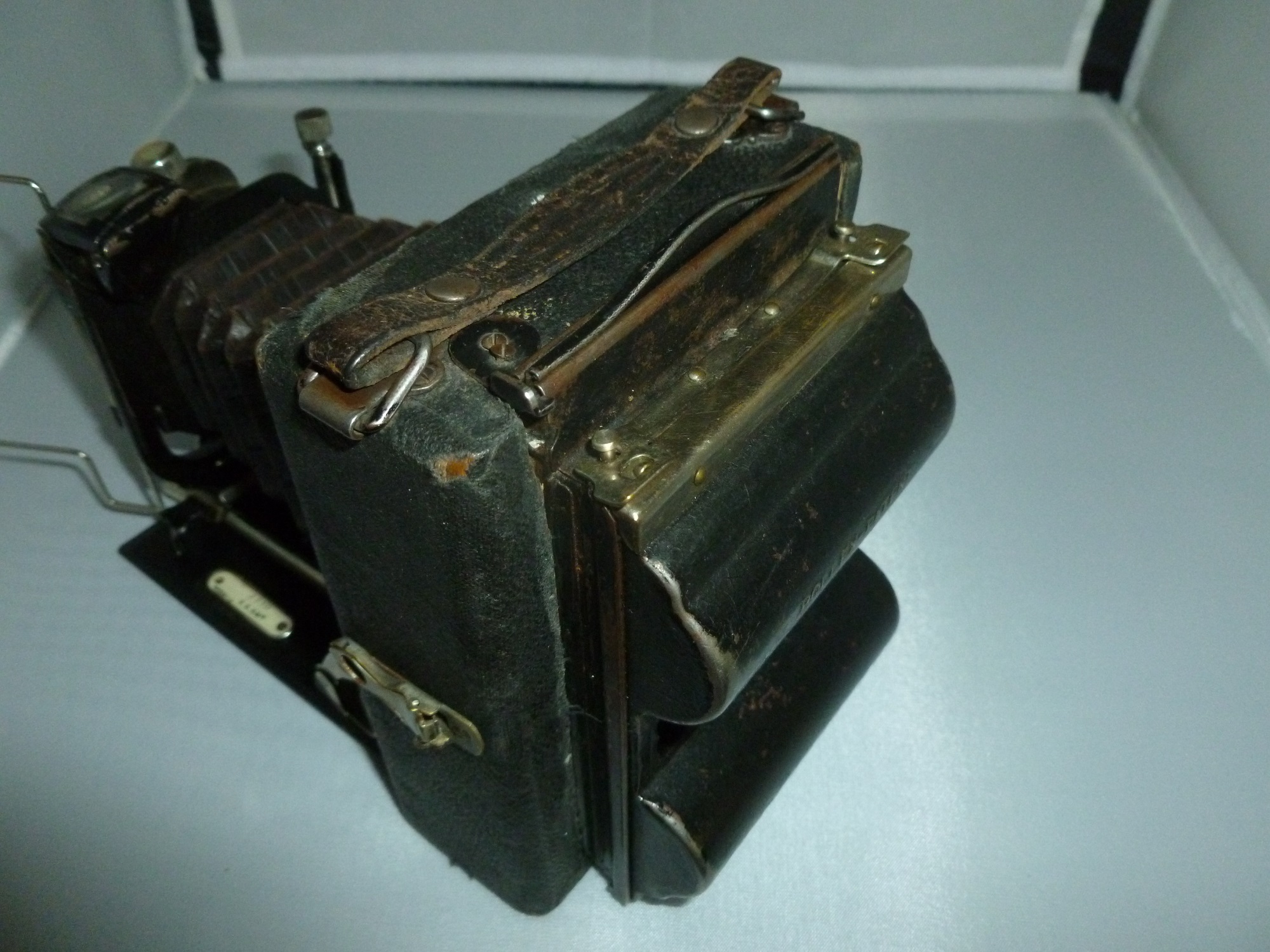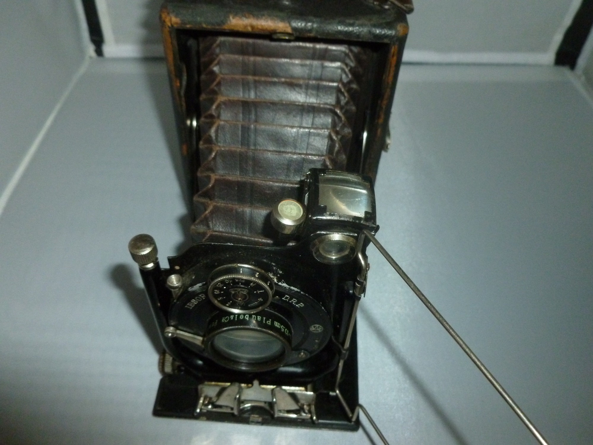 die Kamera von der ich Bilder kann ich nicht zuordnen aber vielleicht kennt ja jemand das Gehäuse, das Objektiv kam wahrscheilich später hinzu denn es paßt so garnicht ins Bild Objektiv: Plaubel und & CoNr. 59959 4,5x10,5 Wara Pecomat Verschluss: Ibsor 1 sec bis 1/125 B/T