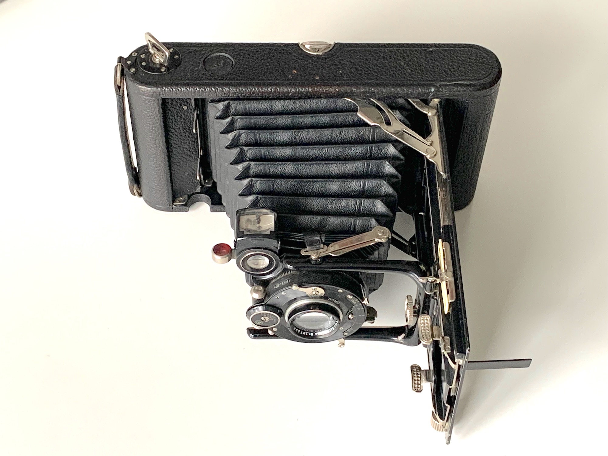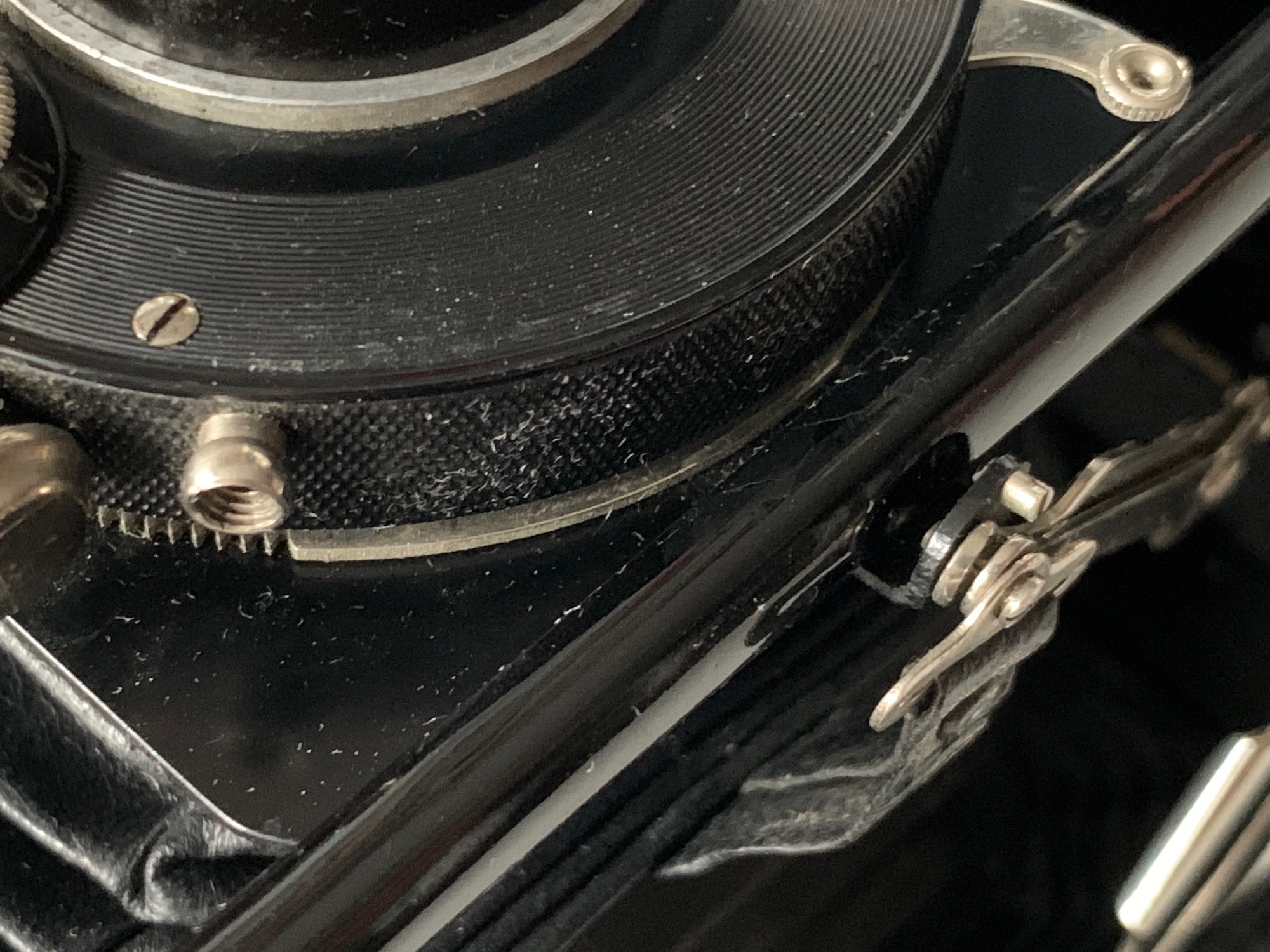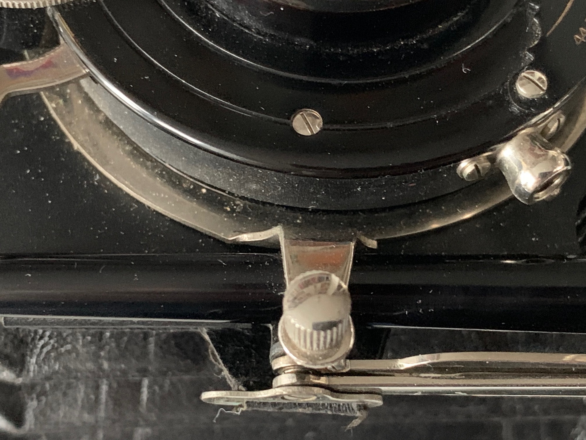 Ich habe den Eindruck, dass der Compound etwas zu groß ist und der Hebel daher entfernt wurde. Dass es einen solchen Hebel gegeben haben muss, erscheint mir zwingend: Die aufwändige Verstellung über das Zahnrad ist ja nur sinnvoll, wenn es einen seitlichen Hebel gibt, ansonsten hätte man einen einfachen Verschiebemechanismus vorsehen können. Ob diese Modifikation schon im Werk erfolgte oder durch den Importeur oder ob ein Nutzer die Kamera aufgewertet hat, lässt sich nicht mehr feststellen. Für die letztere Annahme spricht, dass die Kamera mit einem Klapp-Rahmensucher ausgestattet war, wie er in den 1920er Jahren an Ernemann-Kameras üblich war; hier hat wohl ein früherer Nutzer den Bedienungskomfort erhöhen wollen – vielleicht hat er auch das Objektiv eingebaut.