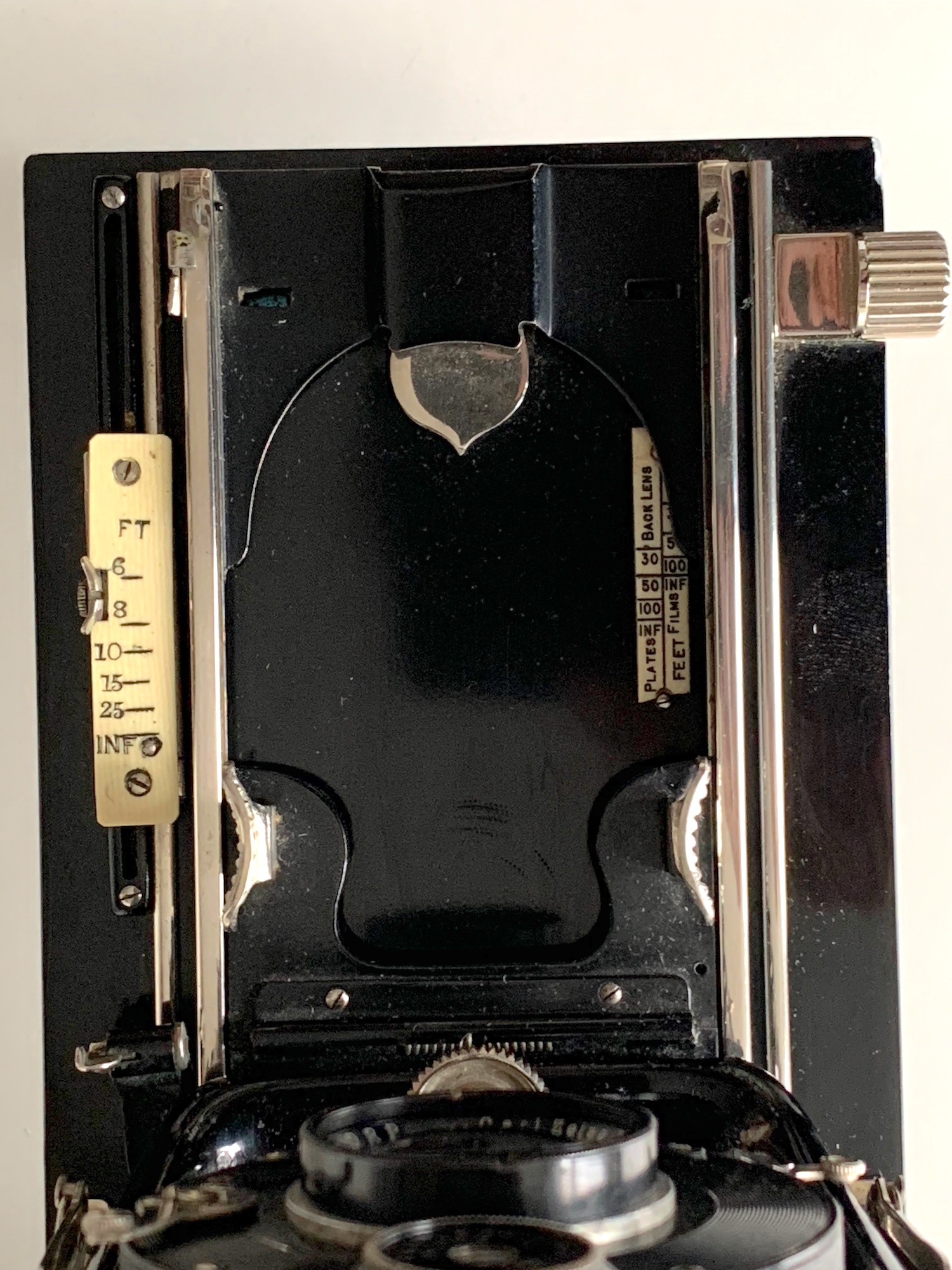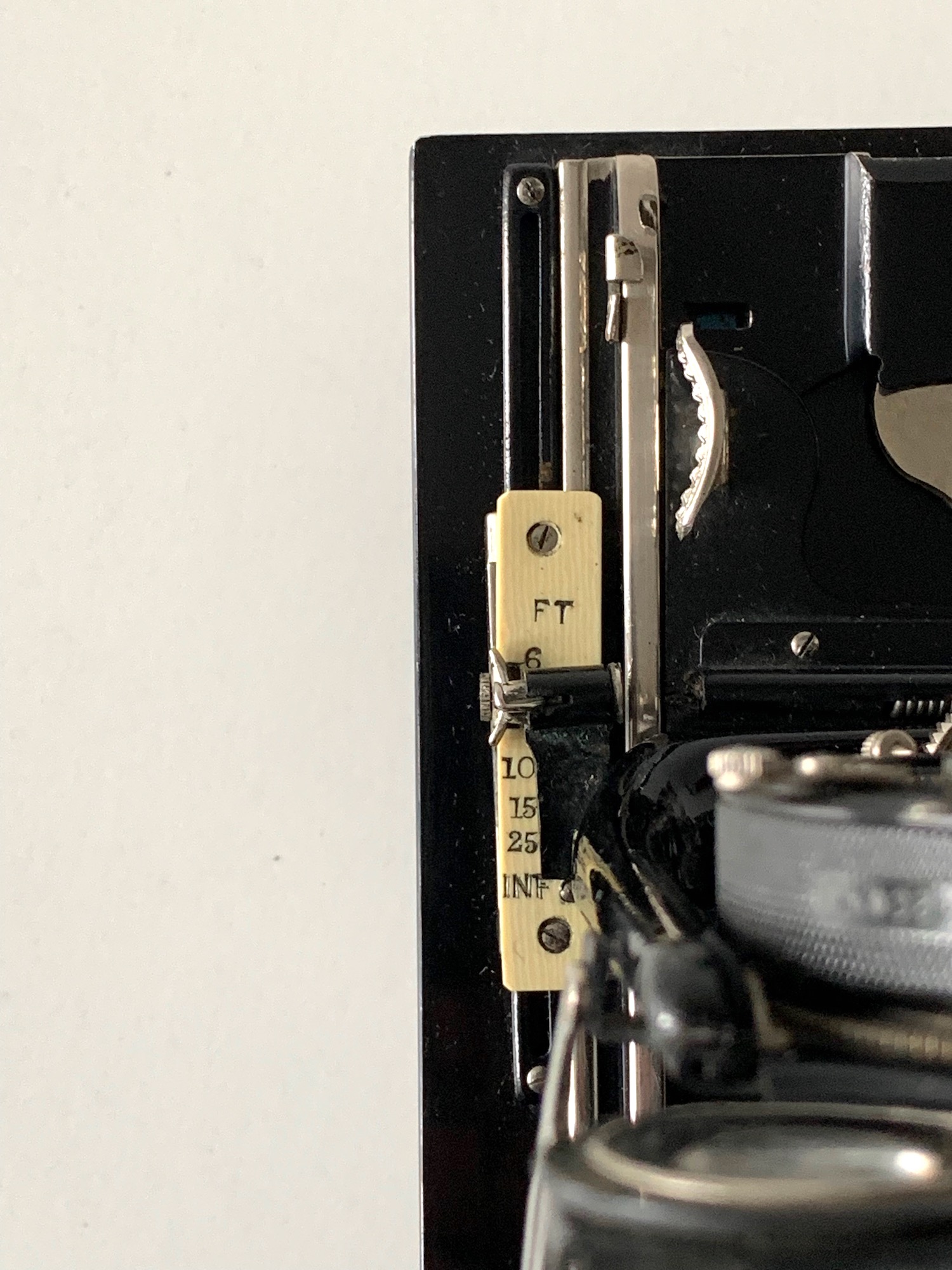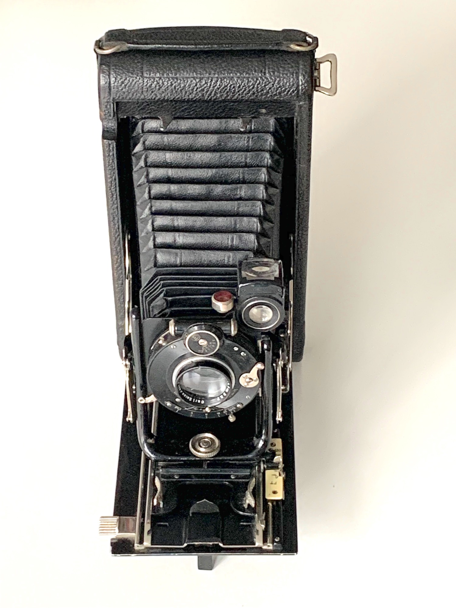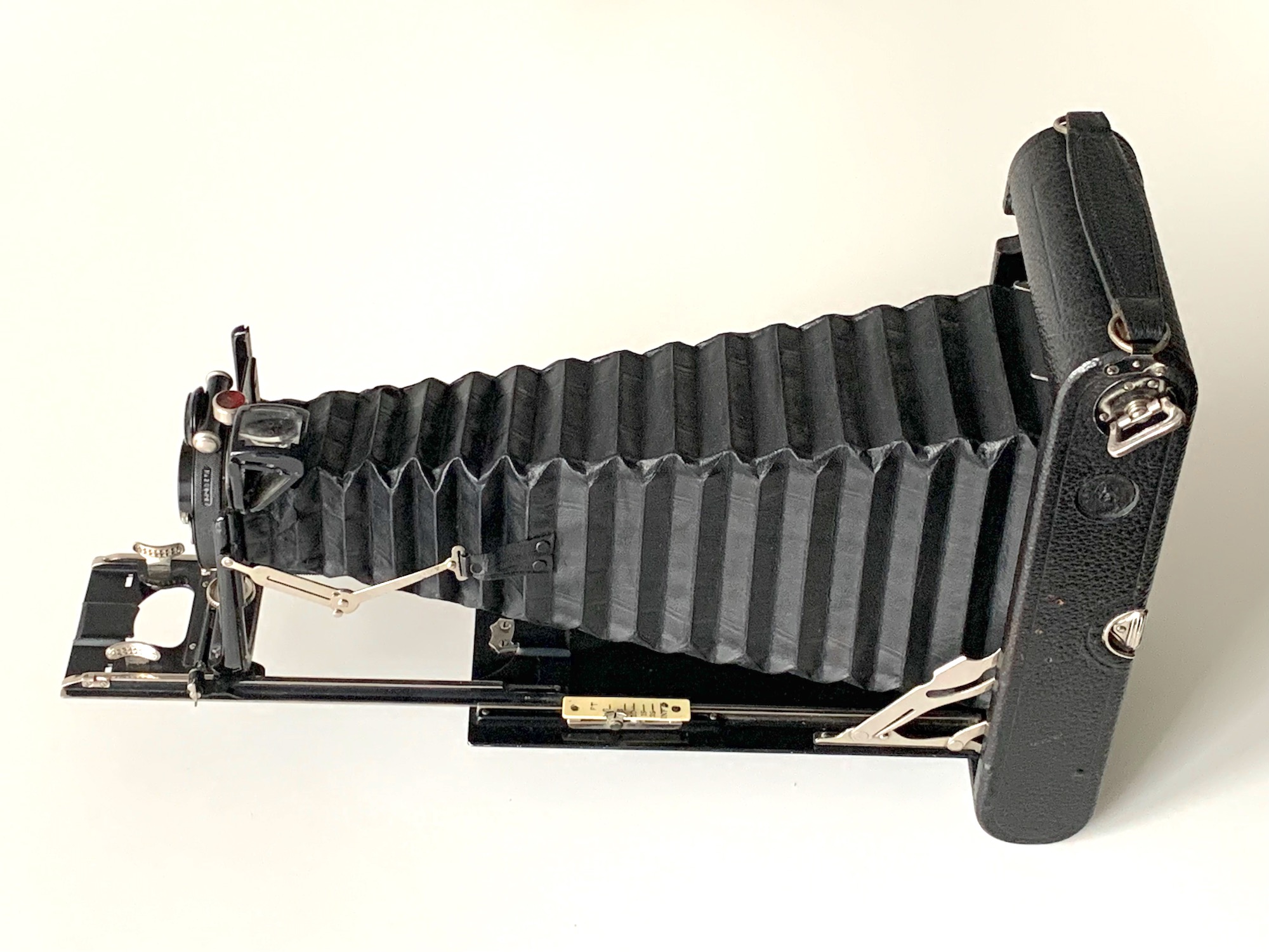 Ich habe den Eindruck, dass der Compound etwas zu groß ist und der Hebel daher entfernt wurde. Dass es einen solchen Hebel gegeben haben muss, erscheint mir zwingend: Die aufwändige Verstellung über das Zahnrad ist ja nur sinnvoll, wenn es einen seitlichen Hebel gibt, ansonsten hätte man einen einfachen Verschiebemechanismus vorsehen können. Ob diese Modifikation schon im Werk erfolgte oder durch den Importeur oder ob ein Nutzer die Kamera aufgewertet hat, lässt sich nicht mehr feststellen. Für die letztere Annahme spricht, dass die Kamera mit einem Klapp-Rahmensucher ausgestattet war, wie er in den 1920er Jahren an Ernemann-Kameras üblich war; hier hat wohl ein früherer Nutzer den Bedienungskomfort erhöhen wollen – vielleicht hat er auch das Objektiv eingebaut.
