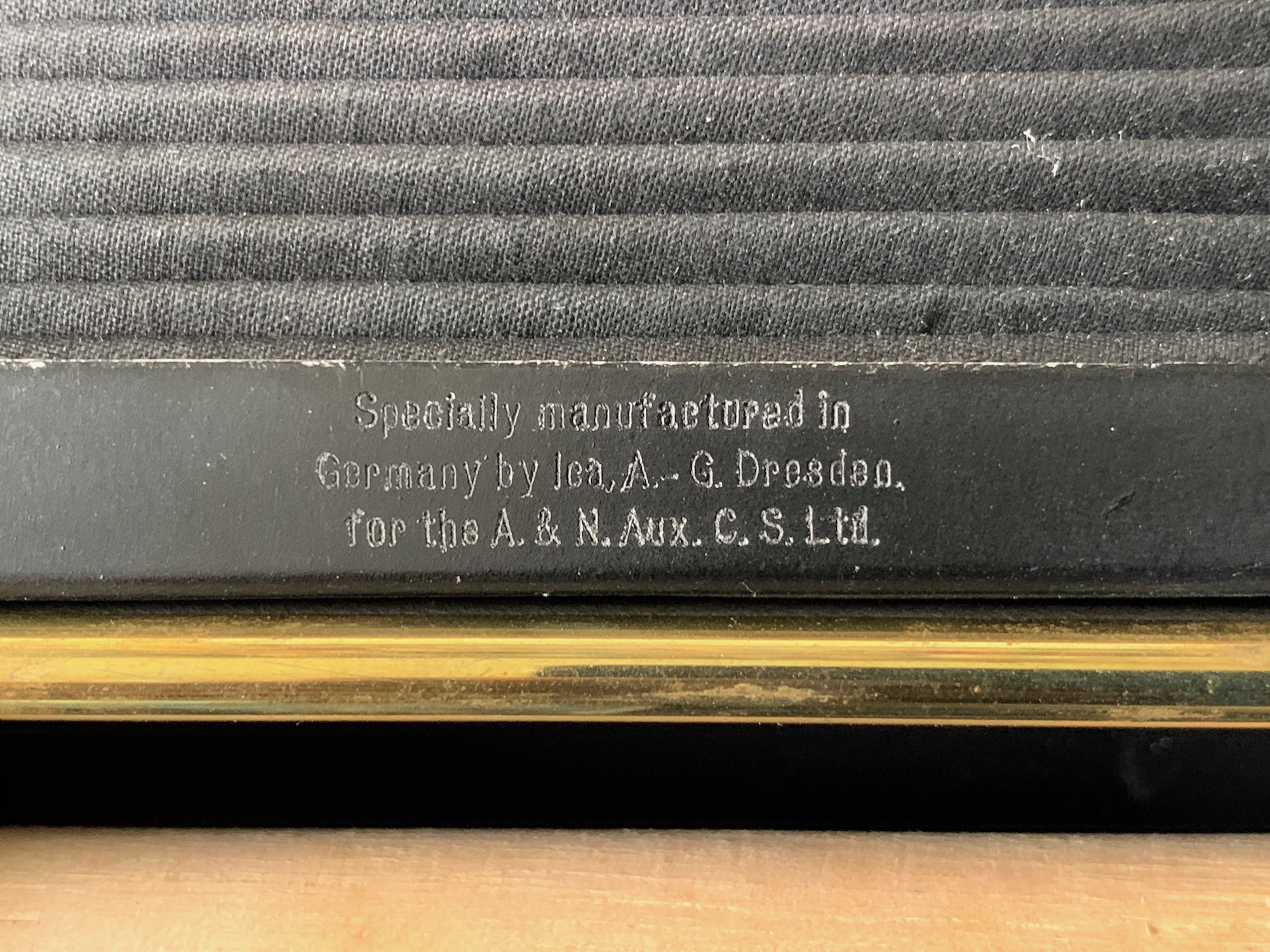 Specially manufactured in Germany by Ica, A.-G. Dresden for the A[rmy] & N[avy] Aux. C[o-operative] S[ociety] Ltd.