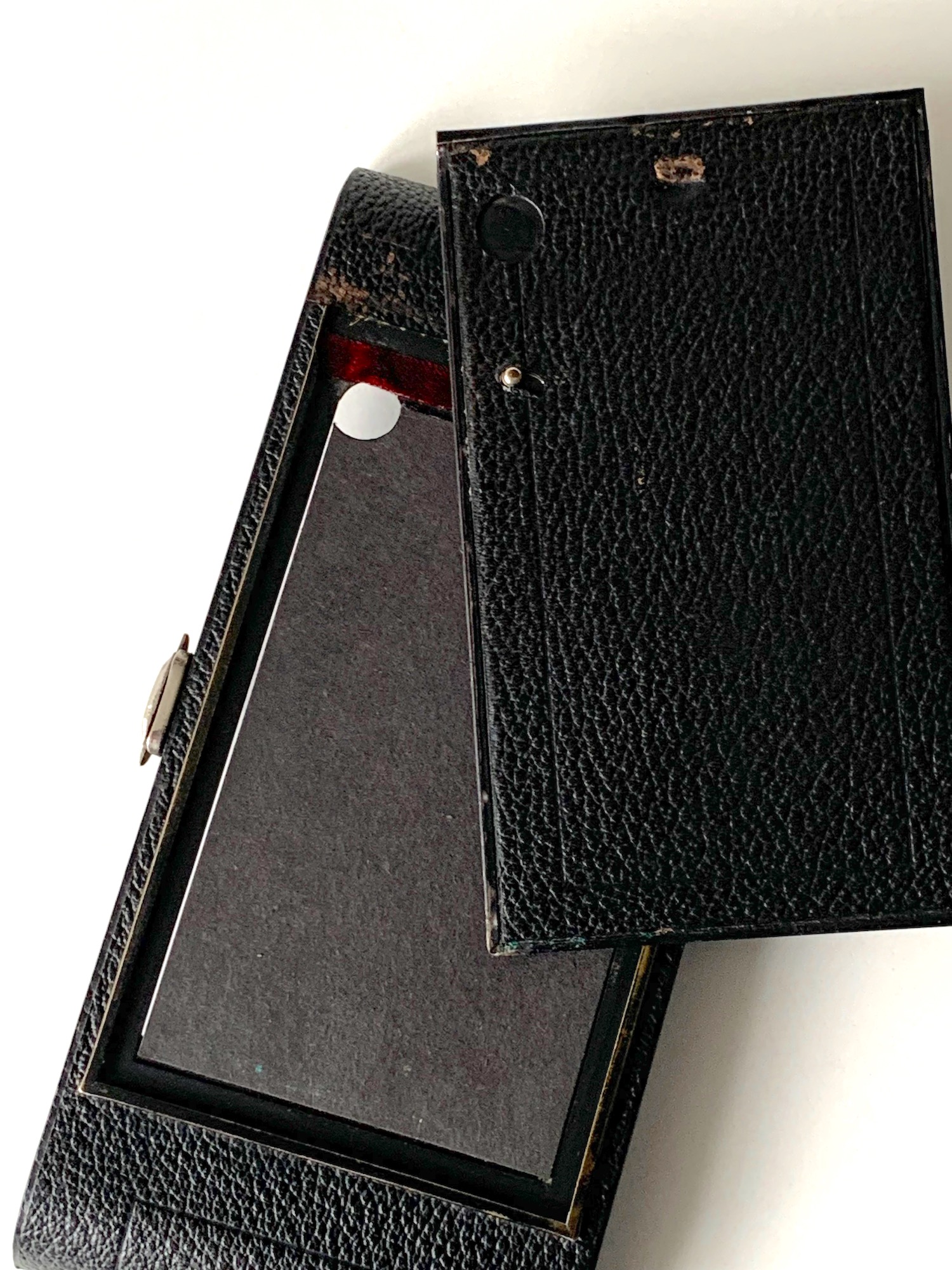 Auch das Design der Kippstandarte und den Mechanismus der horizontalen und vertikalen Objektivverstellung kenn man von anderen Nixe-Kameras, z. B. der kürzlich vorgestellten Nixe 557 im Format 8x10,5 (s. hier: https://blende-und-zeit.sirutor-und-comp...&thread=243). Die Höhenverstellung erfolgt auch am vorliegenden Modell über einen hinter dem Verschlussbefindlichen Zahnkranz; der seitliche Hebel scheint bei diesem Exemplar zu fehlen. Wie die Entfernungsskalen in ft. zeigen, liegt hier ein Exportexemplar vor. Die abnehmbare Rückwand ist hier mit der für Rollfilmbetrieb erforderlichen Abdeckung zu sehen, an ihrer Stelle können Rückteile/Platten 9x14 eingeschoben werden, die ich leider nicht zur Hand habe. Das Rotfenster besitzt übrigens einen automatisch zurückfedernden Verschluss.