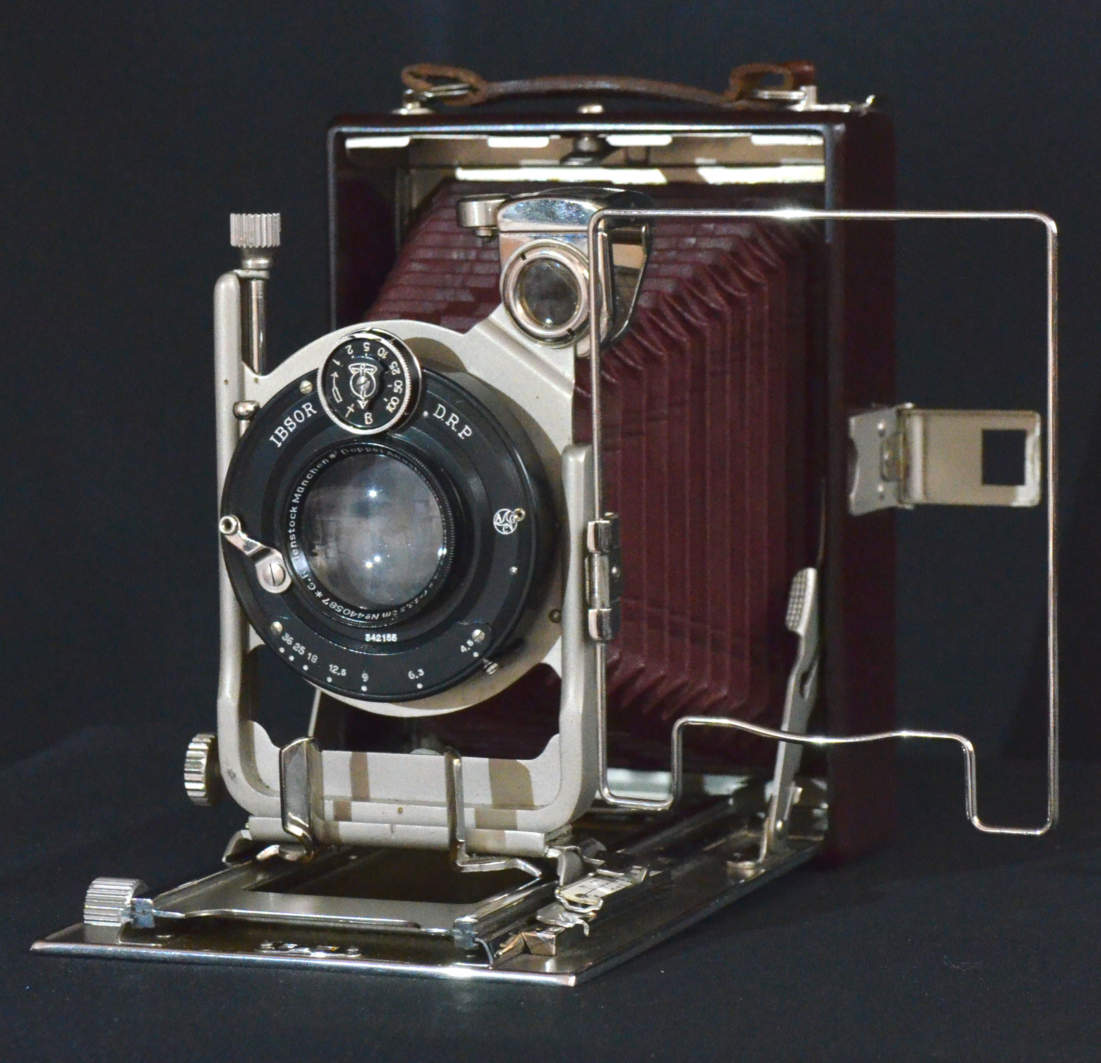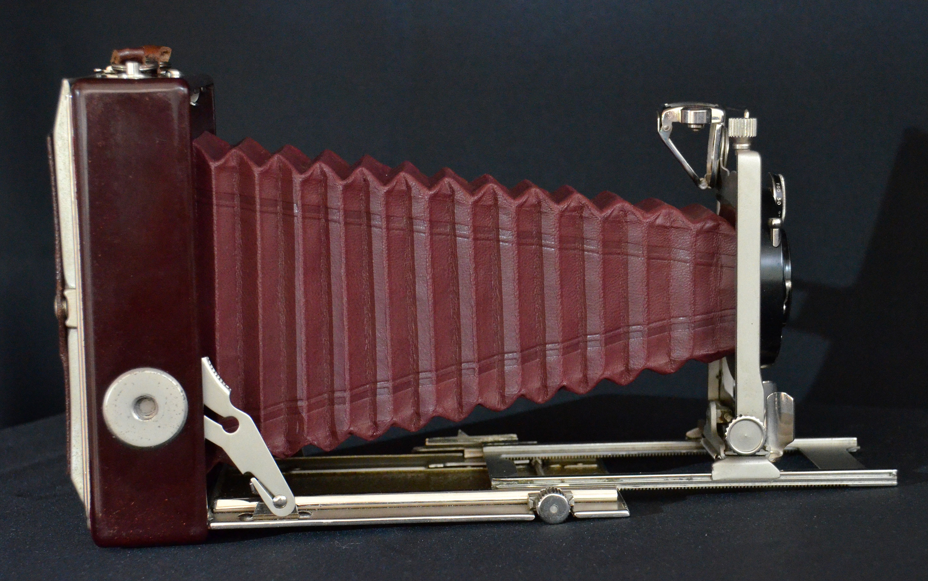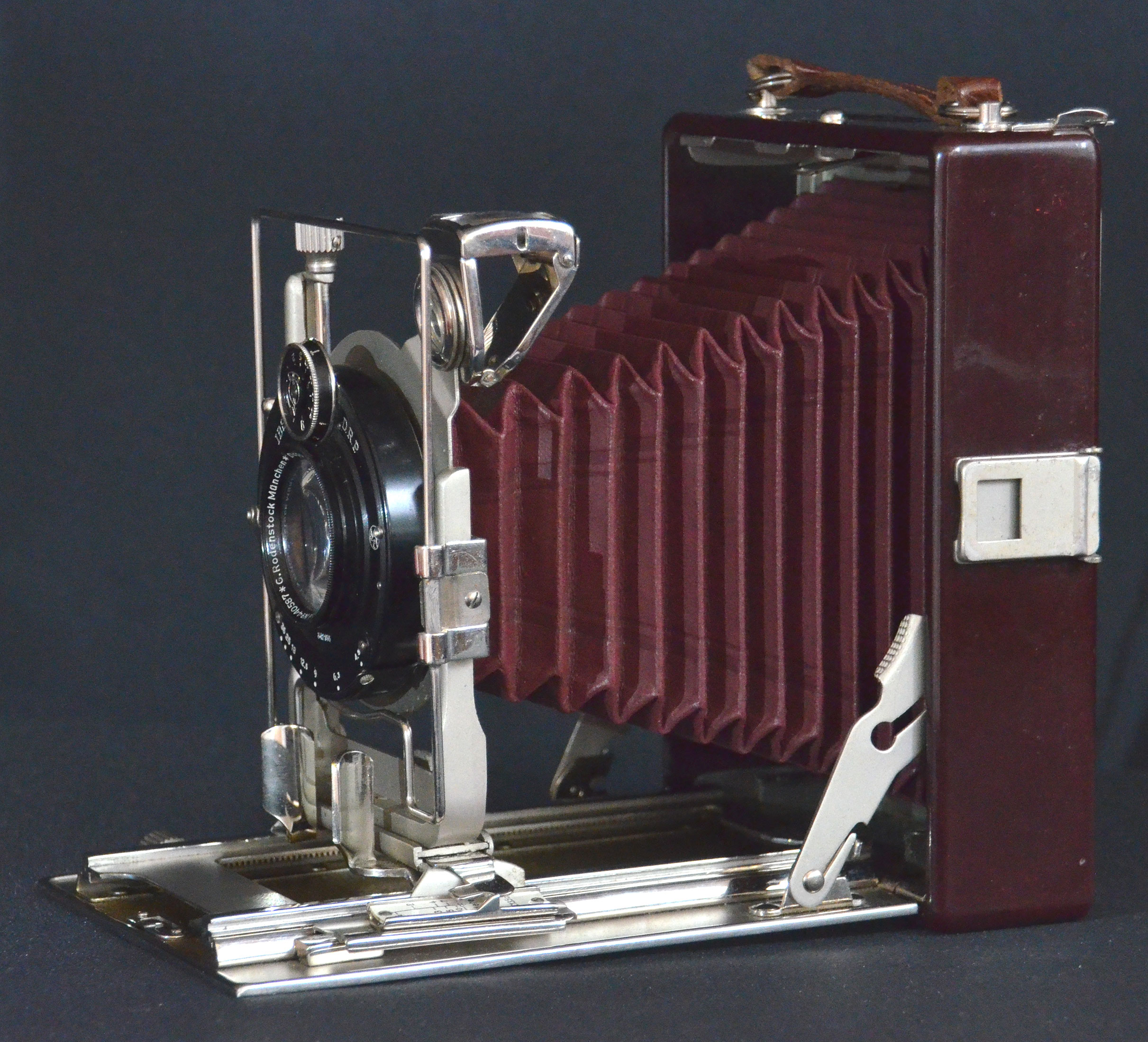 Die Kamera wurde in den Formaten 9x12 und 6,5x9 angeboten. Es gab drei Modellvarianten: mit schwarzem Bakelitgehäuse mit silberfarbenen Metallteilen, mit mahagonifarbigem Bakelitgehäuse mit silberfarbenen Metallteilen und mit mahagonifarbigem Bakelitgehäuse mit goldfarbenen Metallteilen. Das vorliegende Exemplar ist in dieser Beziehung ein wenig ein Zwitterwesen, denn die Kamera besitzt an sich silberfarbene Metallteile, aber der Laufboden ist teilweise goldfarben lackiert.