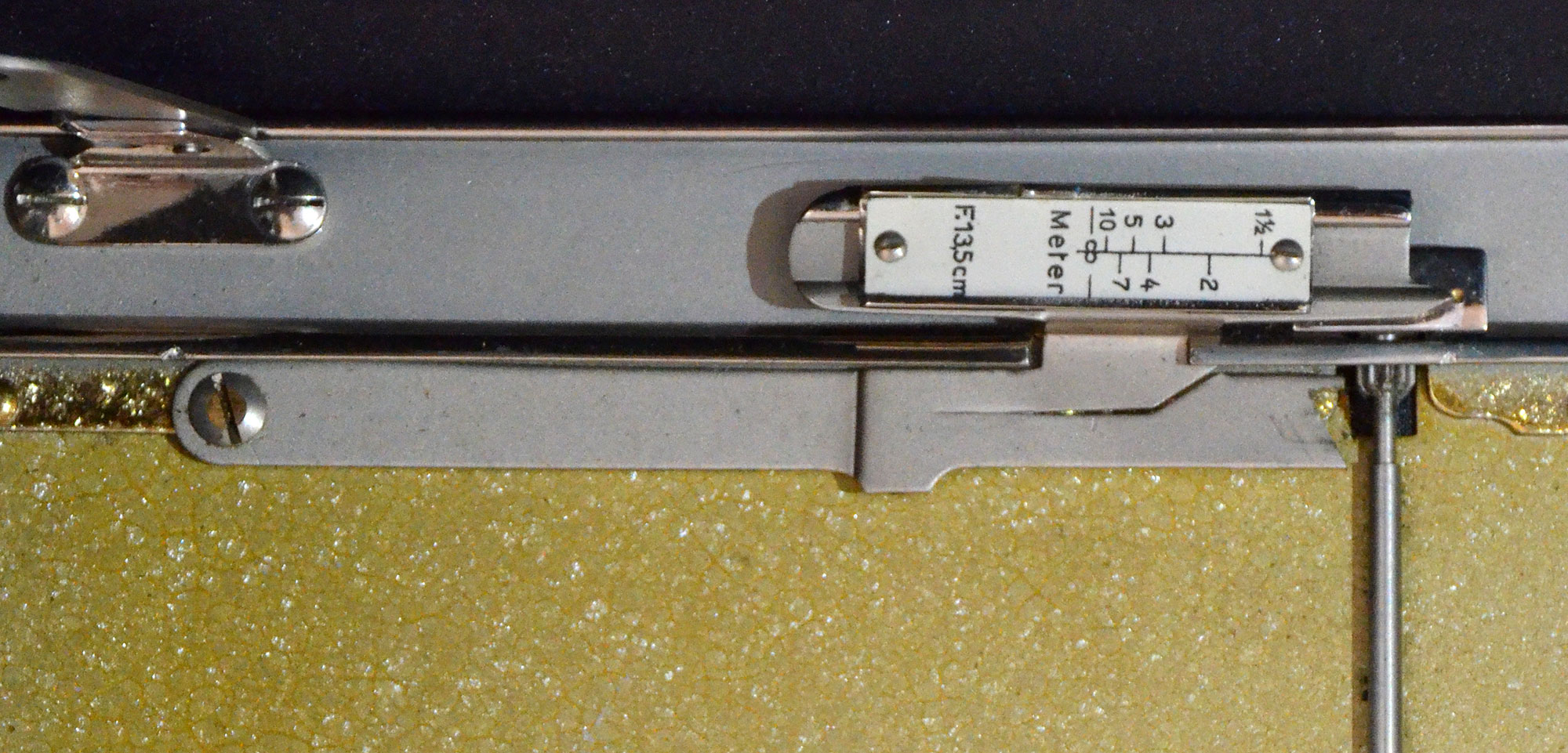 Die Phönix-Bakelit ist mit einem patentierten Unendlichkeitsanschlag ausgestattet. Rein praktisch bedeutet das, dass der Unendlichanschlag durch die Vorwärtsbewegung des Schlittens automatisch entriegelt wird. Das Patent wurde am 28. September 1929 erteilt und am 4. Februar 1932 veröffentlicht für die „Schmitz und Thienemann Camerafabrik in Tharandt“. Schmitz und Thienemann waren seit 1. Januar 1930 Gesellschafter der Merkelschen Firma (vgl. dazu den Artikel in Photo Antiquaria Nr. 152). Anbei eine Abbildung der Patentzeichnung und ein Blick auf den Mechanismus bei abgenommenem Schlitten.