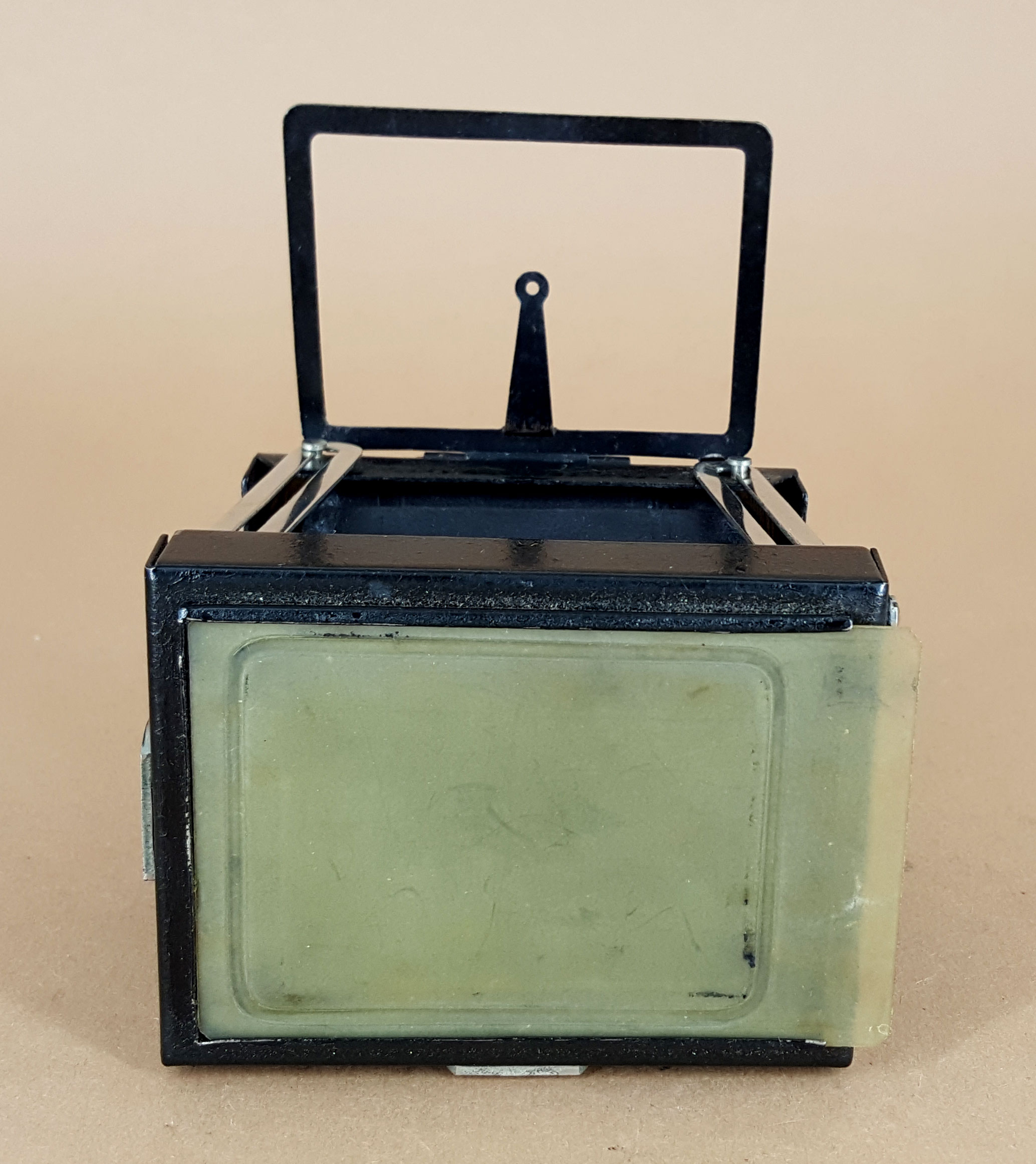 Wenn man die Lux nur flüchtig frontal betrachtet, könnte man fast meinen, eine Ernemann Liliput vor sich zu haben. Da wurde vielleicht auch bisschen abgekupfert. Bei genauerer Betrachtung werden natürlich die Unterschiede offensichtlich. Der wesentliche und augenscheinliche Unterschied ist die außenliegende Spreizenkonstruktion. Außerdem besitzt die Lux frontseitig zwei markante Handhaben zum Aufziehen der Kamera in die Aufnahmeposition. Man findet die Kamera in zwei verschiedenen Varianten. Die wahrscheinlich ältere Variante hat im Gegensatz zum hier gezeigten Exemplar einen Rahmensucher aus gedrehtem Draht und etwas anders geformte schwarze Stativgewinde.
