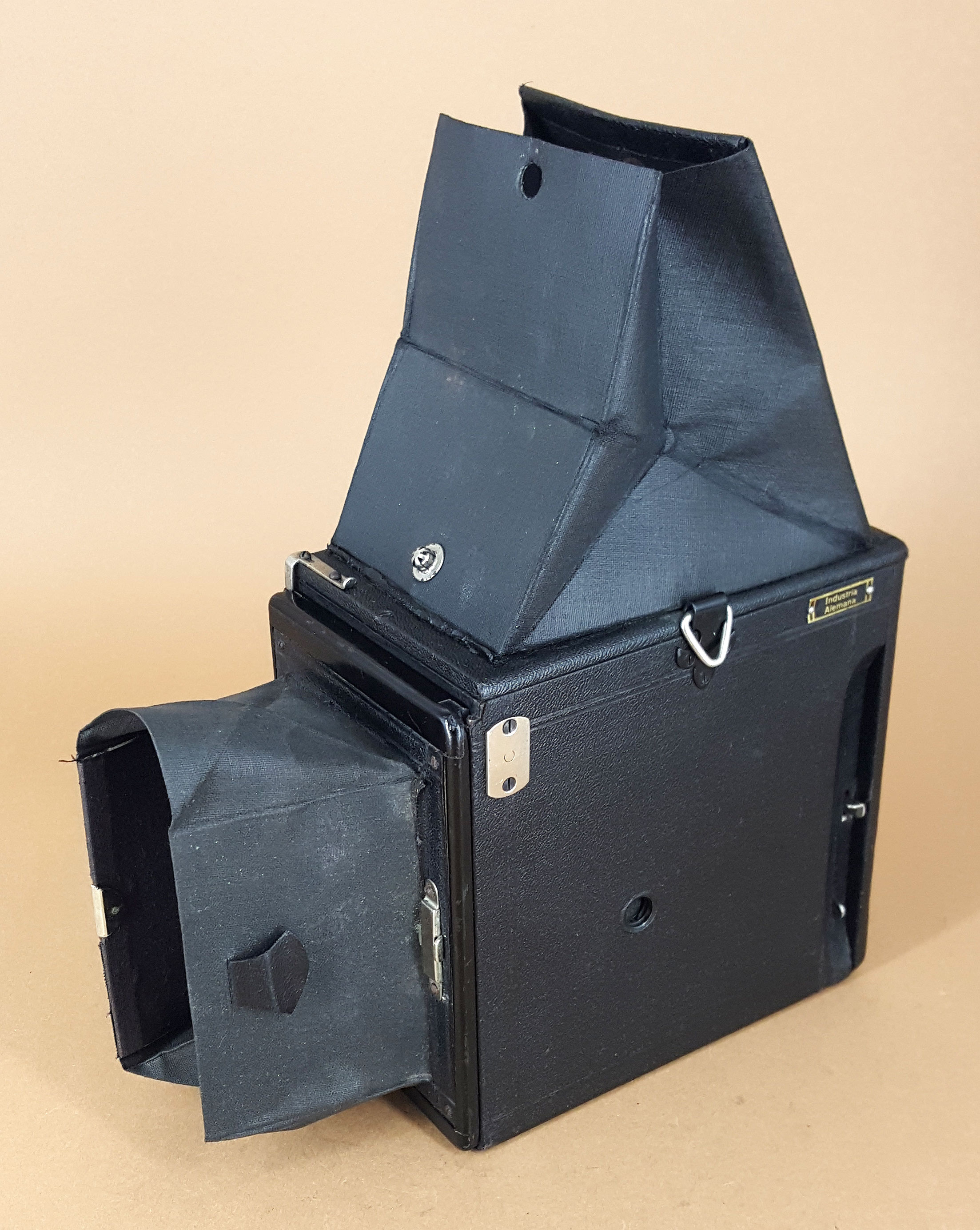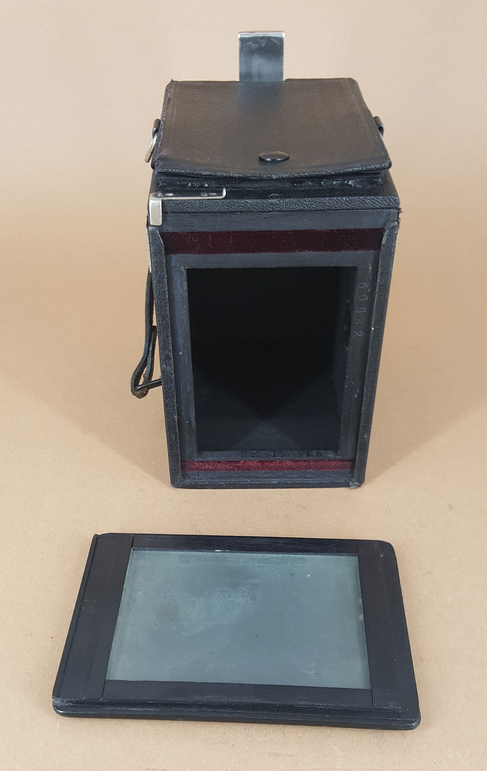 Plattenboxen hatten oft den "Makel" der eingeschränkten Motiv-Betrachtung. Heckmattscheiben waren entweder nur auf einem hohen Stativ halbwegs bequem einzusehen, sonst war bei Stativbetrieb nicht selten eine gebückte Haltung des Fotografen die Folge. Oder man nahm die Kamera hoch 30 cm vor das Gesicht. Dann Mattscheibe weg, Platte ran, Foto machen.