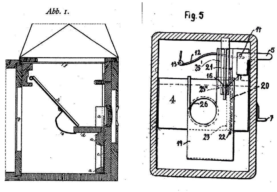 Gut erläutert ist die Funktion des Verschlusses auf dieser Seite: http://www.camarassinfronteras.com/ihage..._plan_paff.html , die auch mal einen Blick in den Guillotine-Verschluss erlaubt. Für diese Kamera finden sich (soweit ich das erkennen kann) zwei Patente im Netz. Zum einen ein deutsches Patent (Nr. DE342575) für den Spiegelmechanismus, wobei hier zunächst ein Verschluss hinter dem Objektiv vorgesehen war. Und weiterhin gibt es ein englisches Patent (Nr. GB180350), dass auch den Guillotine-Verschluss und dessen Kopplung mit dem inneren Schieber und dem Spiegel beinhaltet. Ein deutsches Patent habe ich für diese Kopplung mit dem Guillotine-Verschluss nicht gefunden. Hier zwei Zeichnungen aus den deutschen Patent und dem englischen Patent.