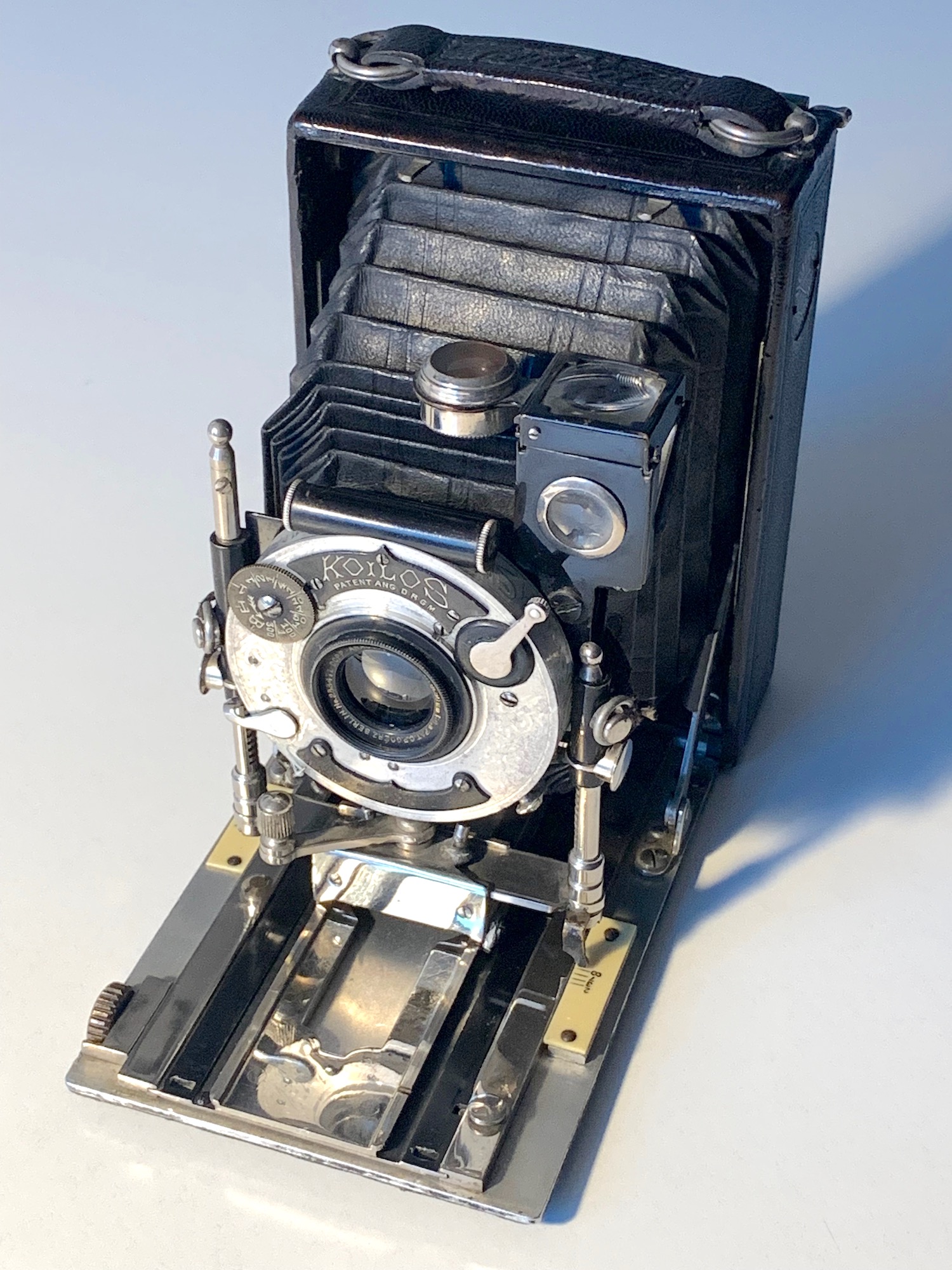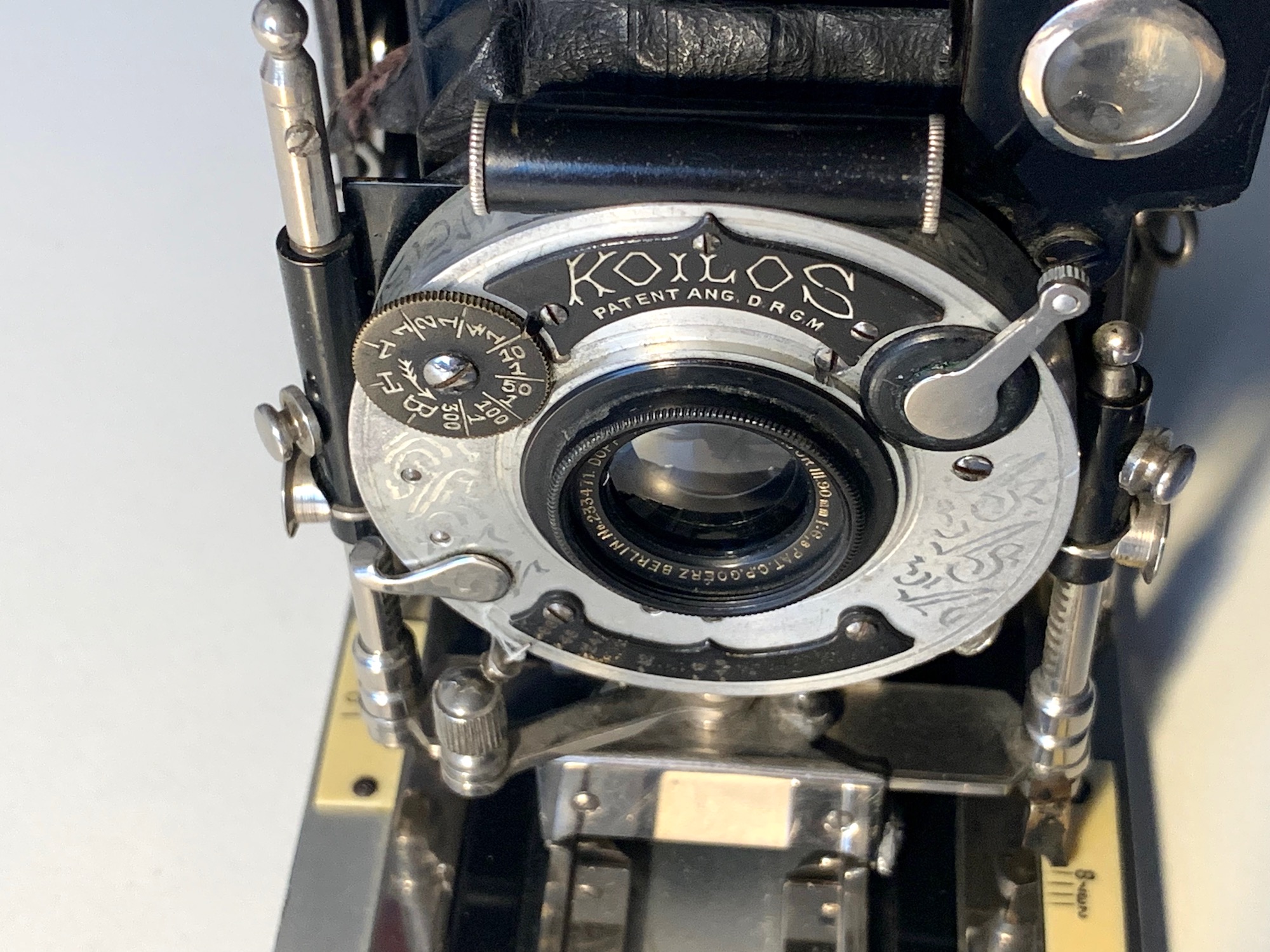 Bestückt ist das vorliegende Exemplar mit einem vergleichsweise kurzbrennweitigen Goerz Dagor 6,8/90 in Koilos (1–1/300). Der Verschluss besitzt das alte Design mit heller Front und ziselierten Ornamenten; der Kolben trägt seitlich das Kenngott-Zeichen (Anker).