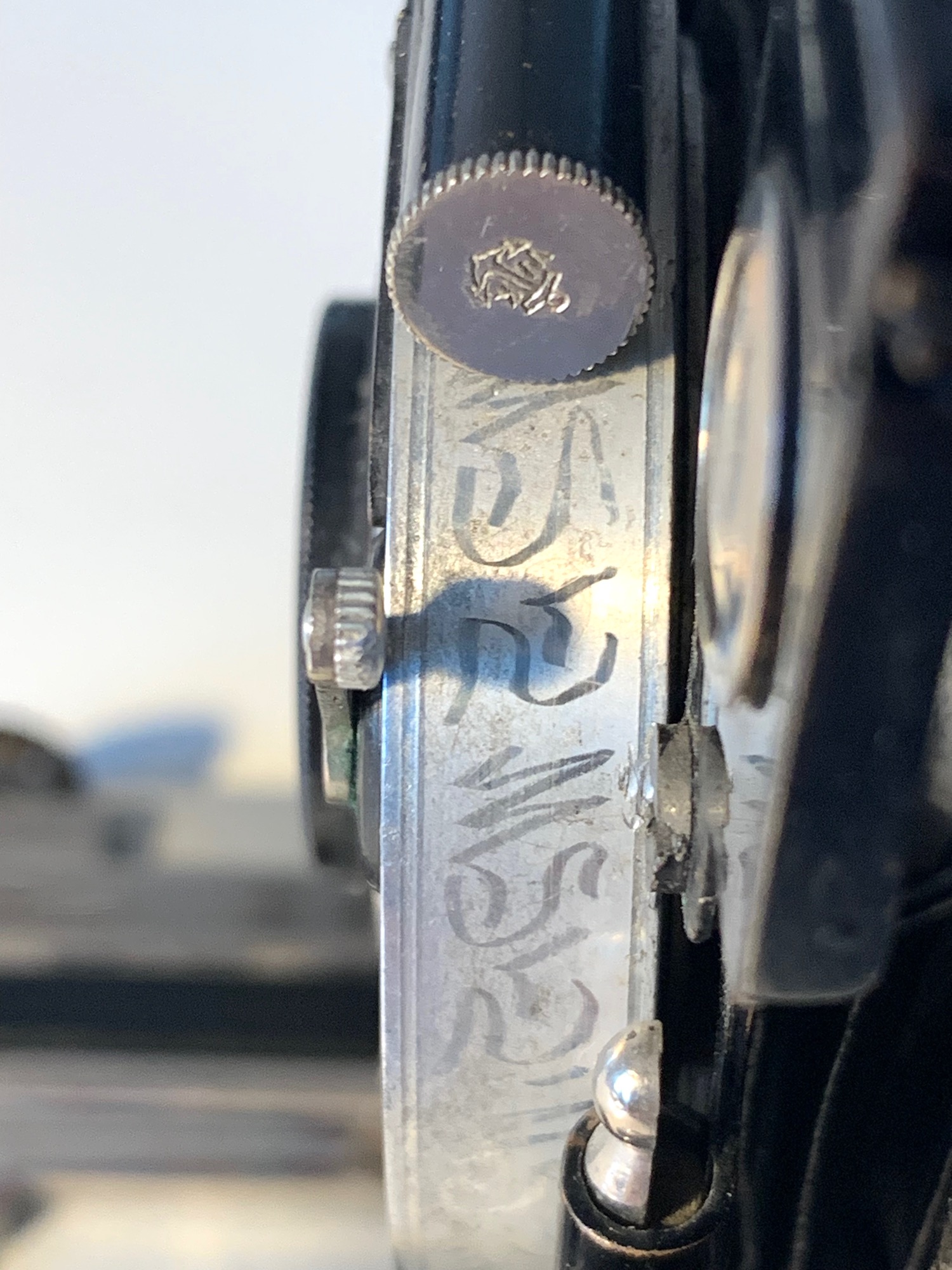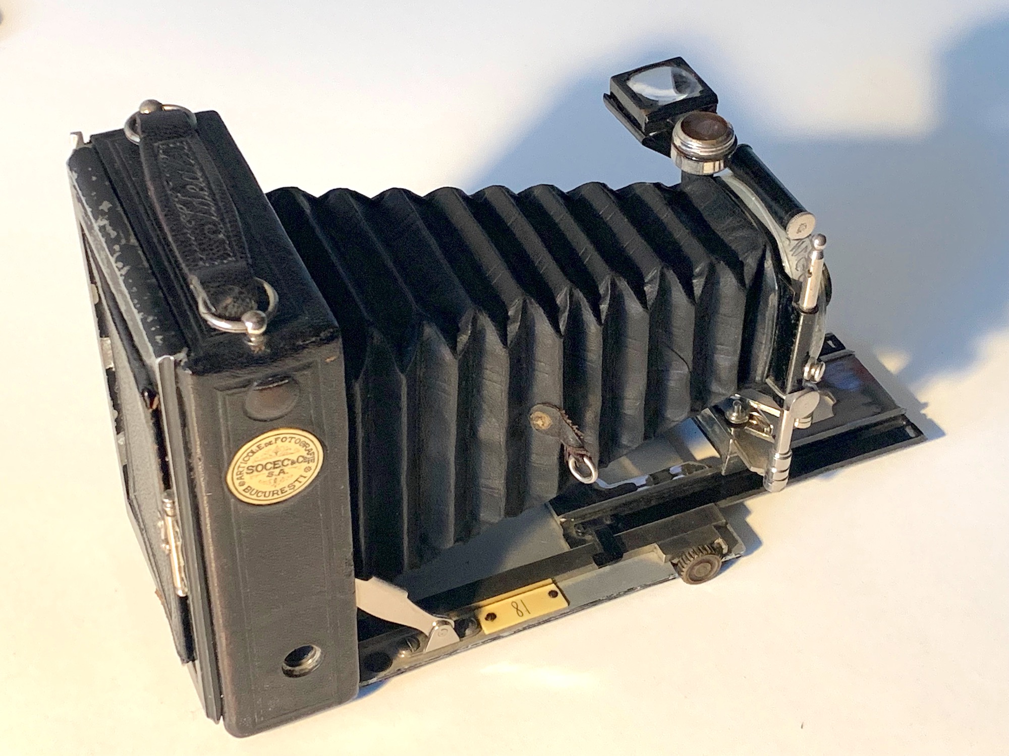 Der Schlitten wird mit einer Drehbewegung durch den kurbelförmigen Hebel in der Mitte arretiert. Der doppelte Auszug wird durch einen Knopf am vorderen Ende freigegeben; die Schienen rasten an der zweiten ∞-Position (bei Verwendung der Hinterlinse) ein. Das Objetkivbrett kann horizontal und vertikal verschoben werden. Der Balgen wird verkürzt, indem die an Lederriemen befestigten Ringe an der Standarte eingehängt werden; es sind noch keine automatischen Balgenspanner wie bei späteren Modellen.
