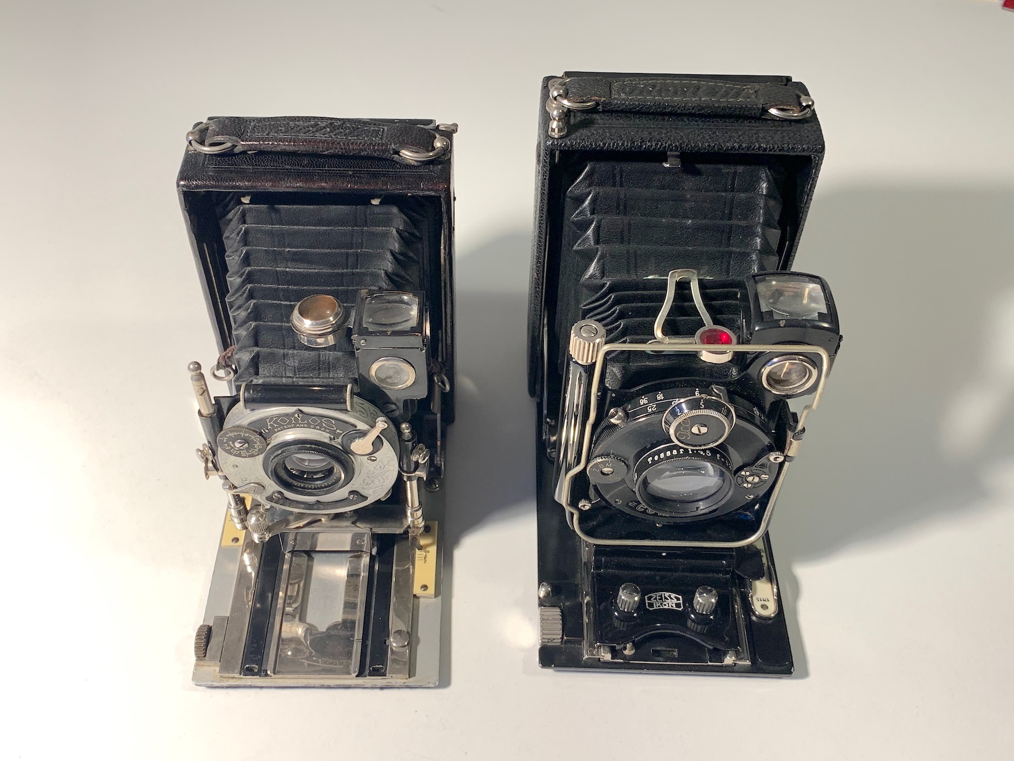 Hier zum Vergleich die Hüttig Mod. 1907 mit ihrer Enkelin, der Ica/Zeiss Ikon Ideal 111 von 1927 (Übergangsmodell mit Ica- und Zeiss Ikon-Beschriftung).