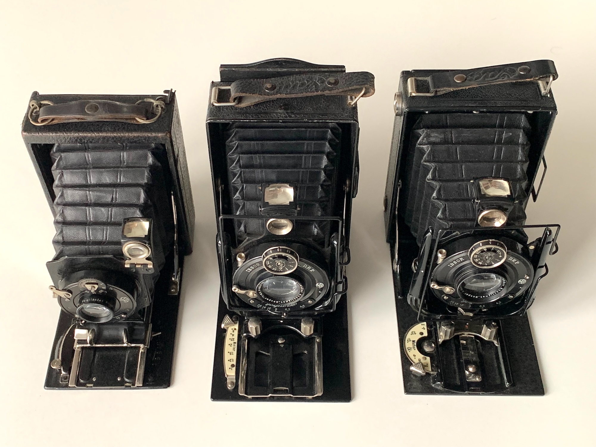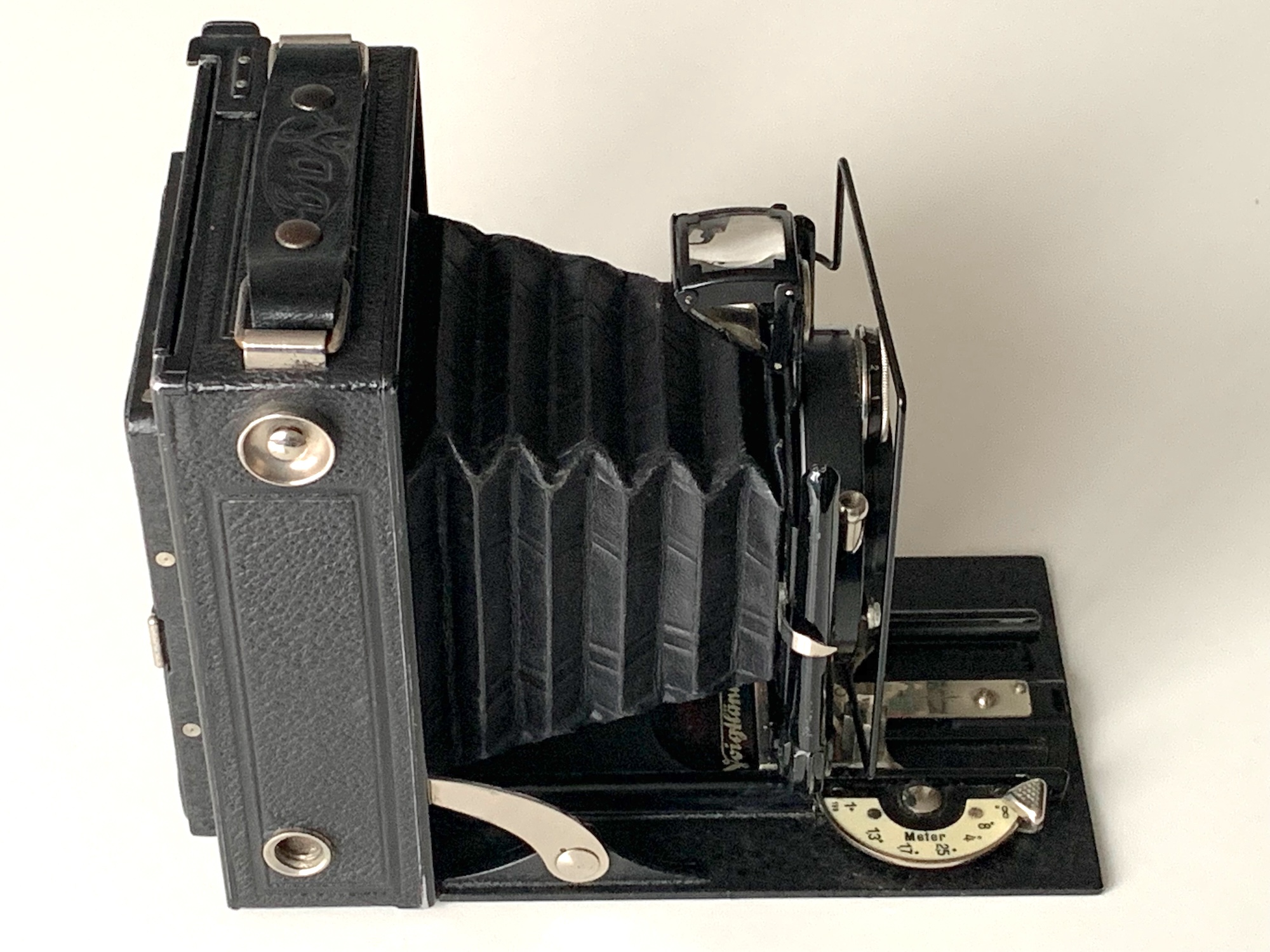 unter der Bezeichnung VAG (Voigtländer AG) bot Voigtländer in den Formaten 9x12 und 6,5x9 eine Reihe einfach ausgestatteter Plattenkameras an, allesamt mit einfachem Auszug und Radialhebel-Verstellung. Das erste Modell im Format 6,5x9 erschien 1924; es besitzt ein Holzgehäuse, die Standarte ist nicht verstellbar (--> https://blende-und-zeit.sirutor-und-comp...&thread=275). 1926 folgte das verbesserte 2. Modell, jetzt im Aluminiumgehäuse und mit vertikal und horizontal verschiebbarer Standarte ausgestattet; seit 1928 gehörte ein Rahmensucher zur Ausstattung. Auch diese Kamera wurde im Forum bereits vorgestellt (--> https://blende-und-zeit.sirutor-und-comp...mp;thread=215#4).