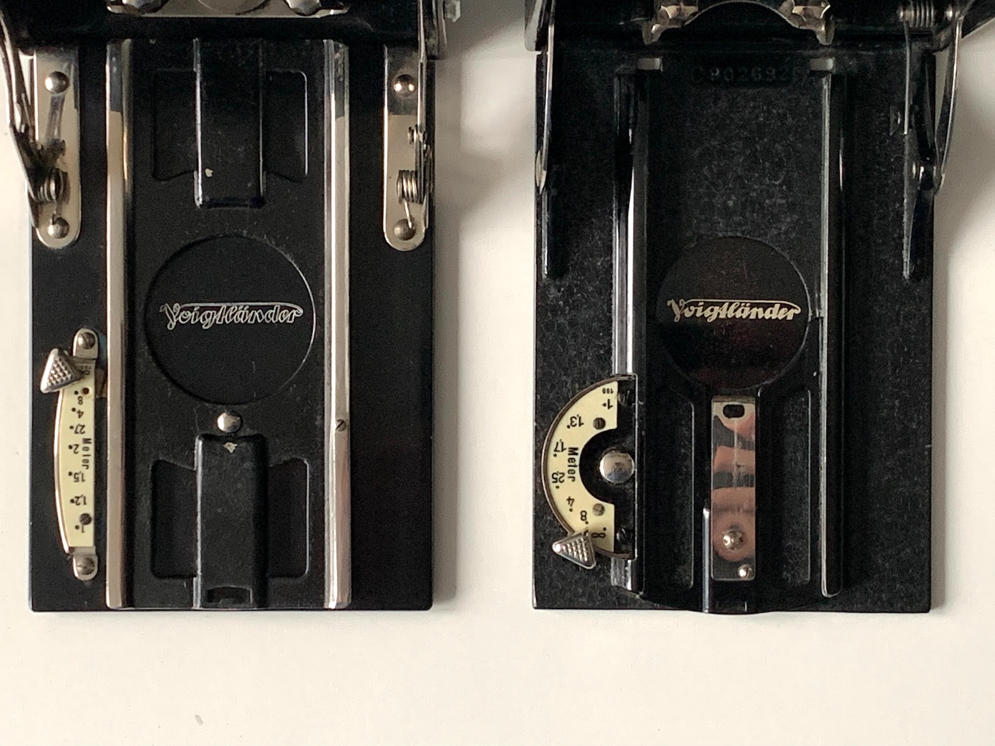 Auch äußerlich wurde das Gehäuse aufgewertet, es bekam einen seitlichen Öffnungsknopf mit Metallfassung wie die Bergheil sowie die voigtländertypische Schärfentiefentabelle auf der anderen Seite. Wie schon beim zweiten Modell kann die Standarte seitlich verschoben werden, arretiert wird sie mit einer Feststellschraube. Die vertikale Verstellung des Objektivbretts erfolgt durch einfaches Verschieben.