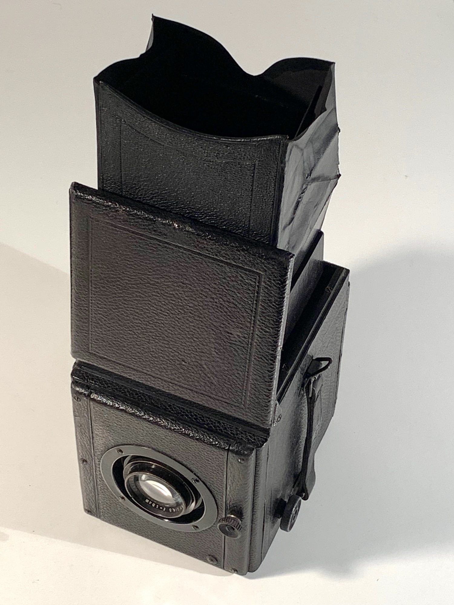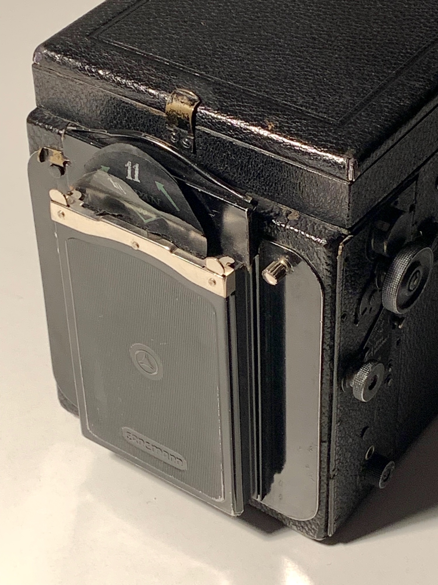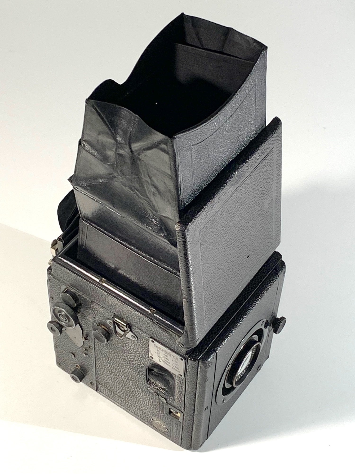 Die Fokussierung erfolgt durch Ausfahren des beidseitig geführten Vorderteils mittels Zahnstangentrieb. Über eine Skala im Fenster auf der rechten Seite kann die Entfernung abgelesen werden, die kürzeste Einstellentfernung beträgt etwa 0,6 m. Bei einer Spiegelreflex arbeitet man aber zweckmäßigerweise mit der Mattscheibe. Ein recht imposanter Lichtschacht lässt sich entfalten, wenn man die obere Klappe öffnet. Auch wenn der Spiegel schon etwas angegriffen ist, hat man doch noch immer ein erfreulich großes und – zumindest bei weit geöffneter Blende – ein gut sichtbares Sucherbild. Unter der quadratischen Mattscheibe befinden sich Markierungen für die Formatbegrenzungen.