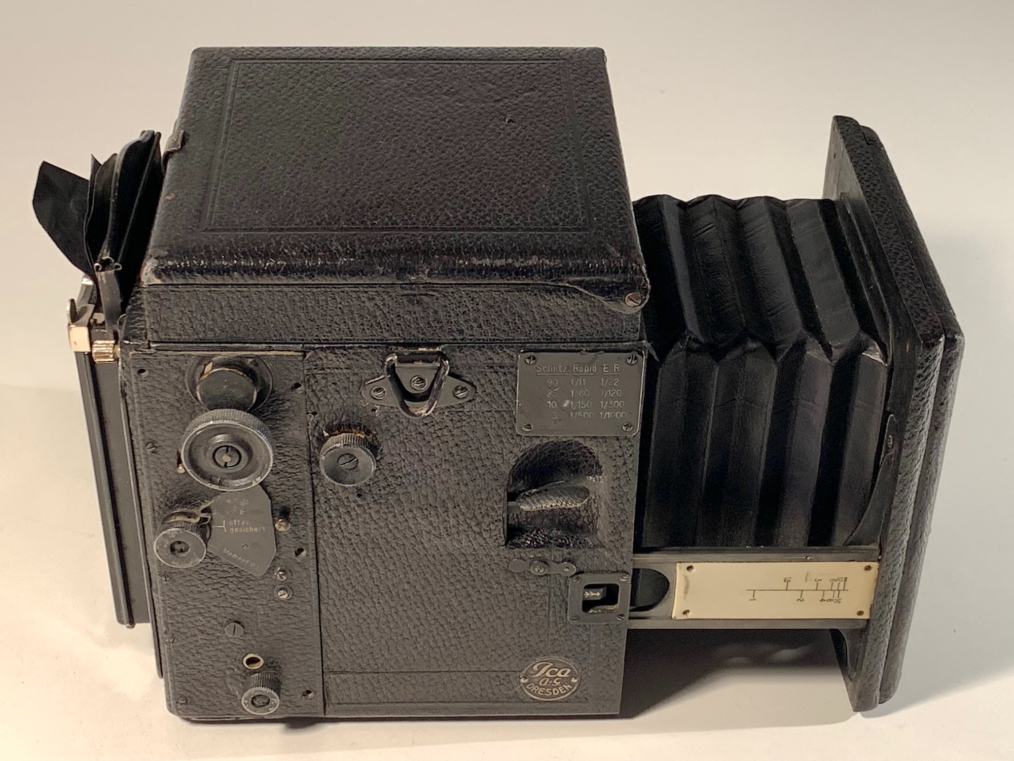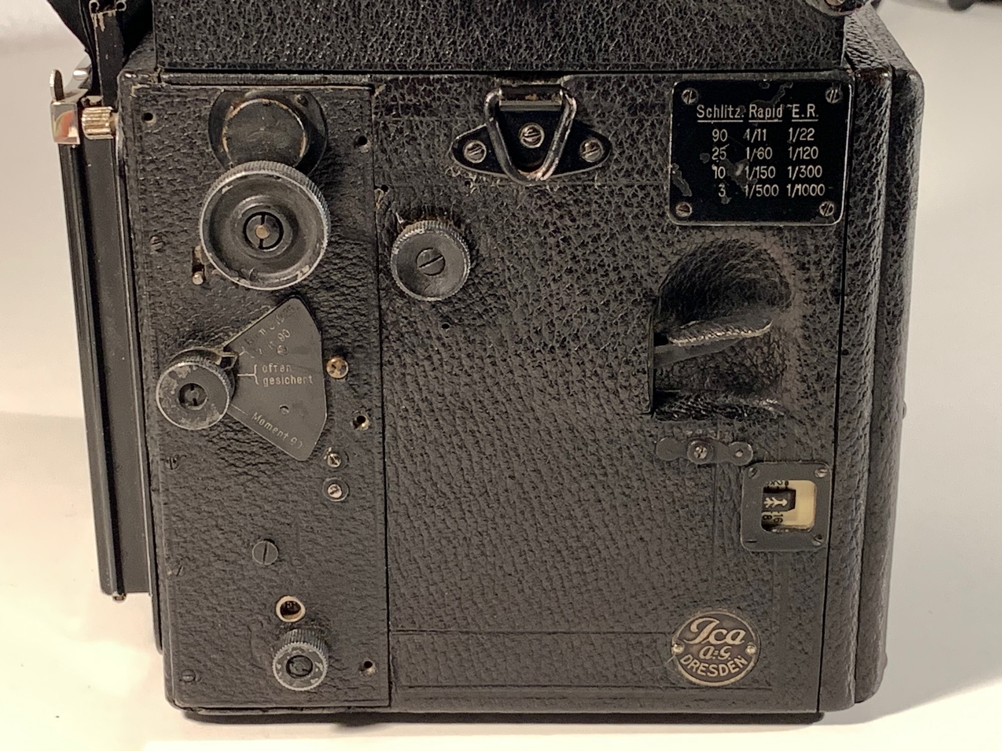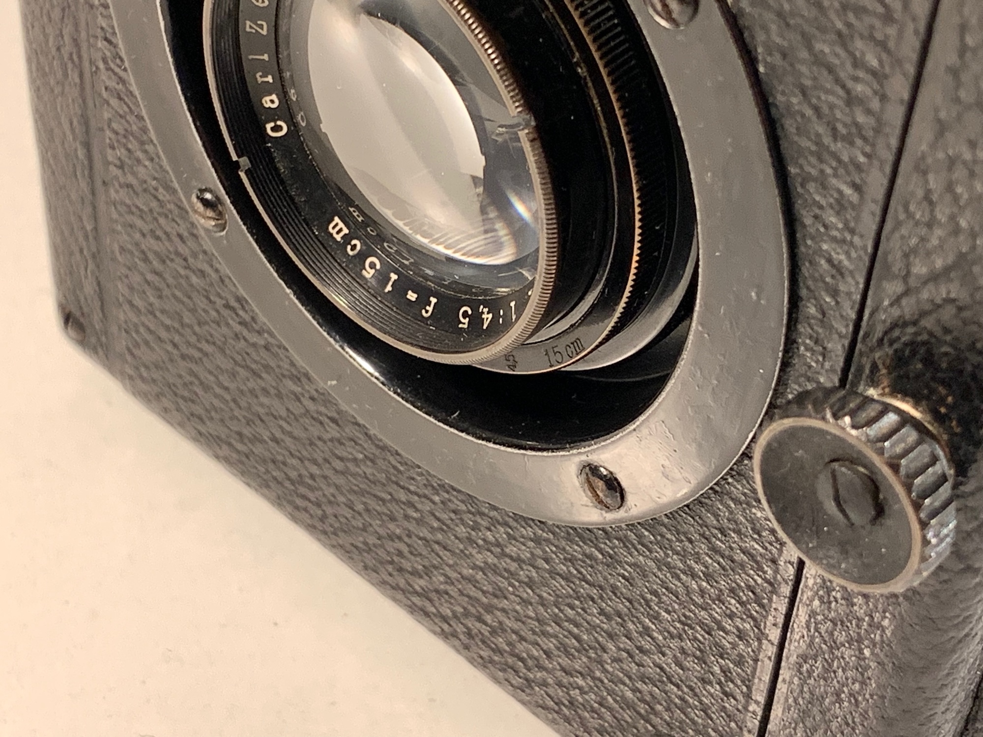 Verbaut ist ein Tessar 4,5 mit der für eine 6,5x9 vergleichsweise langen Brennweite von 15 cm. Das ist tatsächlich die standardmäßige Ausstattung der Kameras in diesem Format. Das hat zunächst technische Gründe, denn aufgrund der quadratischen Bauform ergibt sich eine längere Diagonale des Spiegels. Die lange Brennweite dürfte aber auch den Bedürfnissen der Zielgruppe einer solchen Kamera entgegenkommen; der Ica-Katalog 1925 warb für das Modell folgendermaßen: „Für Berichterstatter und Sportsleute sind diese Apparate ein unentbehrliches Hilfsmittel."