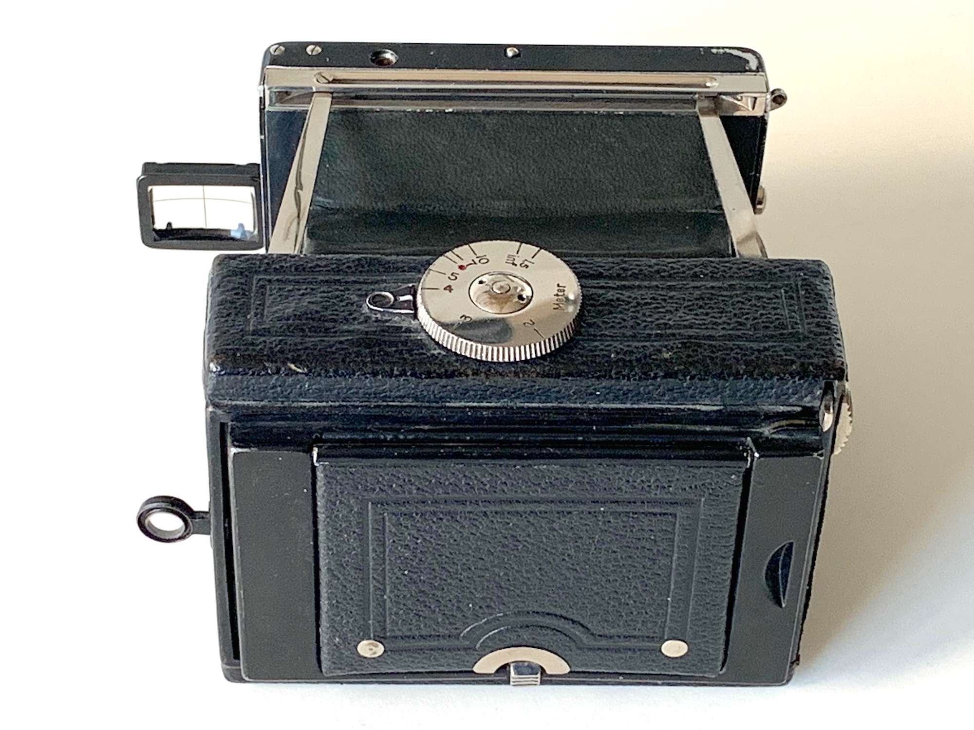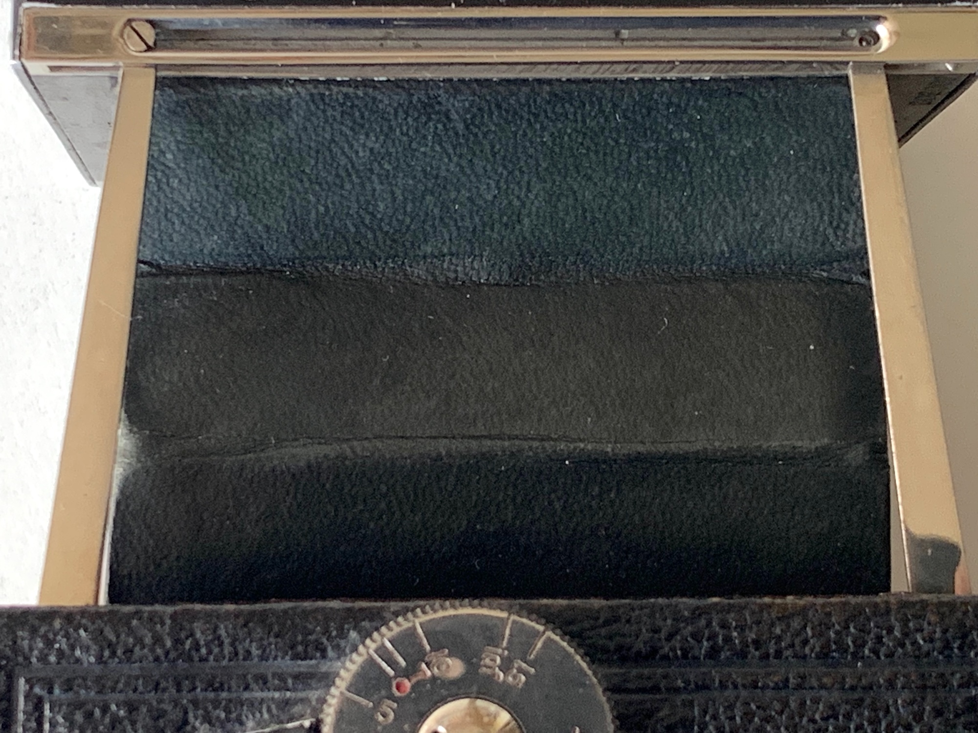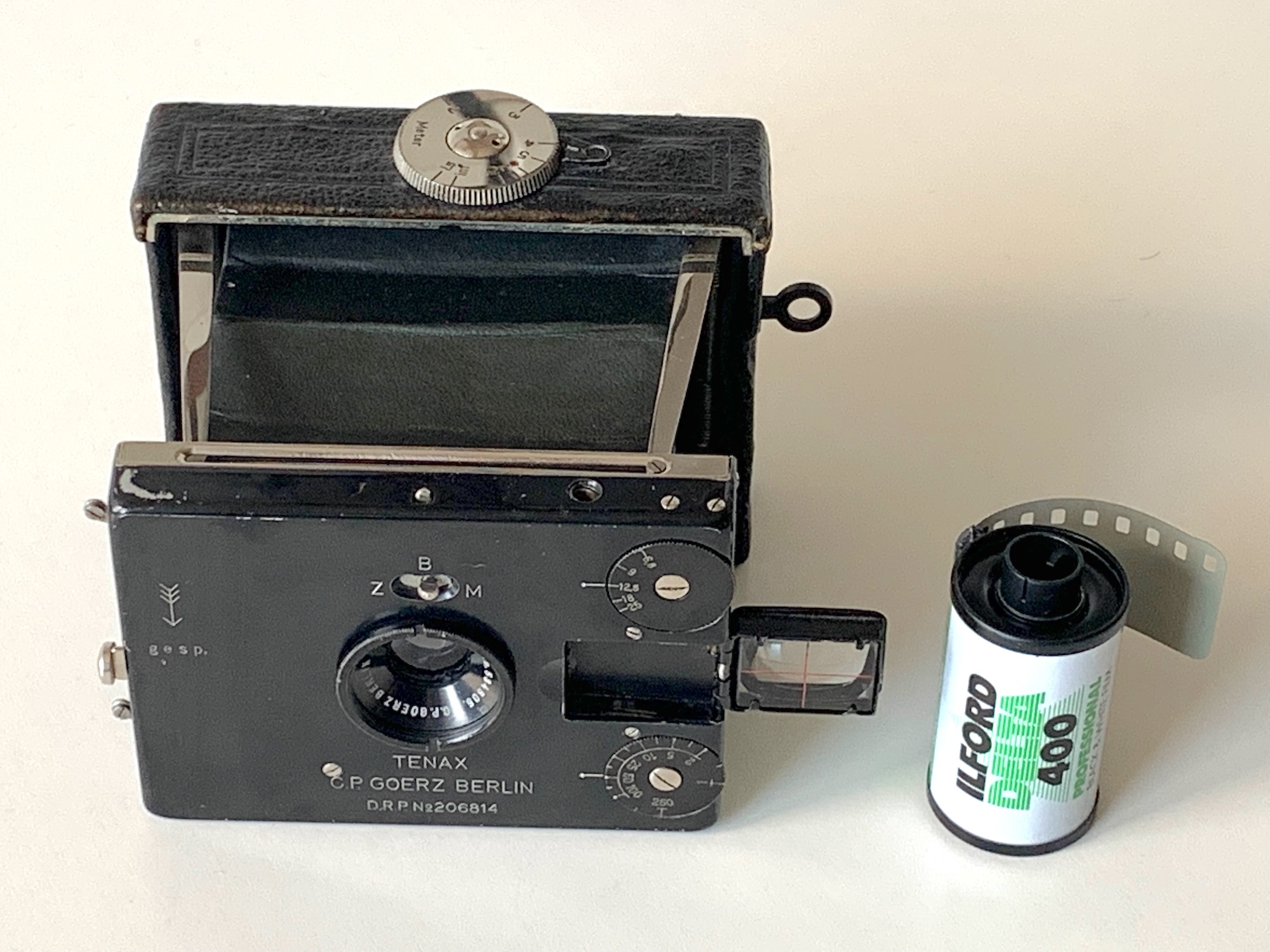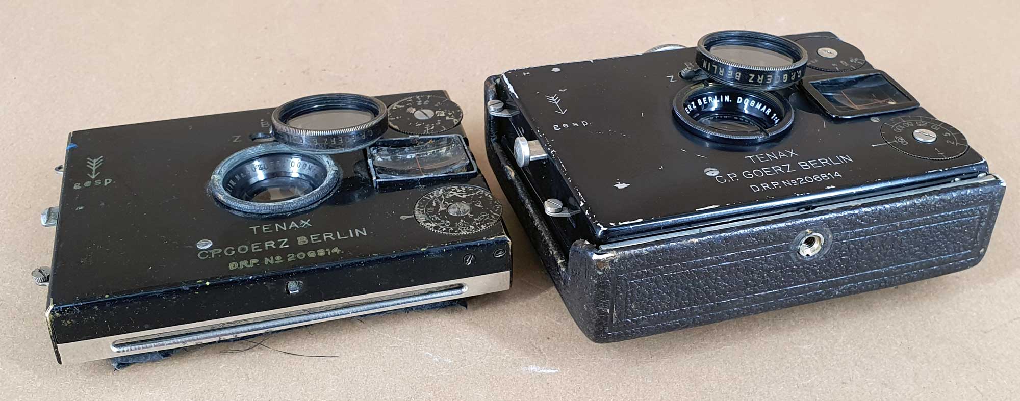 Zu den möglichen Objektivbestückungen hat der Jan schon einiges geschrieben. Das Dagor 6.8/7,5 cm war von Beginn an das Standartobjektiv der Kamera. Wenig später kamen diverse Auswahlmöglichkeiten an Objektiven hinzu. Im Zeiss Ikon Katalog von 1927 findet sich das Dogmar 3.5 als beste Objektivbestückung und dieses Objektiv wurde wohl als einziges mit einem Compur-Verschluss geliefert. Das vorliegende Exemplar ist mit einem Goerz Dogmar 4.5/7,5 cm ausgestattet. Vor dem Objektiv befand sich bei Lieferung eine aufgeschraubte Vorsatzlinse, wobei mir unklar ist, wozu diese Linse dient. Die Linsenbeschriftung lautet „G.P. GOERZ BERLIN“ und „1/3“. Vor geraumer Zeit hatte ich bei einem Konvolut ‚Kameraschrott‘ das Vorderteil einer Westentaschen-Tenax mit dabei. Dieses Teil ist ebenfalls mit einem Dogmar 4.5 ausgestattet und davor befindet sich exakt die gleiche Vorsatzlinse. In Kataloganzeigen findet sich der Hinweis, dass die Filmpackkassette zur Westentaschen-Tenax zusammen mit einer Vorsatzlinse geliefert wurde. Eventuell ist es ja diese?