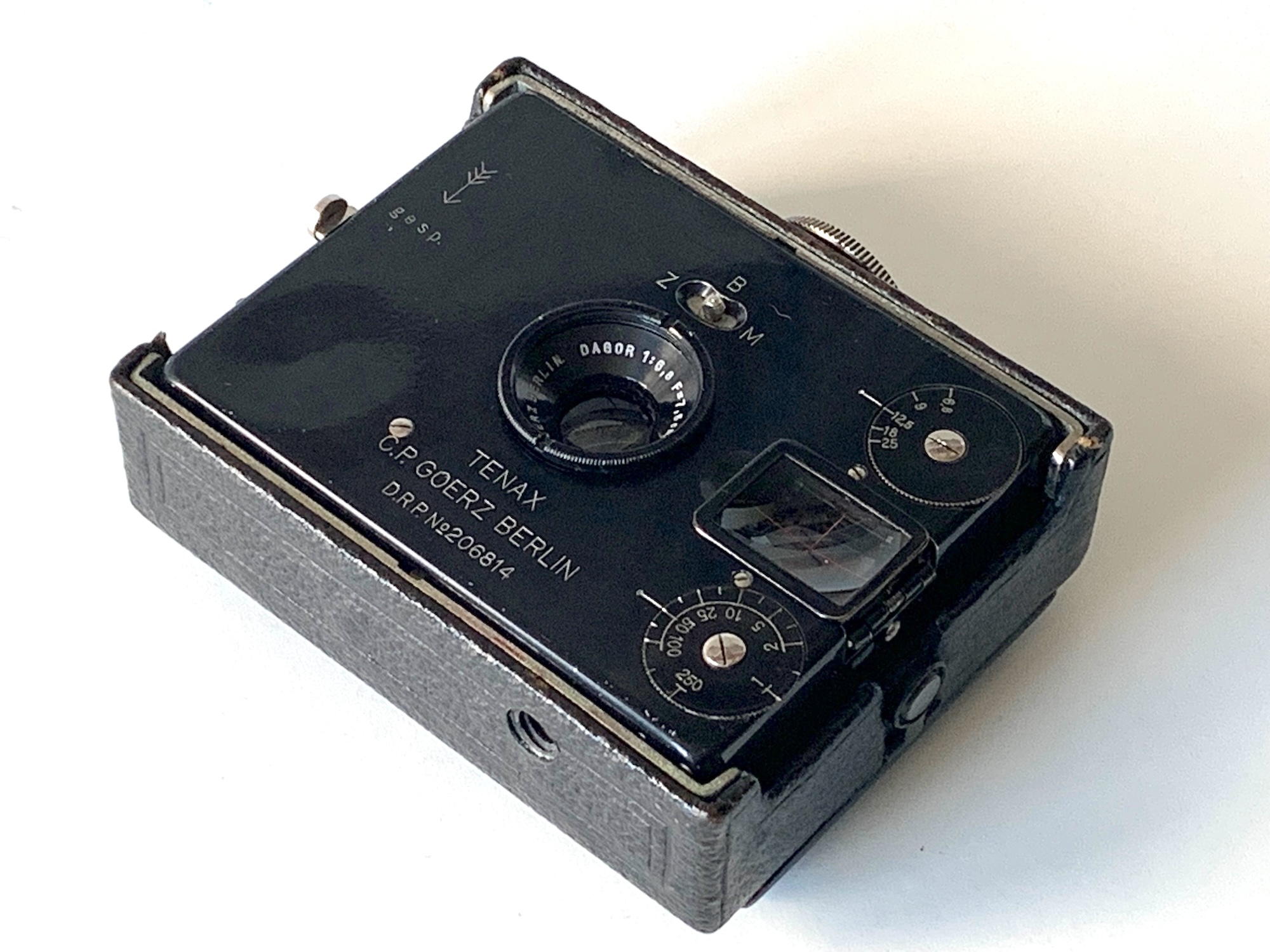 Das vorliegende Exemplar ist mit einem Goerz Dagor 6,8/75 in überbautem Compound 1–1/250 ausgestattet. Die Kamera wurde auch mit anderen Objektiven, wie dem preiswerten Syntor oder dem lichtstärkeren Celor 4,8 angeboten. Das Objektiv dürfte gemäß Seriennummer 1922–23 hergestellt worden sein, es handelt sich um ein späteres Exemplar. 1926 wurde das Modell noch ins Programm von Zeiss Ikon übernommen, aber schon 1927 wieder eingestellt. Die Nachfrage nach kleinen Plattenkameras ging zu dieser Zeit schon zurück, und Zeiss Ikon hatte mit der Neukonstruktion der Bébé 342 ein anderes Modell in diesem Segment (--> https://blende-und-zeit.sirutor-und-comp...mp;thread=196#2).
