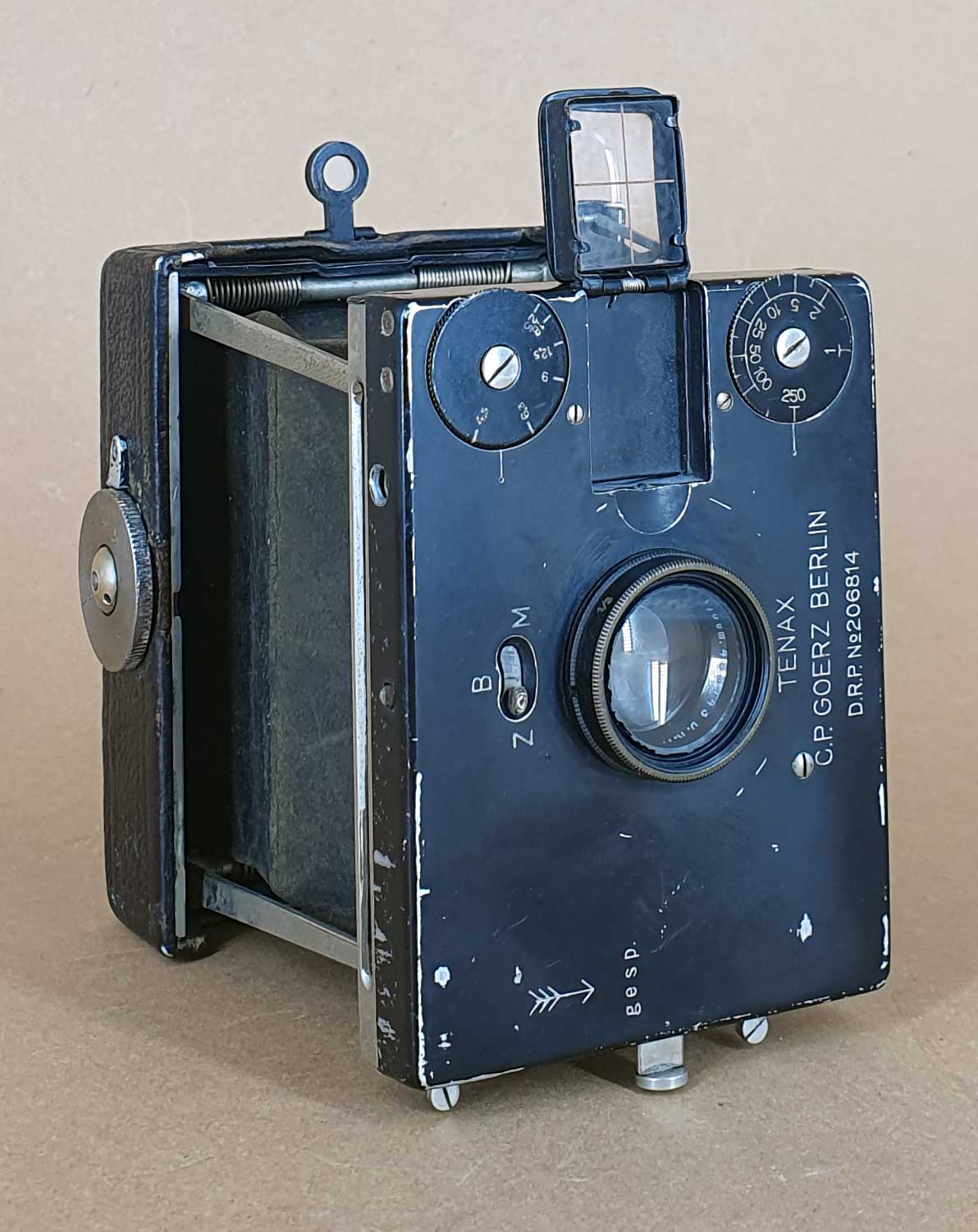 kleine Plattenkameras im Format 4,5x6 sprechen mich besonders an. Zu ihnen gehört auch die Westentaschen-Tenax von C. P. Goerz (Berlin), eine Spreizenkamera. Sie gehört zu einer Reihe von Tenax-Spreizenkameras, die seit etwa 1909 in den Formaten 4,5x6, 6,5x9 und 4,5x10,7 (Stereo; --> https://blende-und-zeit.sirutor-und-comp...5&thread=35) gebaut wurden.
