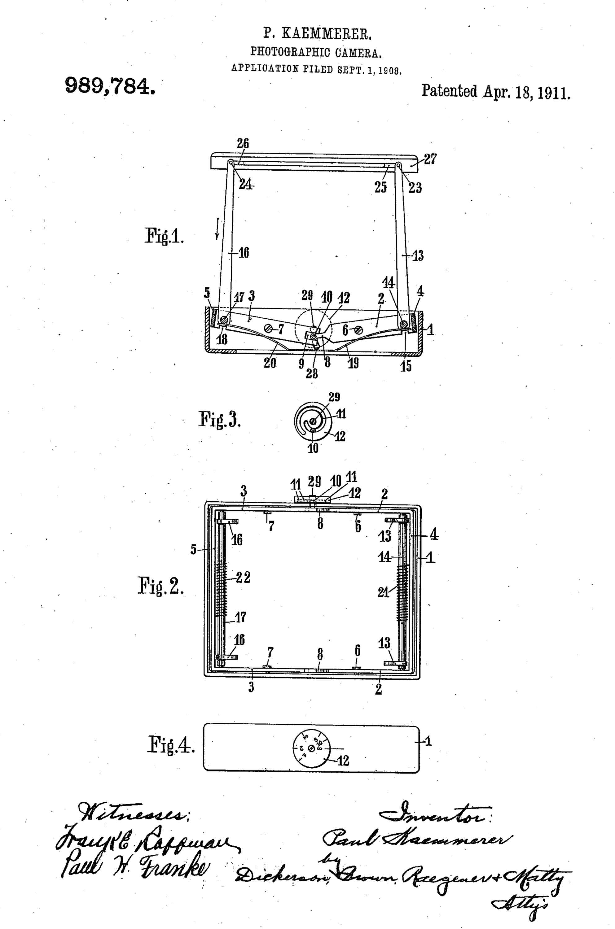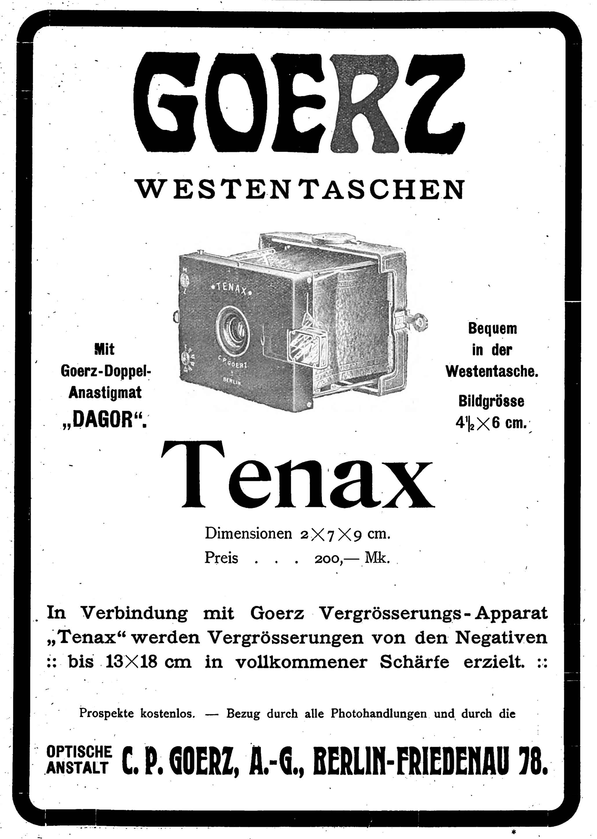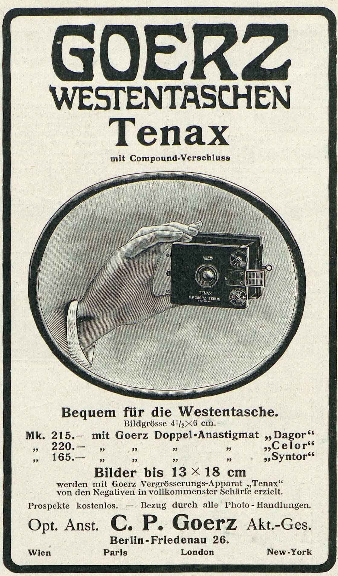 Die Westentaschen-Tenax kam wahrscheinlich in der zweiten Hälfte des Jahres 1908 auf den Markt und war zu diesem Zeitpunkt die erste Kamera dieser Konstruktion. Die Fachpresse berichtete ausführlich von diesem Apparat, „der nicht etwa nur seiner Kleinheit und seiner genialen Konstruktion wegen als Neuheit anzusprechen ist, sondern weil wir mit der Westentaschenkamera auch schwierigere photographische Aufgaben spielend leicht lösen können.“ (Photogr. Rundschau, 1908, Heft 23) Es findet sich auch ein entsprechendes Patent zu dieser innovativen Kamera – die Patentnummer ist frontseitig auf der Kamera eingraviert (außer bei den ganz frühen Exemplaren). Das Patent datiert bereits auf den 13. September 1907. Beim US-Patent erfahren wir auch den Namen des Erfinders. Das US-Patent beantragte am 1. September 1908 der Goerz-Ingenieur Paul Kämmerer (als Erfinder).
