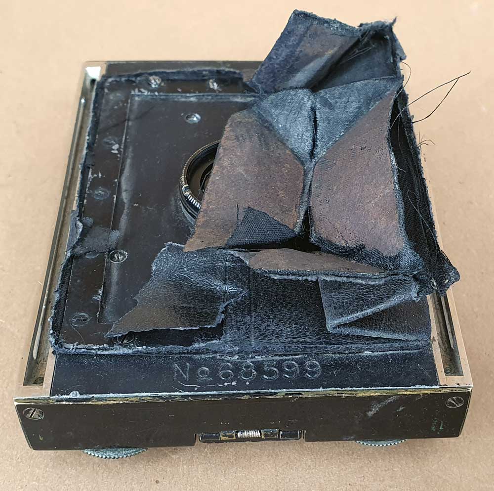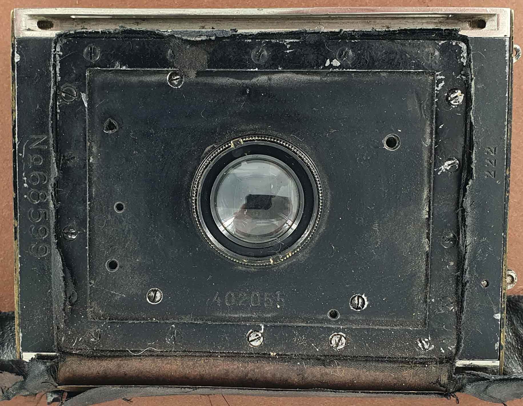 An der Kamera finden sich diverse Nummern, die ich nicht alle zuordnen kann. Die einfachste ist sicher die Seriennummer des Objektivs (483xxx), die die Kamera ungefähr um 1921/22 datiert. (Das einzelne Vorderteil hat die Objektivseriennummer 402xxx, was um 1920 datiert). Auf der Rückseite des Vorderteils findet sich unter der Hinterlinse die sechsstellige Nummer 483443 (beim einzelnen Vorderteil 402055). Das könnte eventuell die Compound-Seriennummern sein? Das Mattscheibenrückteil der Kamera weist ebenfalls eine sechsstellige Nummer auf: 124691 (eventuell die Seriennummer der Kamera von Goerz?). Das einzelne Vorderteil weist zusätzlich noch eine fünfstellige Nummer auf der Rückseite auf „No. 68599“, was ebenfalls die Seriennummer der Kamera von Goerz sein könnte?