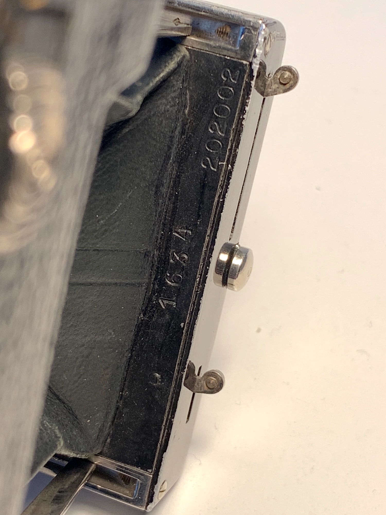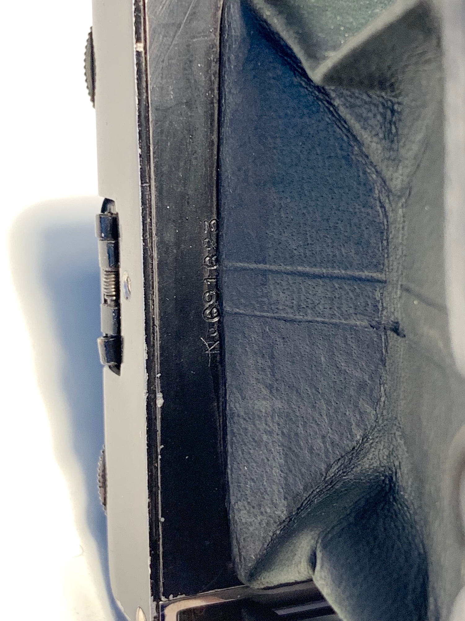 1. Rückseite des Objektivbretts, aus Fotografensicht rechte Seite, oben. Diese Nummer ist identisch mit der auf dem Mattscheibenrückteil, daher habe ich sie als Seriennummer der Kamera identifiziert (2020xx) 2. Ebenfalls Rückseite des Objektivbretts, aus Fotografensicht rechte Seite, Mitte: eine vierstellige Nummer, Ziffern etwas größer (1634). 3. Rückseite des Objetkivbretts, linke Seite Mitte, direkt am Balgen, sehr klein: eine sechstellige Nummer mit vorangestelltem No.: 6916xx. Vermutlich Seriennummer des Compound?