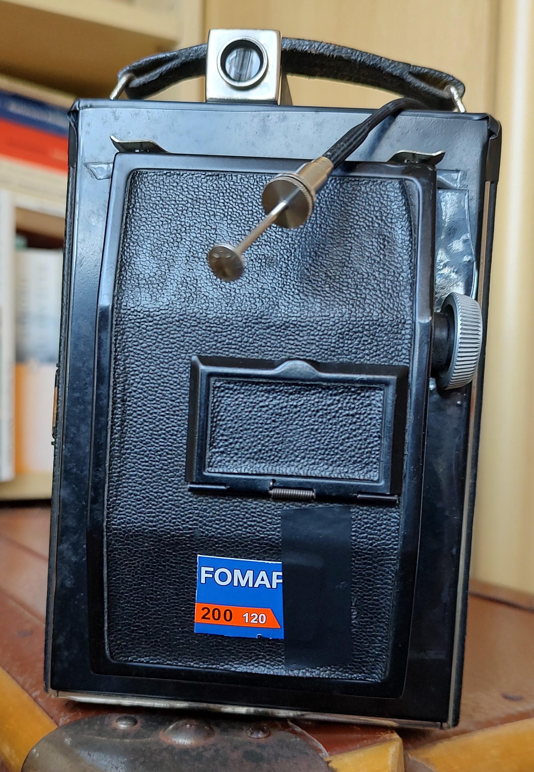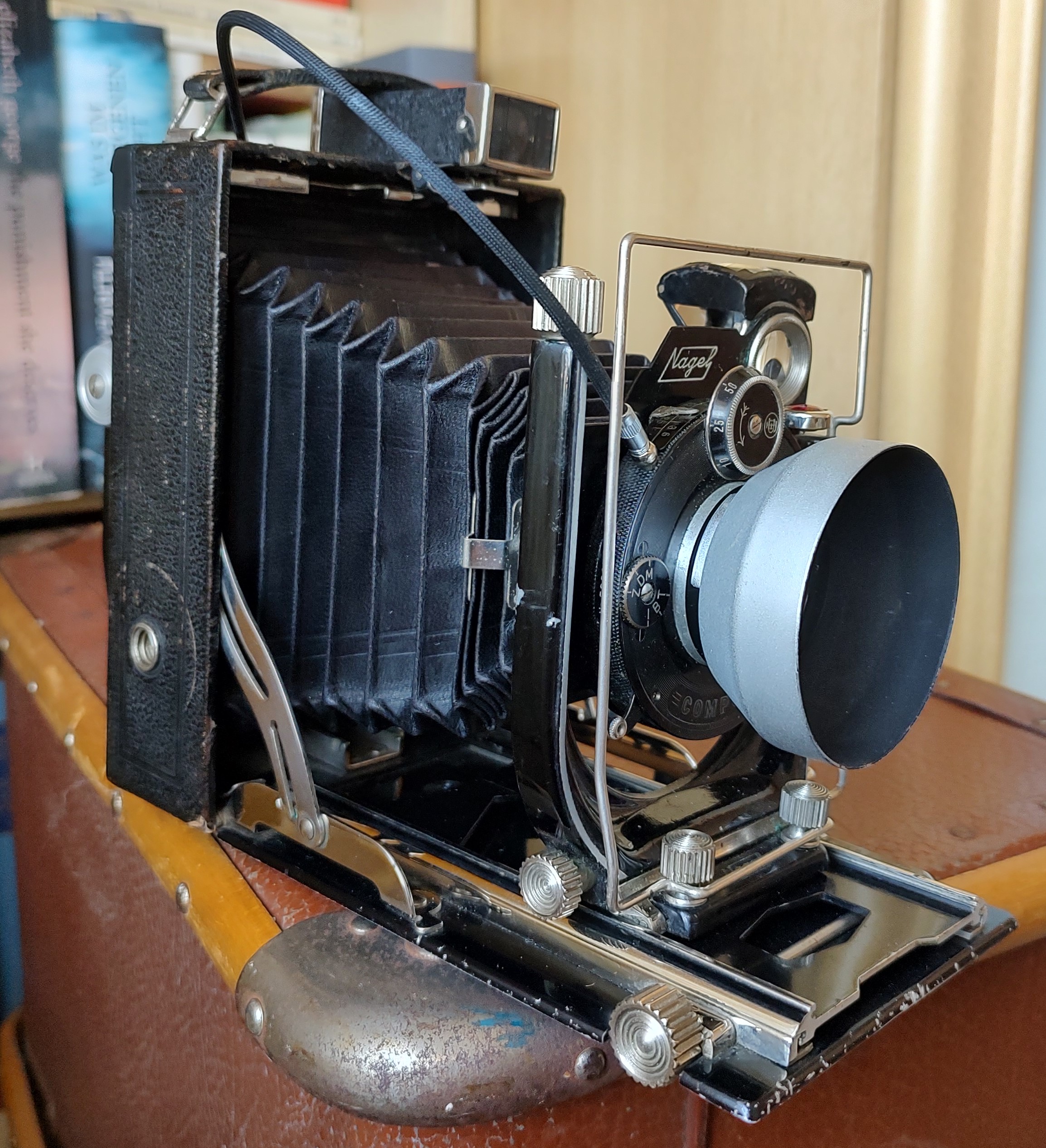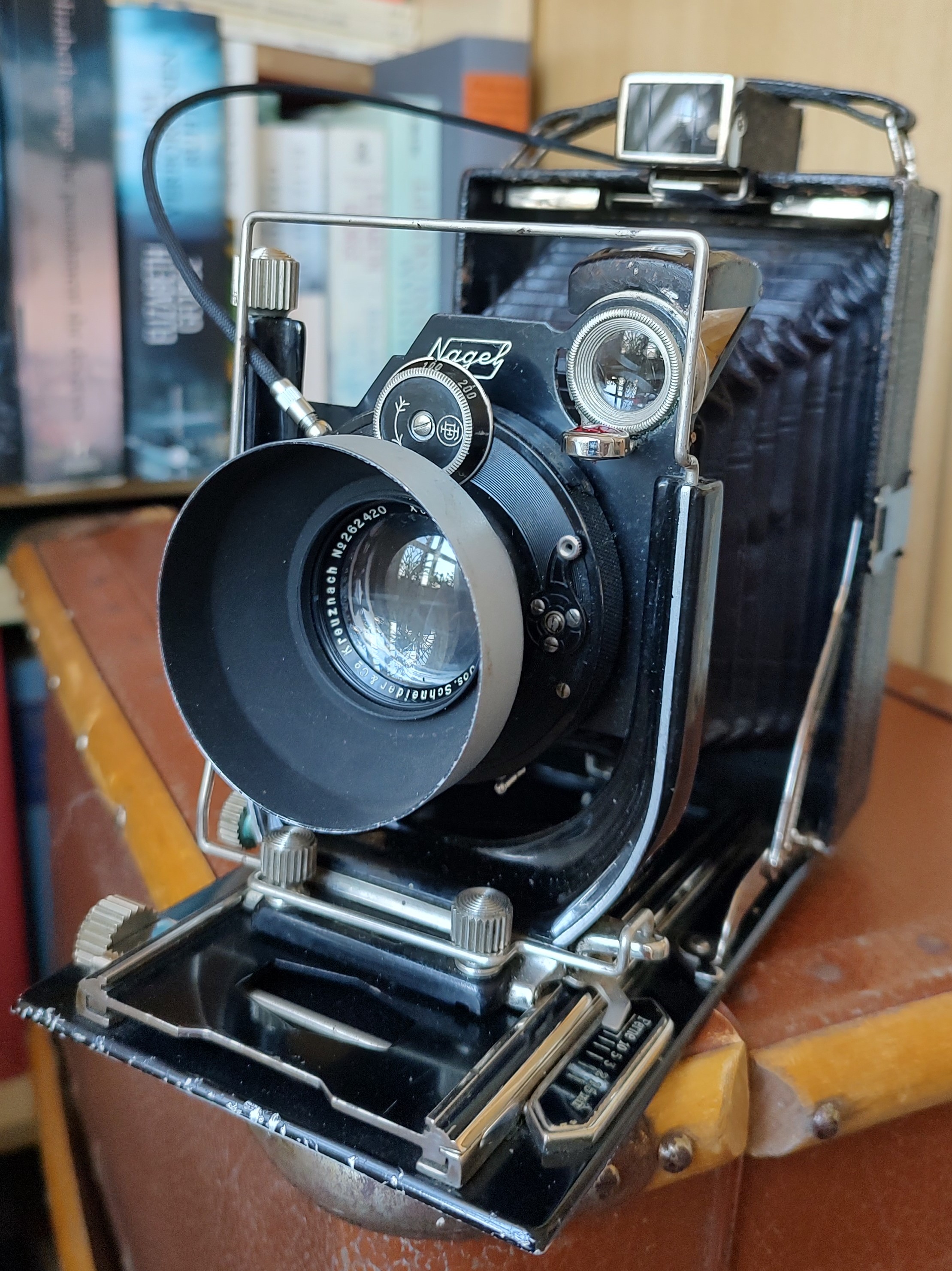 ich habe meine Nagel 33 (9x12, mit Xenar) von 1930 mit 120er-Film einsatzbereit gemacht: Der Fomapan 200 sitzt in einer Rada-Rollfilmkassette. Leider ist die Mattscheibe der Kamera gebrochen und nicht mehr verwendbar. Die Scharfeinstellung muss also „extern“ mit einem Entfernungsmesser erfolgen. Den Metallschieber der Kassette habe ich dauerhaft herausgezogen und den Schlitz mit schwarzem Tape verschlossen, da das „Fell“ am Eingang nach fast 100 Jahren ziemlich platt und daher sicher nicht mehr lichtdicht ist. Außerdem vermeide ich so den Fehler, das Herausziehen des Schiebers zu vergessen und Aufnahmen zu verlieren (ist mir alles schon passiert, man kann bei diesen umständlichen Abläufen ja so viel falsch machen… ).
