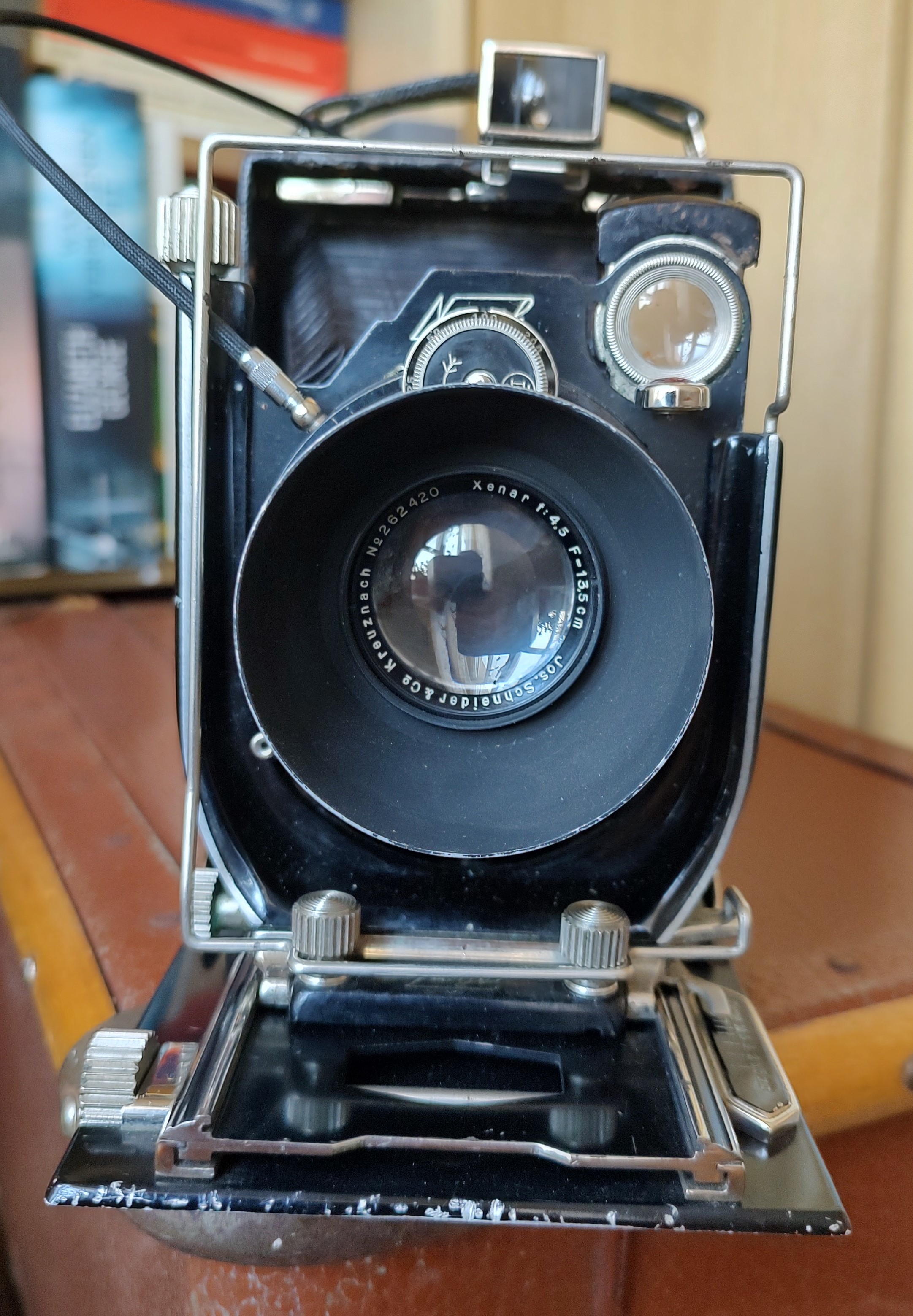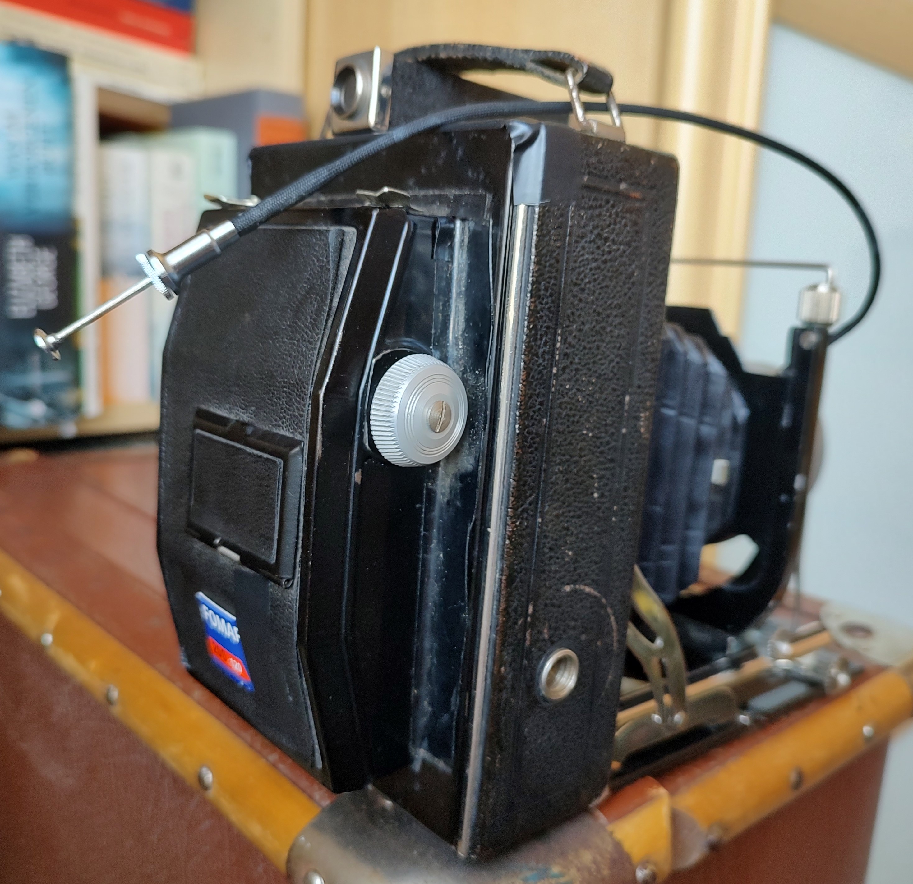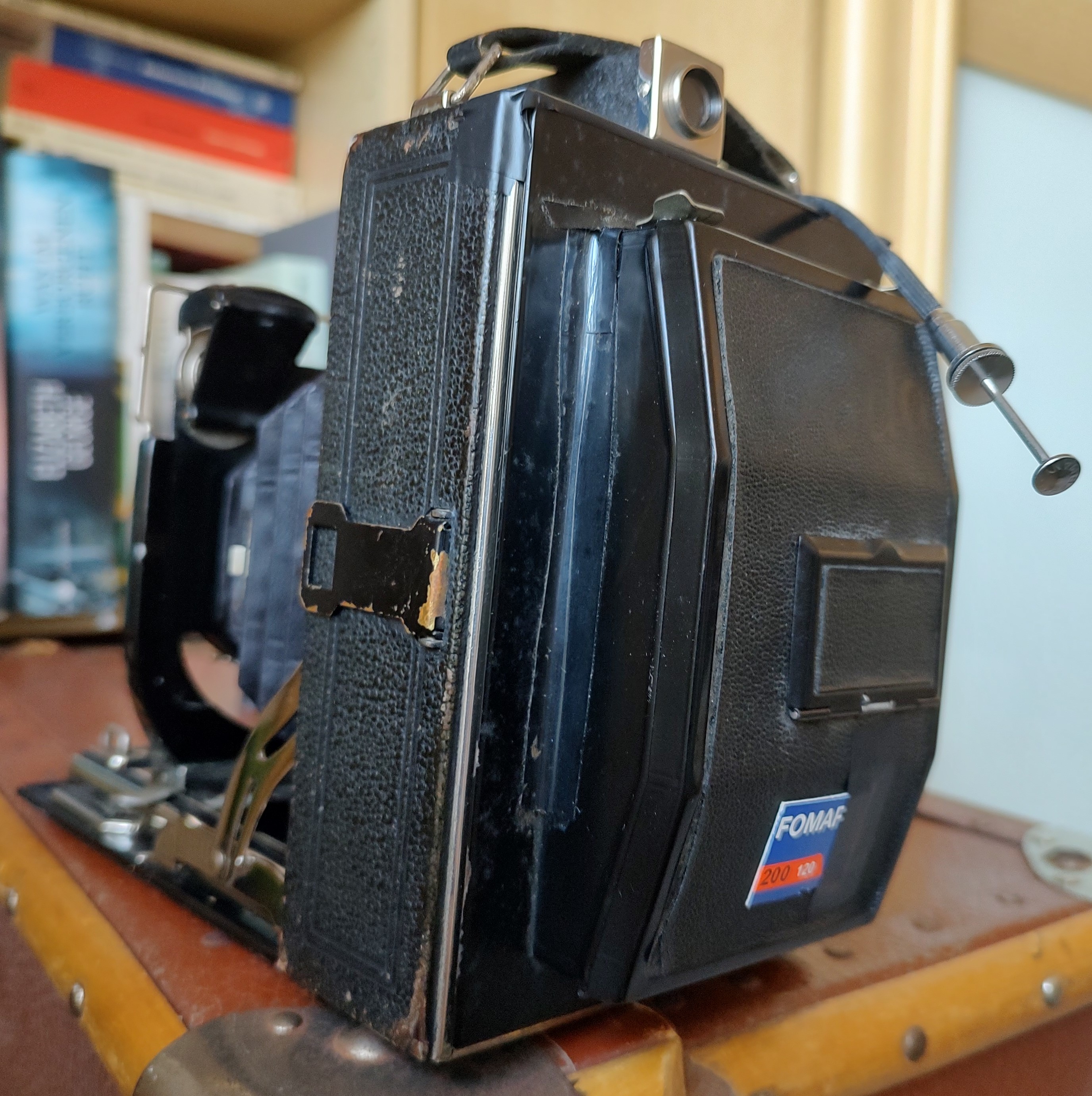 ich habe meine Nagel 33 (9x12, mit Xenar) von 1930 mit 120er-Film einsatzbereit gemacht: Der Fomapan 200 sitzt in einer Rada-Rollfilmkassette. Leider ist die Mattscheibe der Kamera gebrochen und nicht mehr verwendbar. Die Scharfeinstellung muss also „extern“ mit einem Entfernungsmesser erfolgen. Den Metallschieber der Kassette habe ich dauerhaft herausgezogen und den Schlitz mit schwarzem Tape verschlossen, da das „Fell“ am Eingang nach fast 100 Jahren ziemlich platt und daher sicher nicht mehr lichtdicht ist. Außerdem vermeide ich so den Fehler, das Herausziehen des Schiebers zu vergessen und Aufnahmen zu verlieren (ist mir alles schon passiert, man kann bei diesen umständlichen Abläufen ja so viel falsch machen… ).