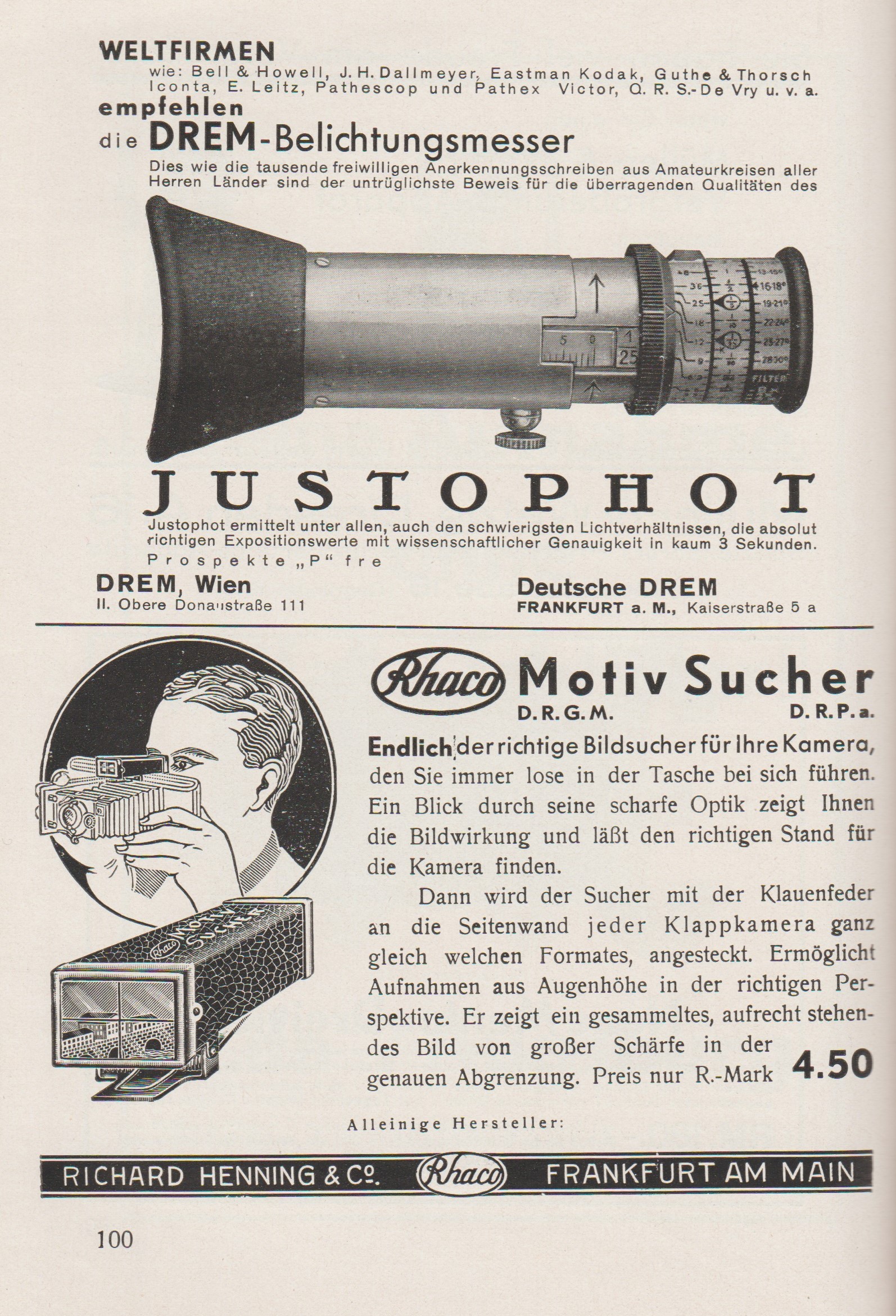 Das Besondere an meinem Apparat ist vielleicht der aufgesteckte Rhaco-Fernrohrsucher: Er wird mit einer Spange einfach an den Kamerarahmen geklemmt. Durch die Optik und die leichte Neigung schafft er sogar einen Parallaxenausgeich. Er zeigt „Leuchtrahmen“ für 6x9 und 4,5x6 cm. In der Werbung (1931, aus W. H. Döring, „Knipse – aber richtig“, Bd. 2) werden als Vorteile genannt, dass man so in Augenhöhe fotografieren und auf die Mattscheibe verzichten könne. Ich bin gespannt…