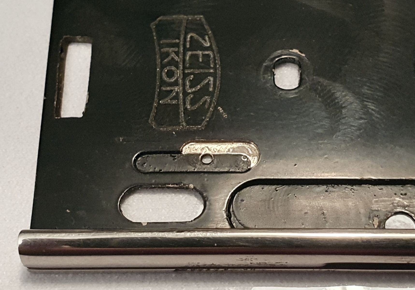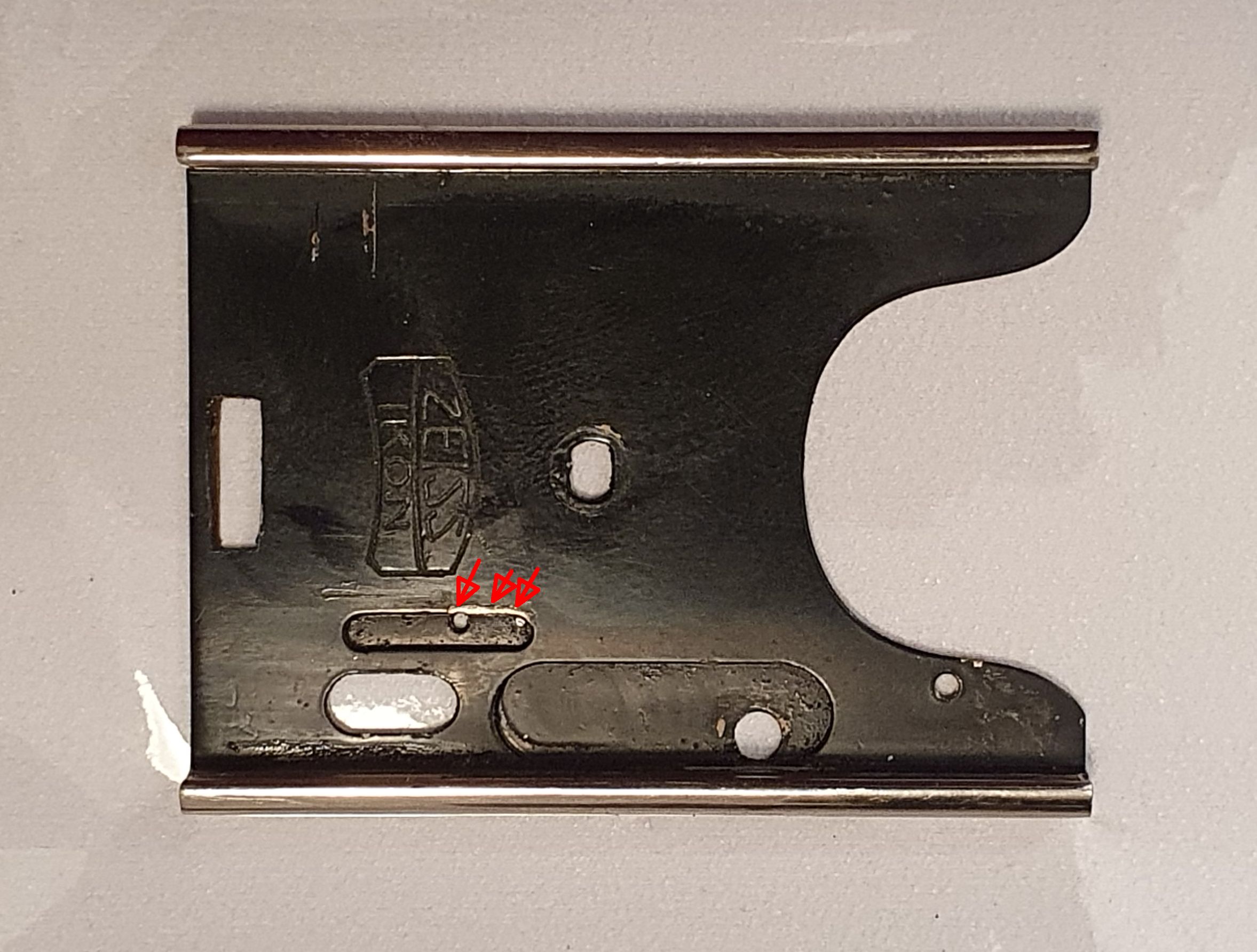 Hallo, zwischenzeitlich konnte ich den Umschalter auseinanderschrauben. Es stellte sich heraus, dass die kleine Anschlagschraube für die Positionierung des Standartenschlittens auf dem Schlitten der Entfernungseinstellung drückt, da sie ca. 0,6 mm überstand und der Entfernungsschlitten eine fehlerhaft gesetzte Fräsung hatte (auf dem Bild mit den Pfeilen sieht man noch die Druckspuren der Schraube am Rand der Fräsung). Ich hab die Fräsung einfach etwas versetzt. Jetzt funktioniert alles wieder leichtgängig. Kann einen schon wundern, dass die Kamera während der letzten fast 100 Jahre nie mit Platte benutzt werden konnte, obwohl die Rückwand dafür eingerichtet war.