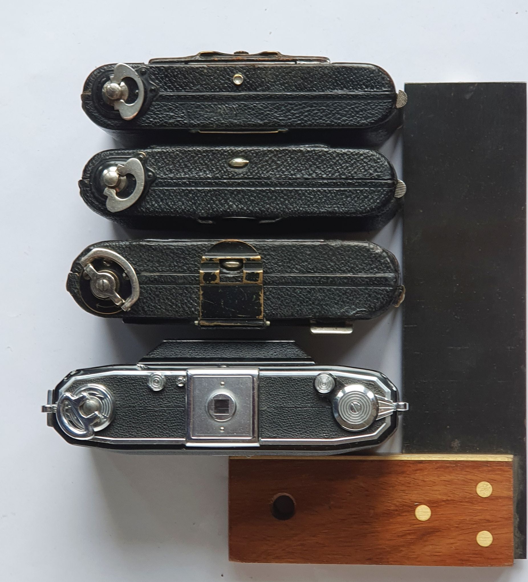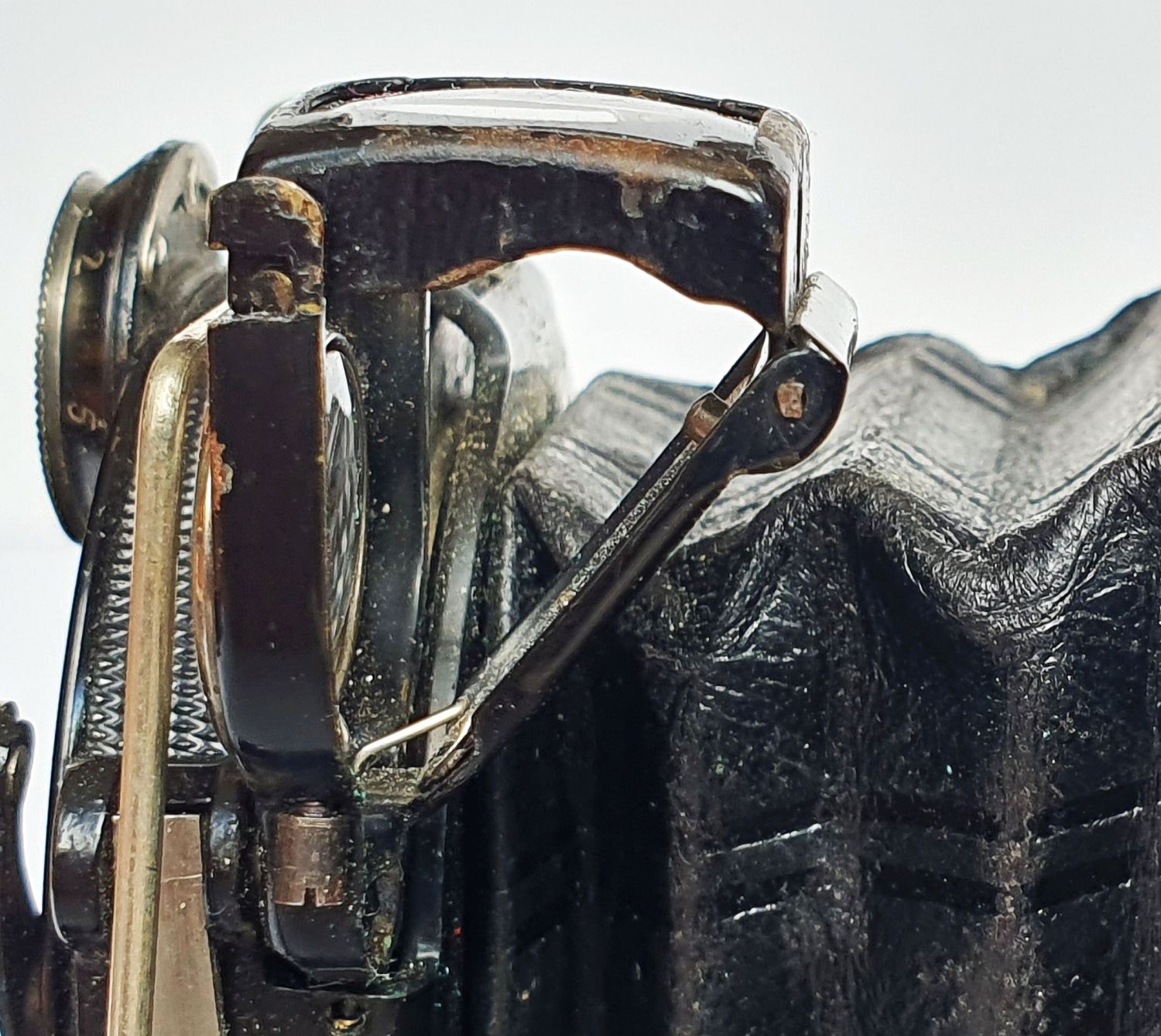 Das Gehäuse wurde bei meinem letzten Model von 1927 breiter, länger, höher und gut 100 g schwerer. Hauptsächlich zugunsten einer eigentlich überflüssigen Spulenaufhängung. Einziger Vorteil, die Kamera hat viel Platz fürs Objektiv, wodurch sie sich leicht zuklappen lässt. Insgesamt ist sie damit schon fast genauso groß wie eine frühe Zeiss Ikonta 520/16, für die sie vermutlich aus dem Rennen genommen wurde. Auch wenn mir die schmalen Gehäuse von 1919 und 1924 mehr zusagen, find ich die Icarette mit dem Tessar interessant, zumal nachdem ich etwas an die Kosmetik gefeilt hab. Ich hab noch bei keiner Kamera so viel Grünspan unter der Belederung weggeputzt. Demnächst werde ich mal einen Film durchziehen – natürlich erst nachdem auch die Standarte gerichtet ist.