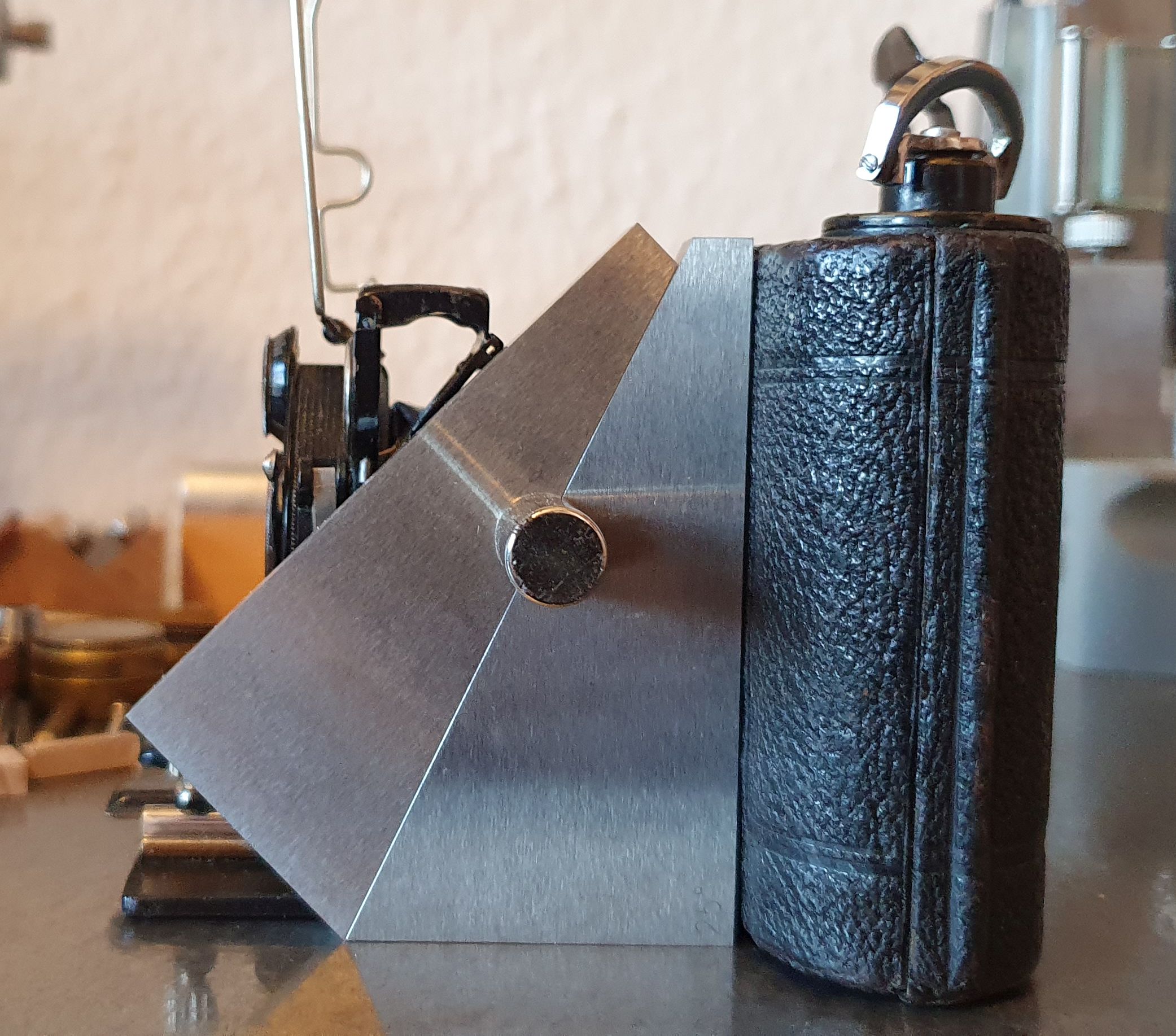 Das Beste ist aber der Brilliantsucher. Der Spiegel steht nicht unter 45 ° zur Objektivachse sondern ist deutlich stärker geneigt, was heißt, dass man nicht das sieht was man fotografiert. Die kleine doppelte Kreisfräsung an der horizontalen Brilliantlinse, die dafür sorgen soll, dass man vom senkrechten Einblick nicht abweicht, ist da auch ganz umsonst – senkrecht sieht man nämlich absolut nichts. Das ist übrigens bei der Icarette kein Einzelfall. Ich hab noch zwei davon – je eine von 1919 und 1924 – mit derselben steilen Schiefstellung des Brilliantspiegels - dass sich da über die Jahre niemand beschert hat wundert mich. Die Brilliantsucher sind ohnehin bei vielen älteren Kameras mit Vorsicht zu genießen, genauso wie die Wasserwaagen. Die kleinen Dinger sind eigentlich immer irgendwie verbogen und sorgen vermutlich mehr für Verwirrung und schlechte Fotoergebnisse, als dass sie nützen.