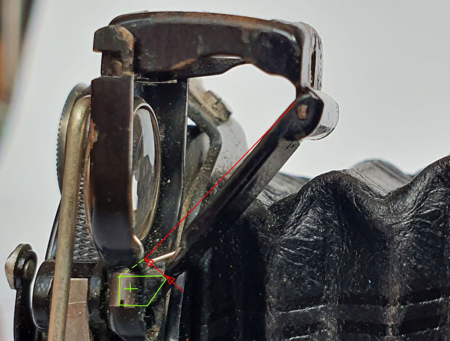 Das Problem liegt meiner Meinung eher an einem im wahrsten Sinne des Wortes Knackpunkt (roter Minipunkt) zwischen dem Scharnierteil (grün) und der Spiegelunterlage (rot). Würde der Knackpunkt (roter Pfeilspitze unten) in Richtung zweiter Pfeilspitze weiter nach vorn verlegt, würden die 45 ° relativ genau passen. Dumm ist nur, dass dann der Platz am Scharnier beim Zusammenklappen knapp wird und die kleine aber kräftige Feder die den Sucher zurückzieht immer heftig gegen die Spiegelunterlage drückt. Dabei ist dann der Krackpunkt echt gefährdet zu brechen.