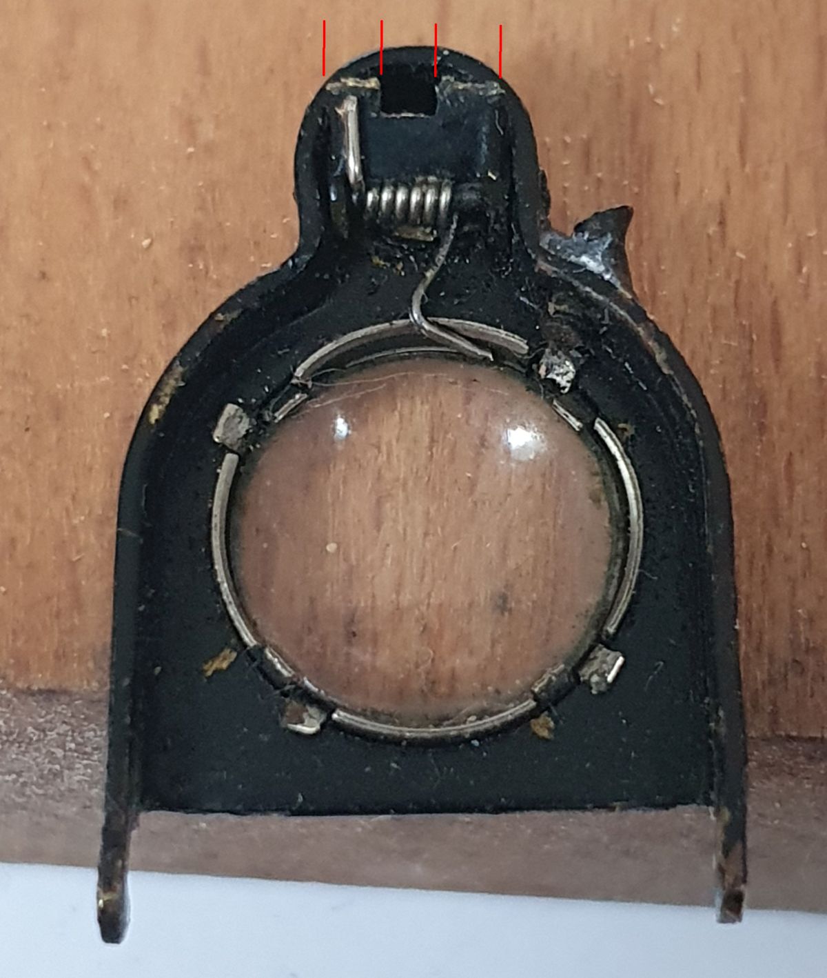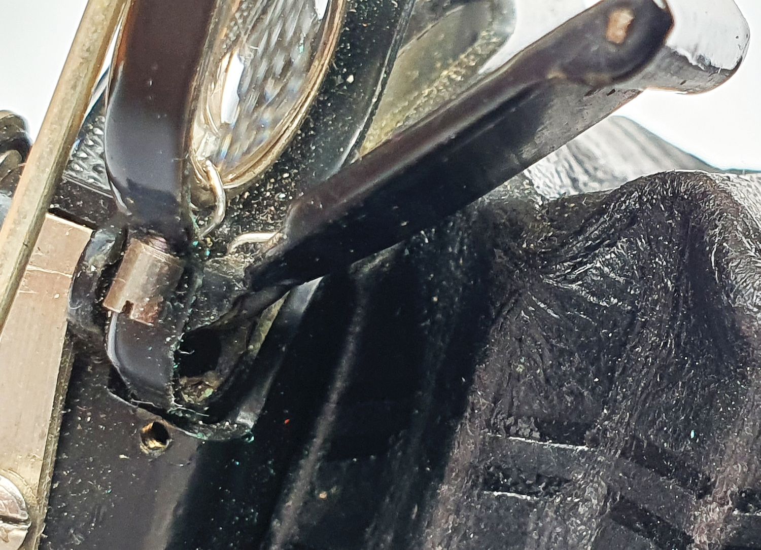 Ich musste mir für meine erste Icarette von 1919 noch eine zusätzliche Schrottkamera als Ersatzteillager besorgen, um den Brillantsucher auszutauschen, der genau im Knackpunkt gebrochen war. Schaut man sich den Punkt genauer an, so sieht man, dass hier maximal zwei Blechübergange von je ca. 2 x 0,5 mm (und kleiner) das Scharnier mit der Spiegelunterlage verbindet (siehe Bild: Abgebrochene Verbindungspunkte ca. 2 x0,5 mm). Ich vermute, dass der Punkt einfach zu schwach konstruiert wurde und sich vielleicht auch im Laufe der Benutzung durch den Druck der Feder in die Fehllage verlagert hat. An der Übergangsstelle haben beim Ausstanzen schon die Scherkräfte das Material vorgeschädigt und bei der Umformung dürften die angreifenden Kräfte das Material nochmals beeinträchtigt haben. Von daher ist es vermutlich keine gute Idee da etwas richten zu vollen.