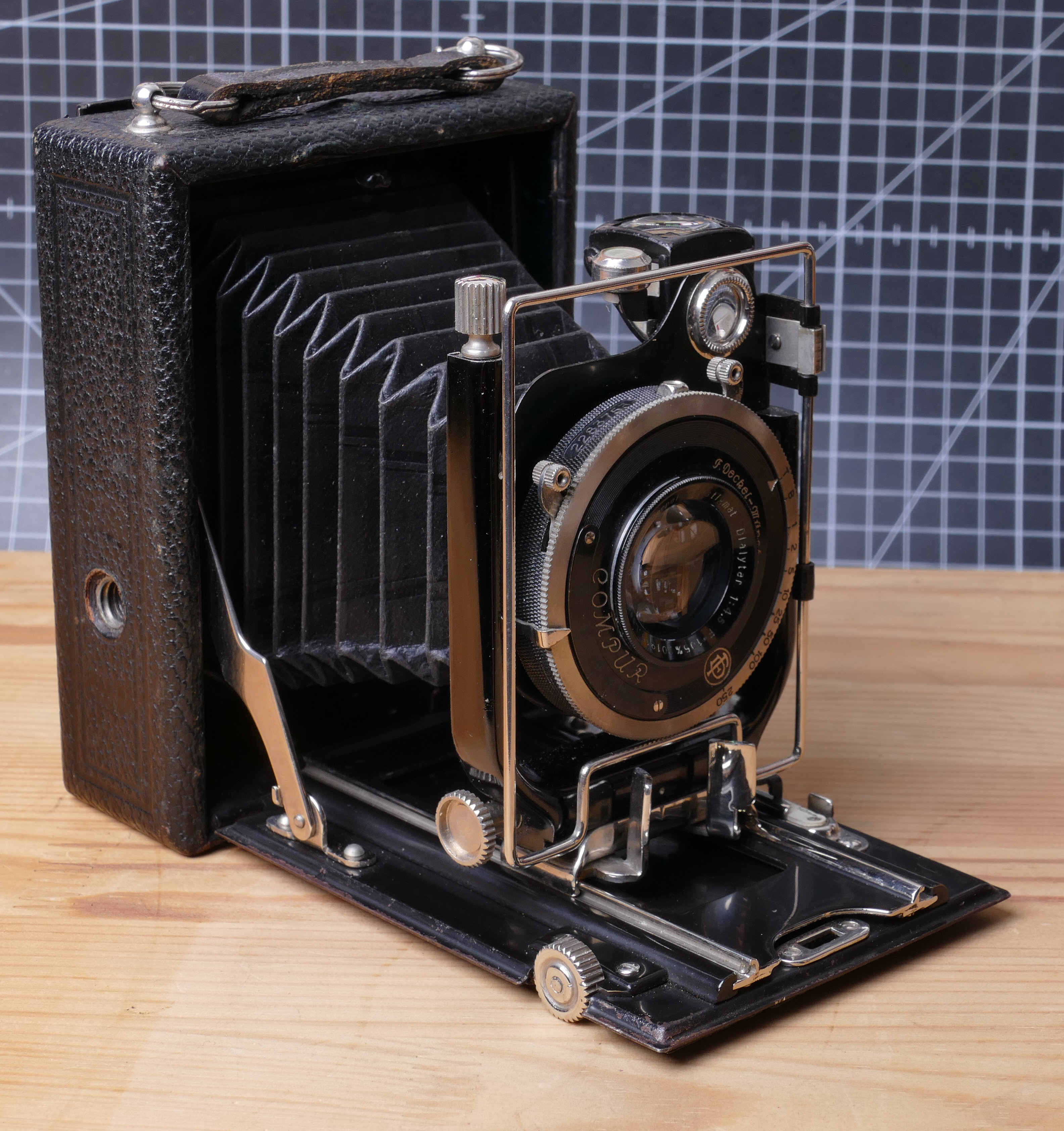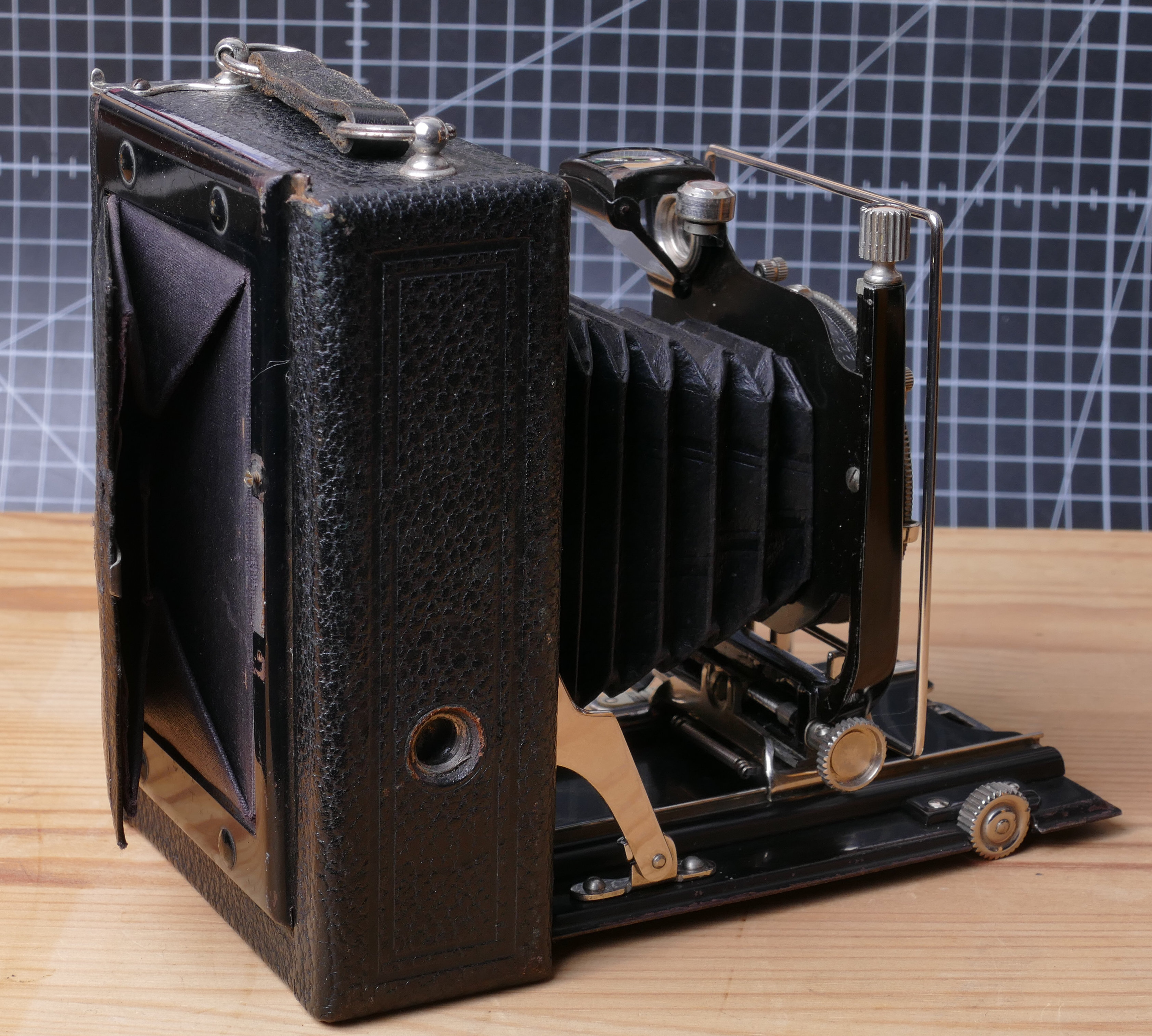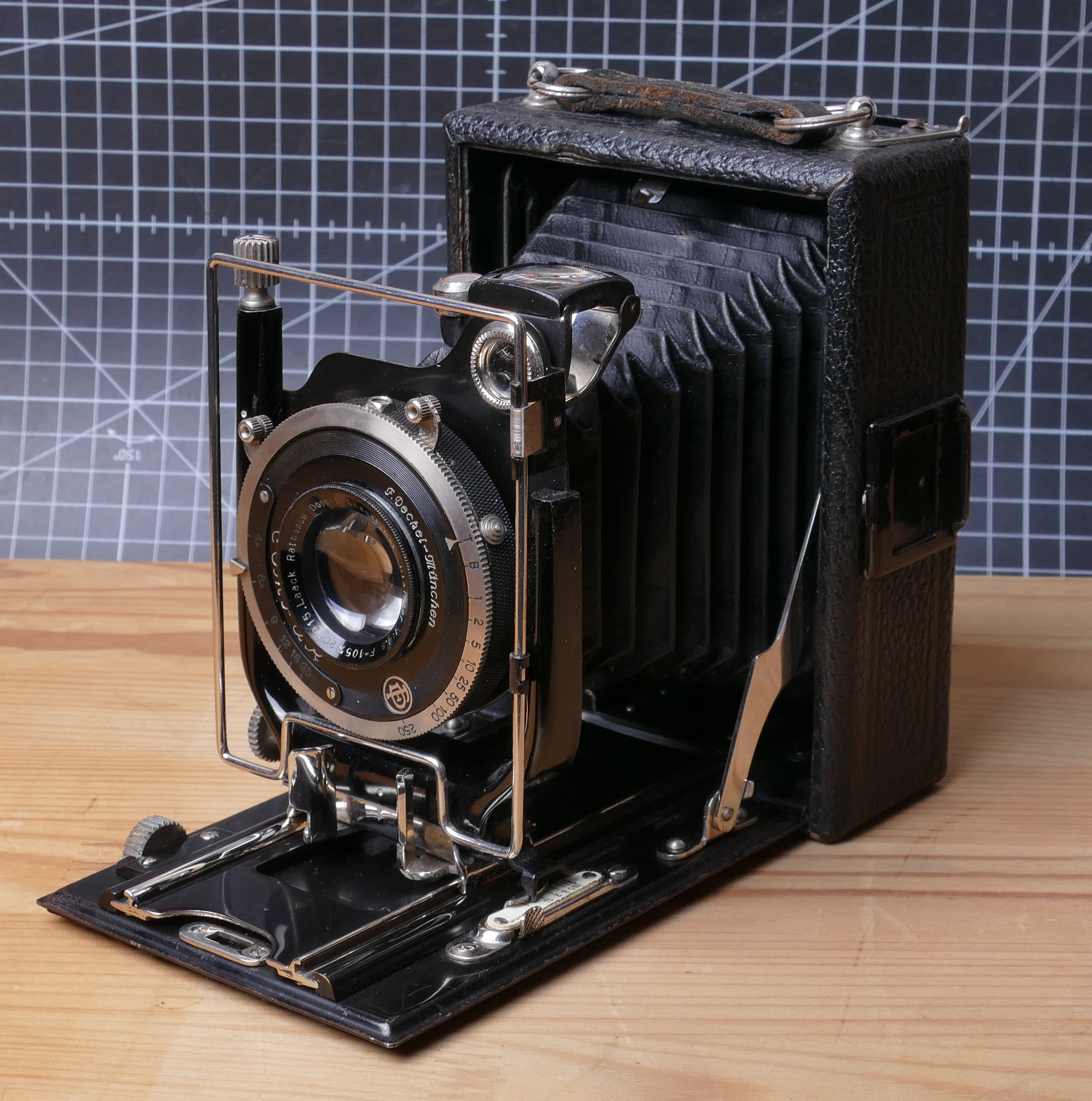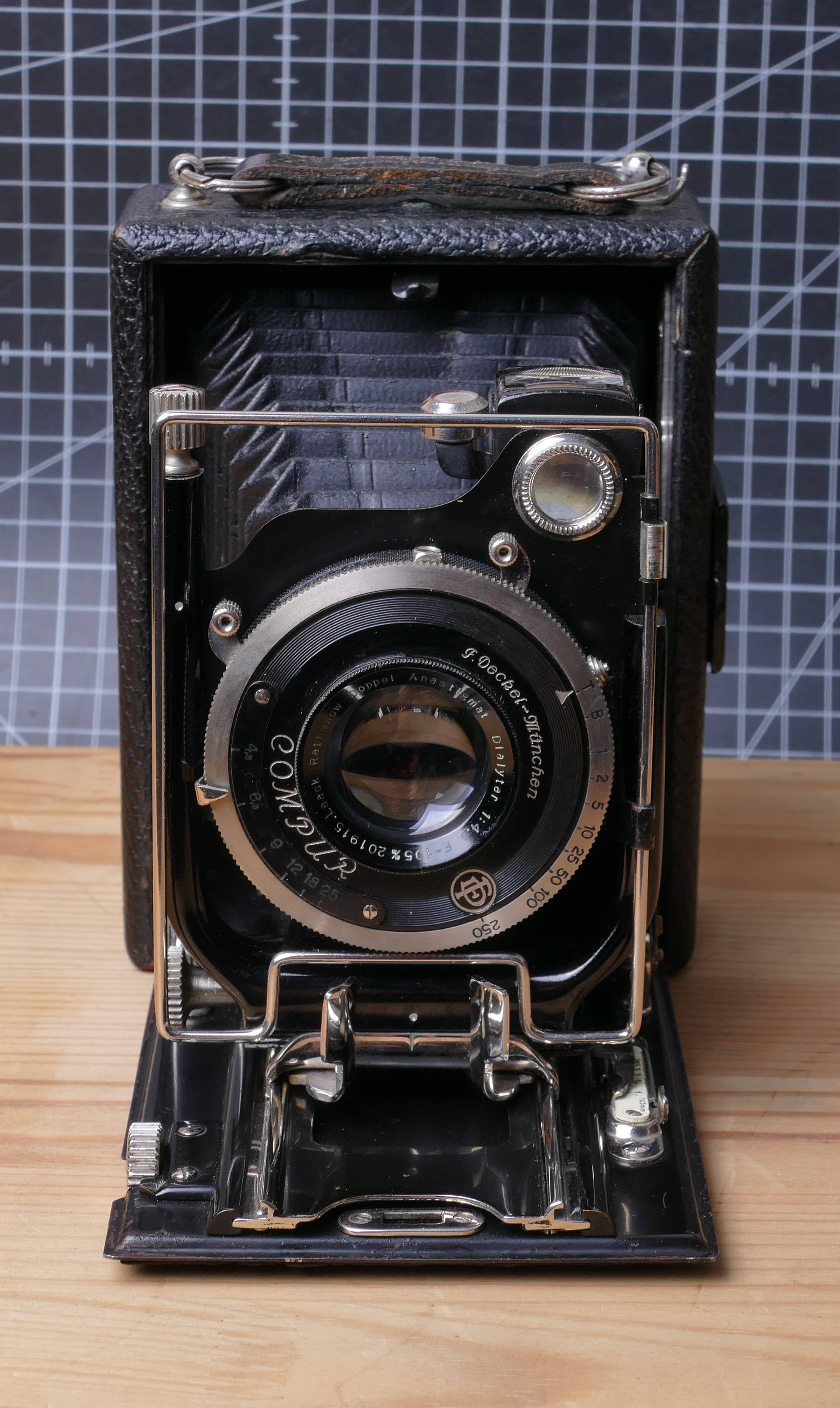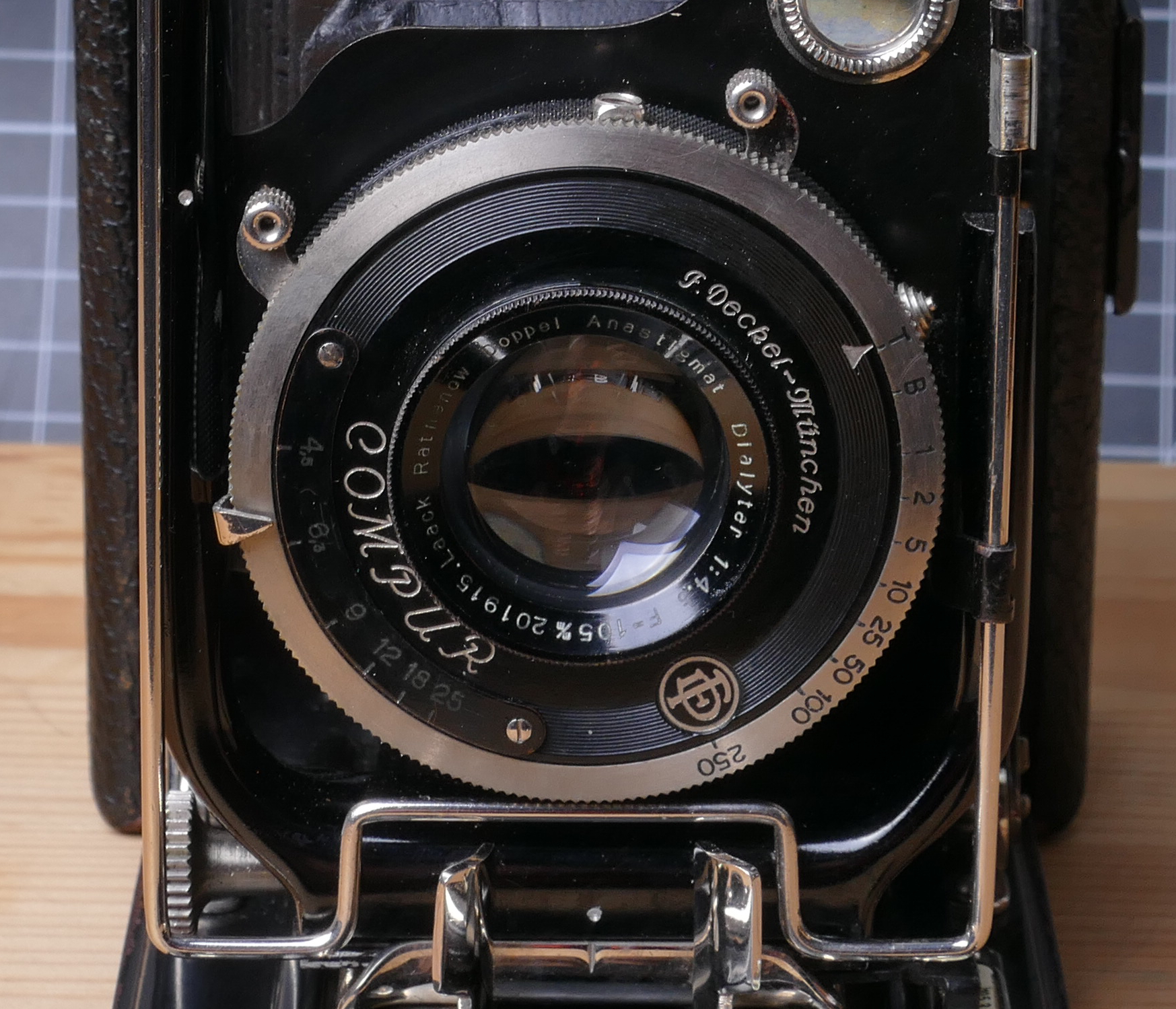 Etwas ist aber ungewöhnlich: Die Seriennummer des Compur-Verschlusses verweist auf das Jahr 1931. Deine Kamera hat aber augenscheinlich ein Holzgehäuse; eigentlich wäre für ein so spätes Baujahr ein Metallgehäuse zu erwarten. Möglicherweise ist der Verschluss also erst später montiert worden; vielleicht wurde die Kamera nachträglich aufgewertet. Dass mal jemand Hand angelegt hat, erkennt man auch daran, dass der Verschluss um etwa 60° verdreht wurde. ist der Konterring fest?