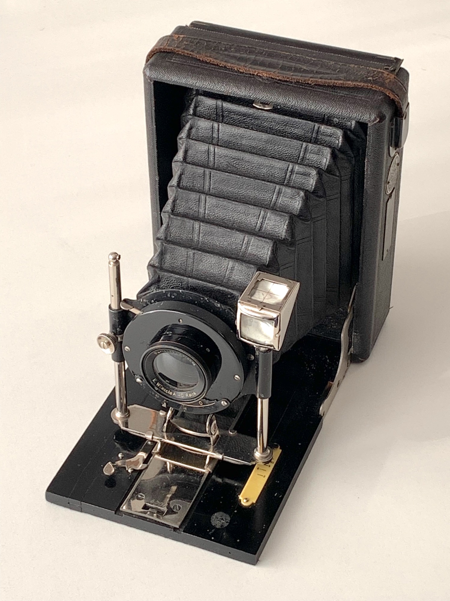 wie der Zufall so spielt, erreichte mich dieser Tage meine erste Kamera von Emil Wünsche. Das Gerät ist zugegebenermaßen in recht schlechter Verfassung: der Sucher fehlt, die Standarte ist etwas verbogen und der Balgen ist historisches Flickwerk und sicherlich nicht mehr zu retten. Dafür war der Preis überaus moderat. Die Kamera ist an drei Stellen als Wünsche-Kamera ausgewiesen. Zum ersten hat sie seitlich eine Wünsche-Plakette:
