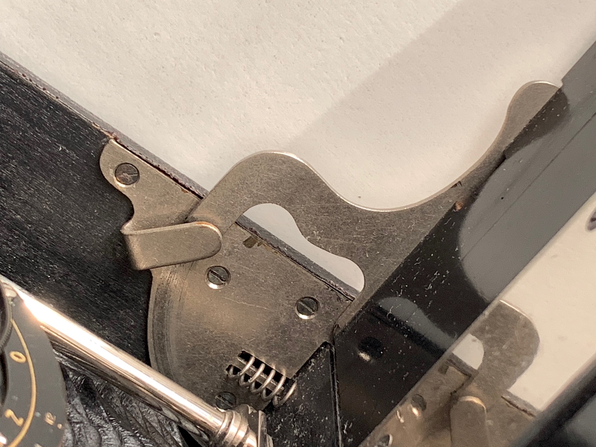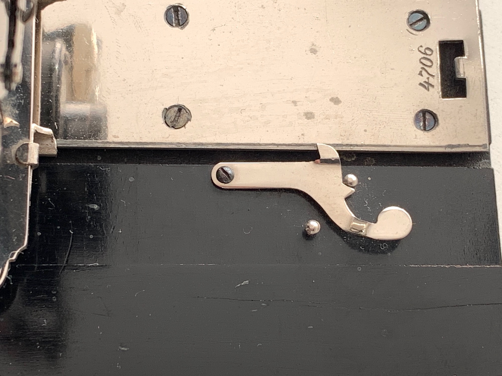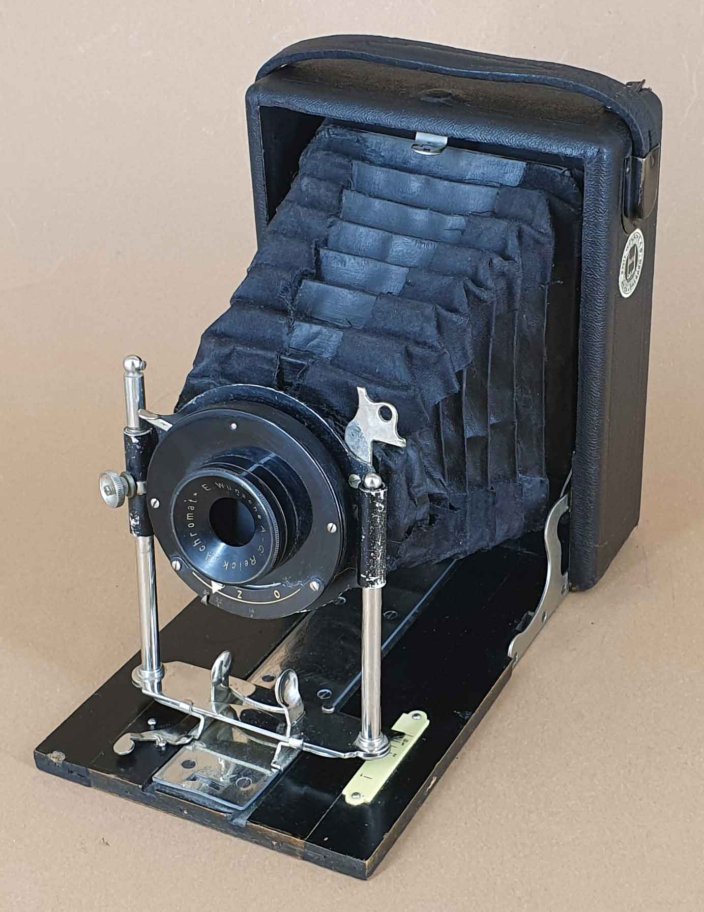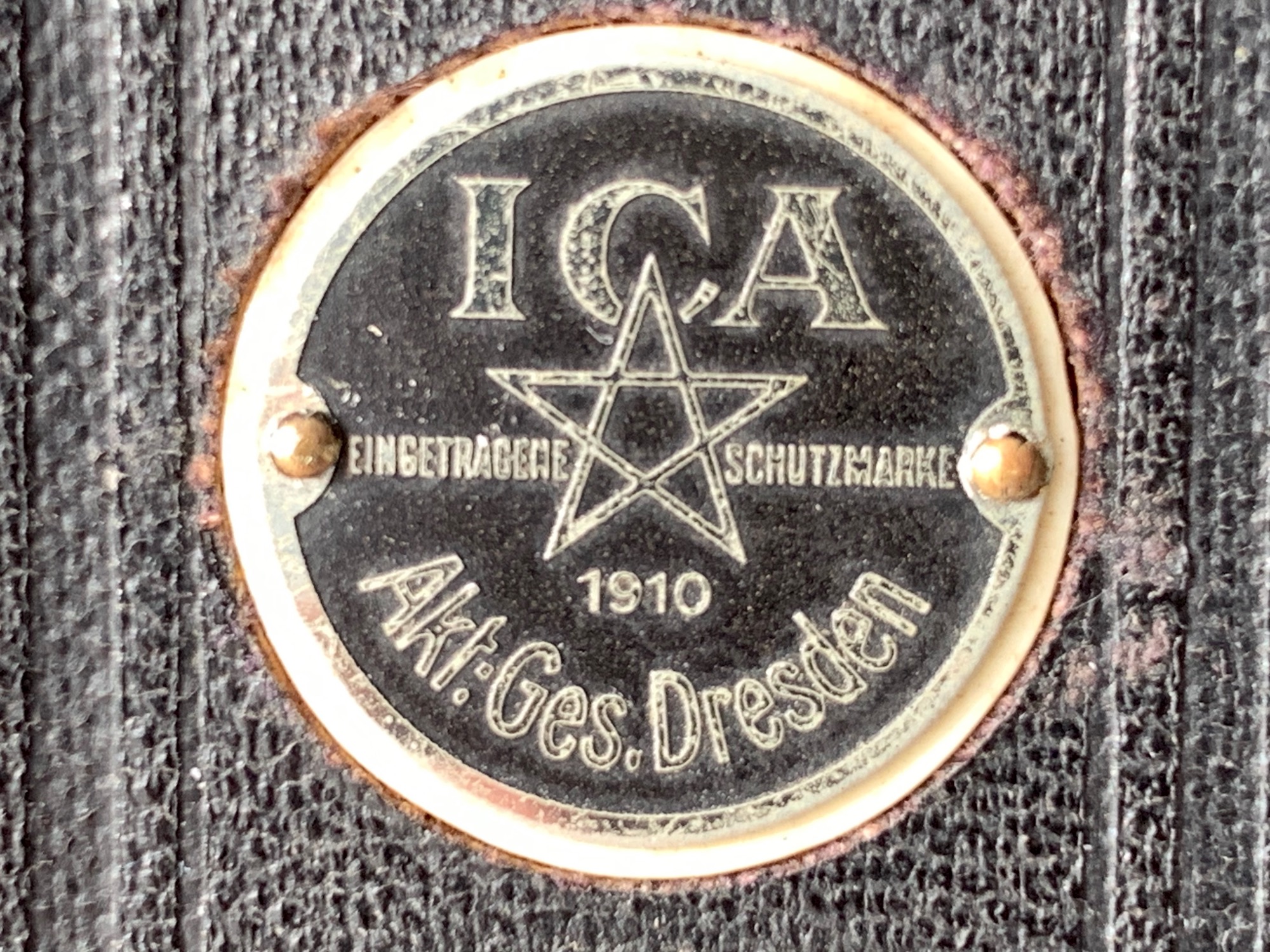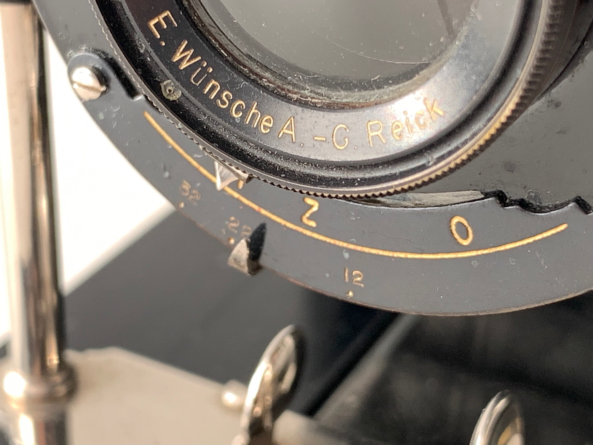Die Kamera trägt an recht prominenter Stelle, nämlich am vorderen Teil der vernickelten (?) Laufschiene, eine (vierstellige) Seriennummer. Ica-Kameras haben sie üblicherweise am Bildfenster, außerdem sind Ica-Seriennummern durch einen vorangestellten Buchstaben gekennzeichnet, der das Produktionsjahr angibt. Diese Seriennummer wurde offenbar vom ursprünglichen Hersteller vor der Fusion zur Ica AG vergeben. Hinweise auf den ursprünglichen Hersteller bietet das Objektiv, ein Wünsche Periscop-Aplanat mit der Lichtstärke 12, montiert in einfachem Automat-Verschluss mit einer Momentzeit und Z (= B) sowie O (= T). Emil Wünsche (Reick bei Dresden) war eine der Firmen, die 1909 zur Ica AG fusionierten; es liegt also nahe, dass wir es hier mit einer Wünsche-Kamera zu tun haben, die ins Ica-Programm übernommen und entsprechend umetikettiert wurde. Wünsche hatte auch einen eigenen Falz; dass Ica-Kassetten mit Normalfalz hier nicht passen, ist ein weiteres Indiz. Die erwähnte Ica-Plakette wurde offenbar auf eine bereits vorhandene Plakette gesetzt. Ich habe daher zunächst vermutet, dass sich darunter ein Wünsche-Schild verbergen könnte, und die Plakette vorsichtig entfernt. Zu meiner Überraschung zeigte sich eine Beschriftung, die gar nicht weiterhilft: