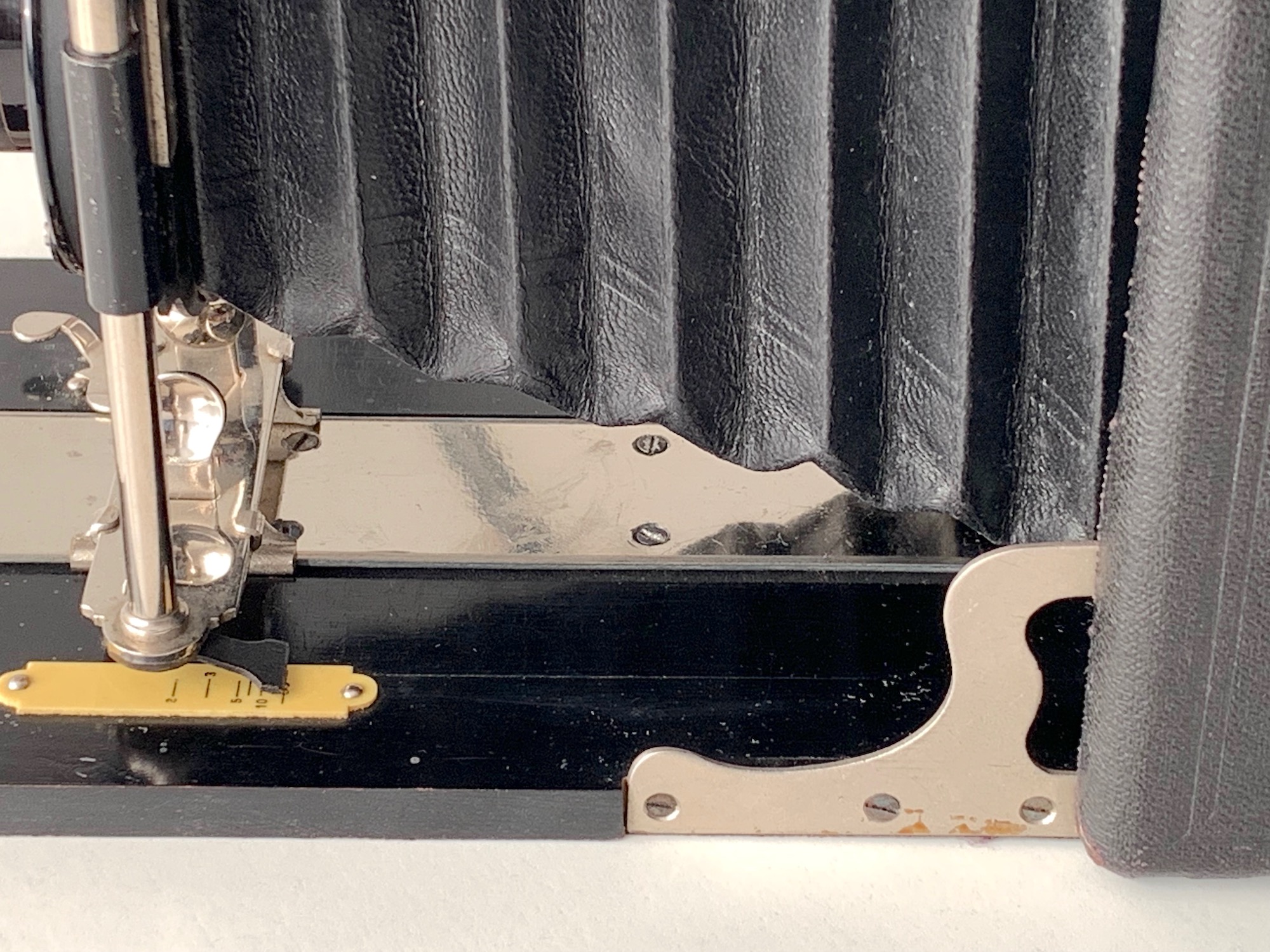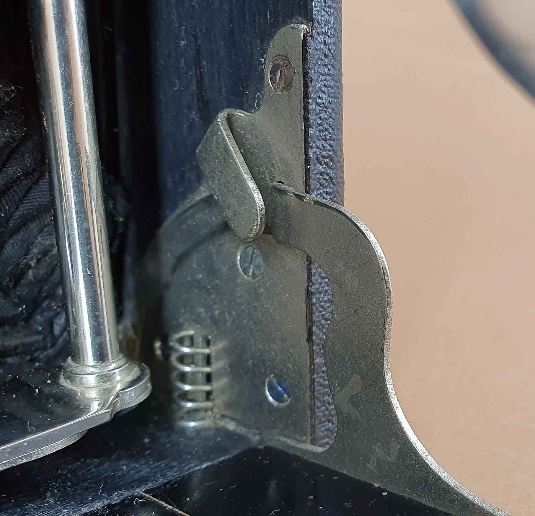 Ungewöhnlich für eine großformatige Plattenkamera erscheinen mir die klein dimensionierten Spreizen, die in zwei Schlitze einrasten.