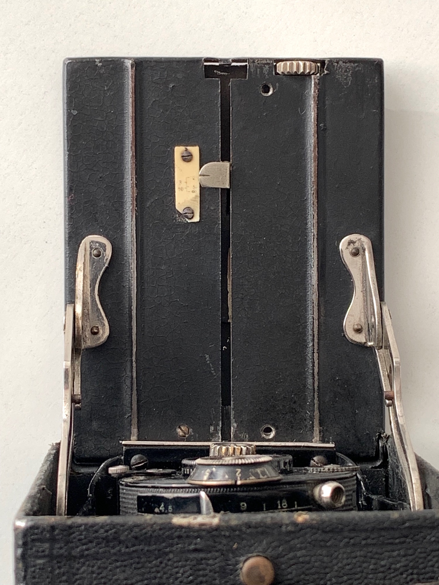 Es handelt sich um eine Laufbodenkamera für Platten im Format 4,5x6. Die Kamera besitzt ein Metallgehäuse und einen Laufboden aus Metall. Dieser ist doppelwandig ausgeführt. Im Hohlraum befindet sich eine Mechanik, die es gestattet, mittels eines quer zur Schlittenrichtung angeordneten Rändelrades den Anschlag zu verstellen. Dazu gibt es eine zusätzliche Entfernungsskala auf der Außenseite des Laufbodens. Offenbar war vorgesehen, die Entfernung bereits vor Öffnen der Kamera einzustellen, wie es beispielsweise bei den Voigtländer Springkameras der Fall war (--> https://blende-und-zeit.sirutor-und-comp...&thread=269).