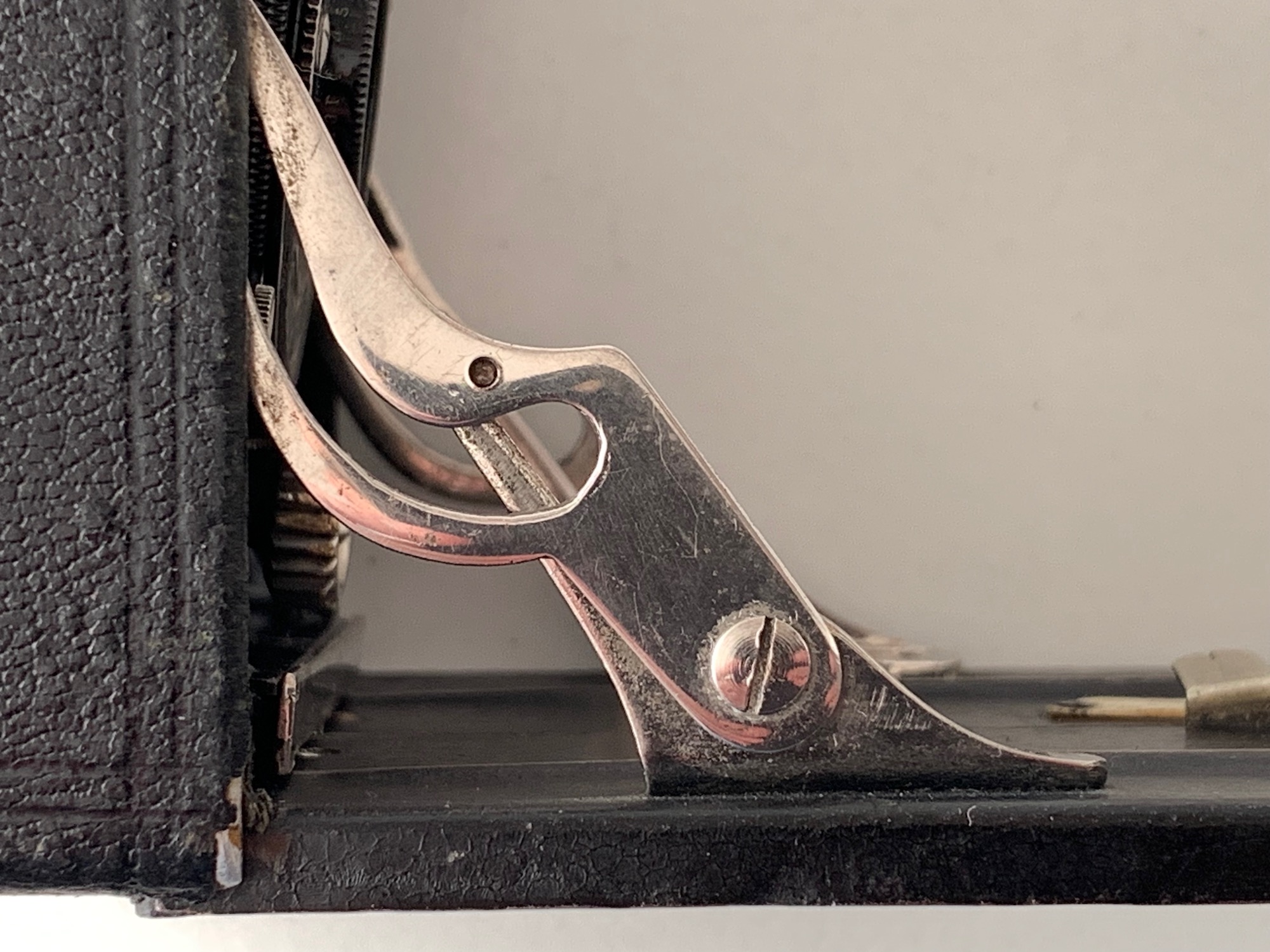 Eine solche Konstruktion ist aber eigentlich nur sinnvoll, wenn der Schlitten automatisch ausfährt. Beim vorliegenden Exemplar sehe ich keine mechanische Koppelung des Schlittens mit dem Anschlag; er muss manuell herausgezogen werden. Eine Automatikvorrichtung, wie es sie beispielsweise bei der Goerz Autofoc-Tenax gab (--> https://blende-und-zeit.sirutor-und-comp...amp;thread=70#5) scheint nicht vorhanden zu sein – es sei denn, im Laufboden hätte es eine entsprechende Federkonstruktion gegeben. Ausschließen kann ich das nicht. Es fehlen auch zwei Schrauben; wurde hier vielleicht eine defekte Konstruktion entfernt? Auffällig ist in dem Zusammenhang auch, dass es keine Handhaben gibt – also als habe man den Schlitten gar nicht herausziehen müssen. Der Schlitten wird über einen mittig angeordneten Schlitz geführt und nicht über Laufschienen wie bei anderen Plattenkameras. Ich habe bislang noch keine Möglichkeit entdeckt, den doppelten Boden zu entfernen, um nachzuschauen, und möchte nichts zerstören. Vermutlich muss die Belederung des Laufbodens gelöst werden.