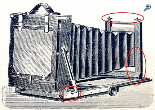 Die Befestigung des Rückteils ist anders geformt. Die Standarte weist zwei zusätzliche (Verstell-?)Schrauben auf. Es fehlt die seitliche Verstrebung der Standarte, wobei diese Strebe auch nur einseitig ist und beim Katalogbild an der anderen Seite der Kamera vorhanden sein könnte. Ich habe von der „Universum“ leider nur eine Abbildung von 1897 gefunden und kann nur vermuten, dass mein Modell etwas jünger ist und deshalb die genannten kleinen Unterschiede aufweist.