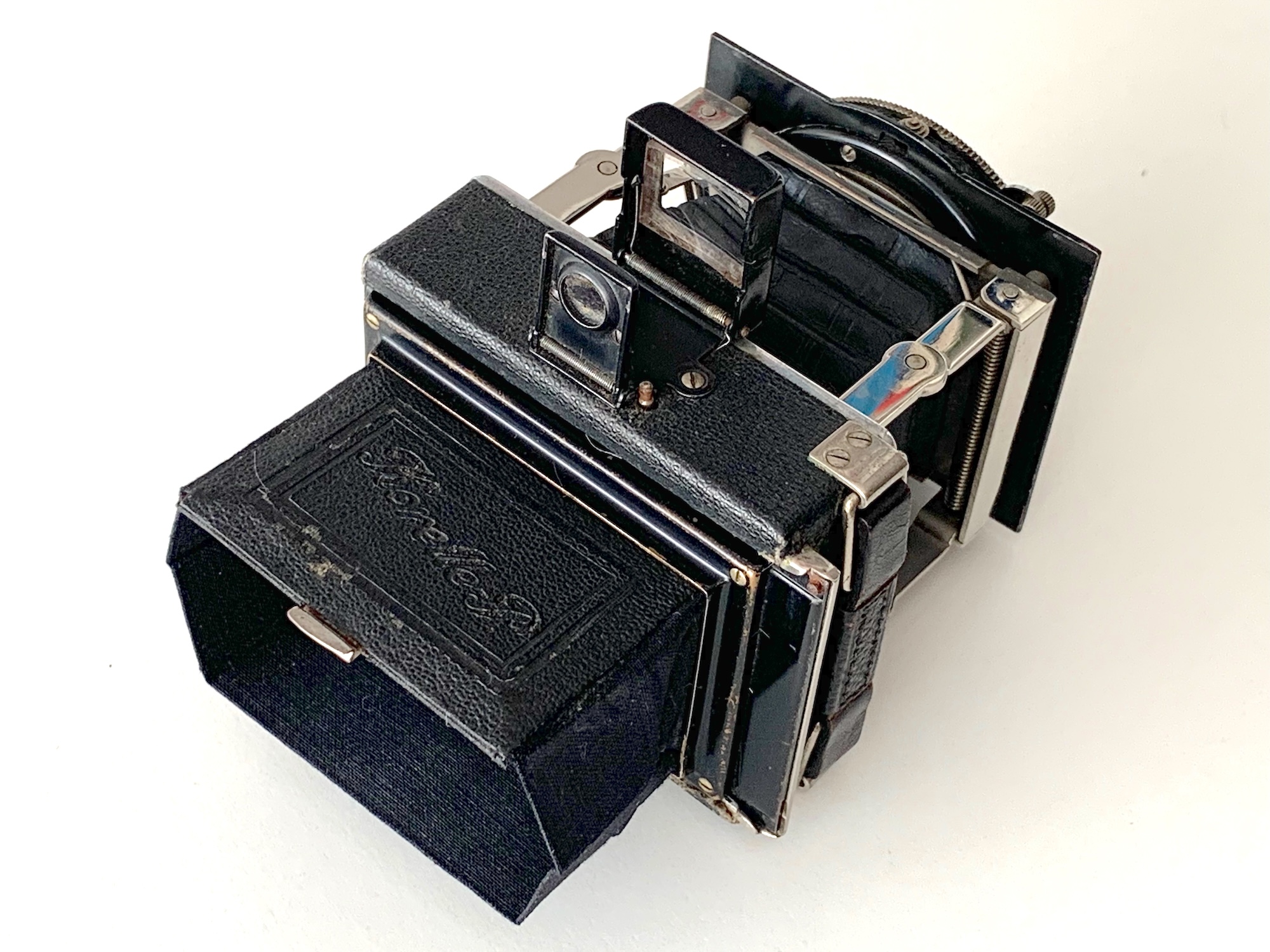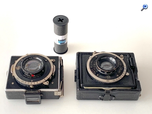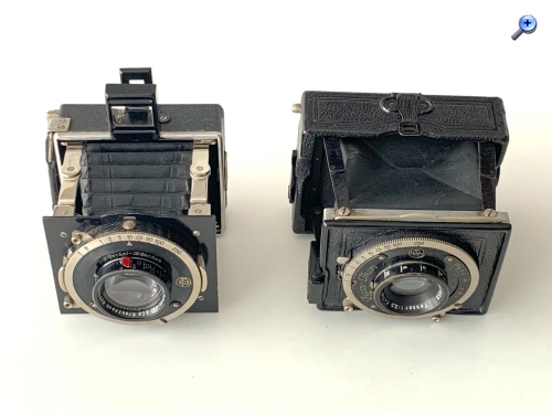 Die Korelle-P. ist konstruktiv eng mit der Korelle 4x6,5 verwandt (mit der sich, wie im oben verlinkten Beitrag von Axel gezeigt, auch Platten belichten lassen!), nur ist das Gehäuserückteil ausschließlich für Platten ausgelegt und wegen der fehlenden Spulenkammern natürlich deutlich kleiner; die Kamera misst im zusammengeklappten Zustand 8,2 x 6,5 x 4,5 cm.