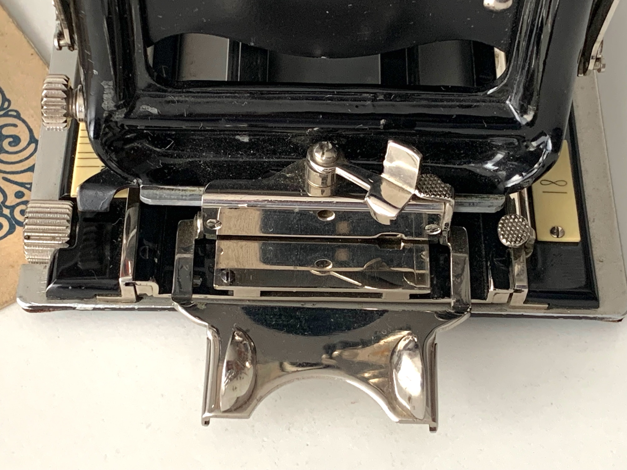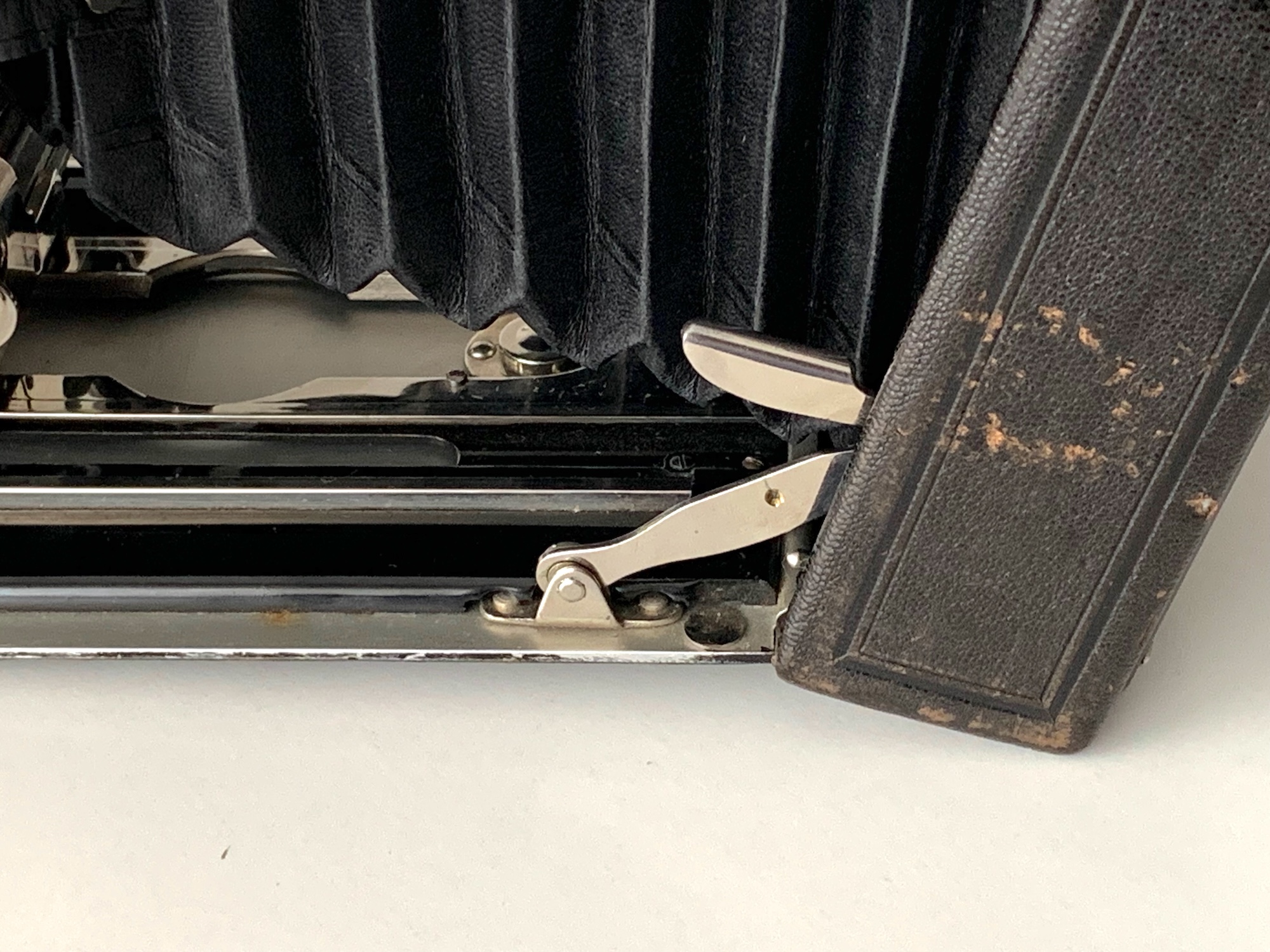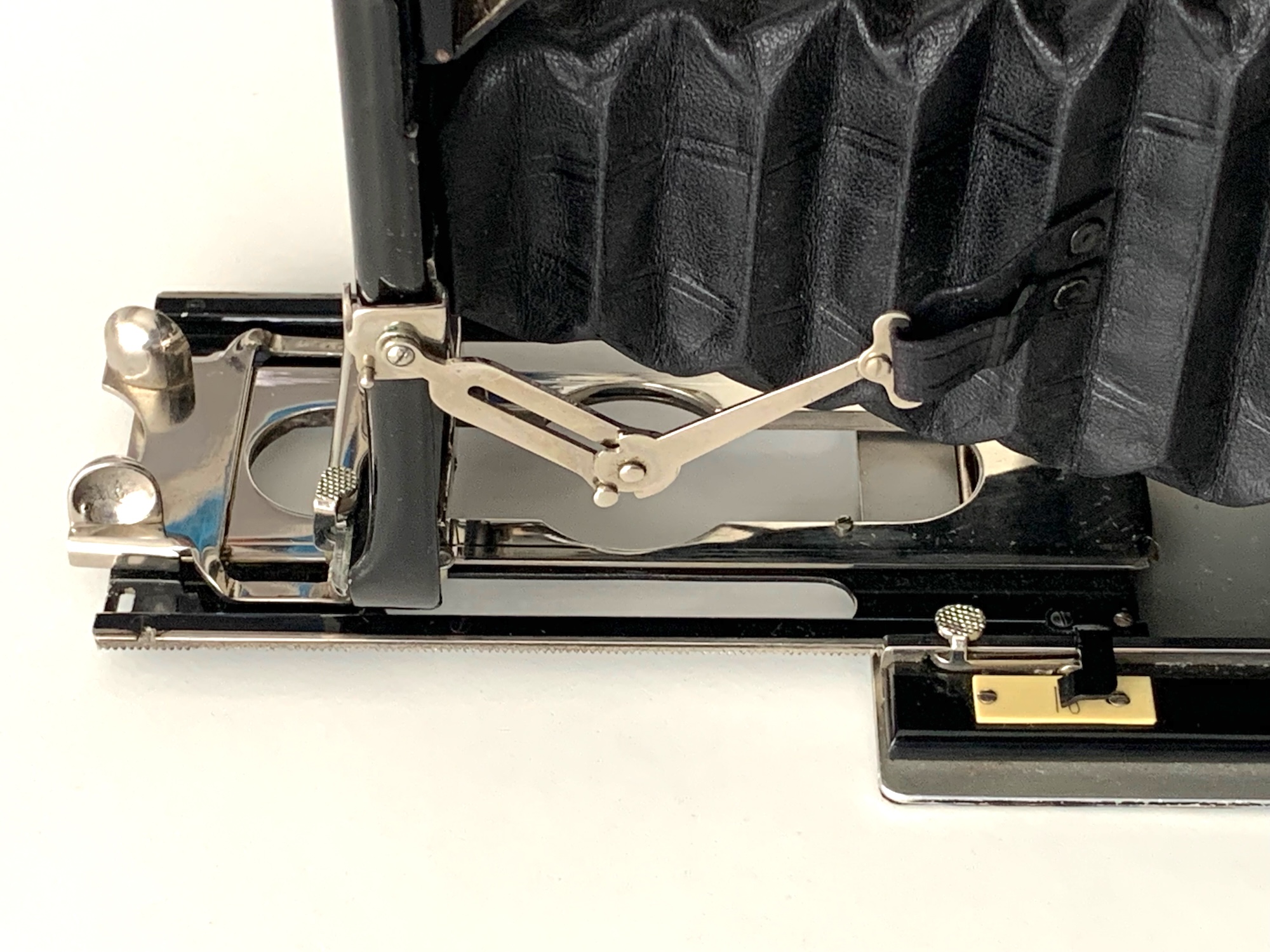 Die Kamera zeigt aber in der Gestaltung des Laufbodens und des Schlittens deutliche Unterschiede zu den späteren Modellen. Der Schlitten wird mit einem Drehhebel arretiert; die löffelartigen Handhaben am beweglichen Vorderteil dienen nur als Griffe. Die Standarte ist noch nicht als Kippstandarte ausgeführt; sie kann von den Schienen gelöst werden. Der doppelte Auszug wird in ein- und ausgefahrener Stellung arretiert.