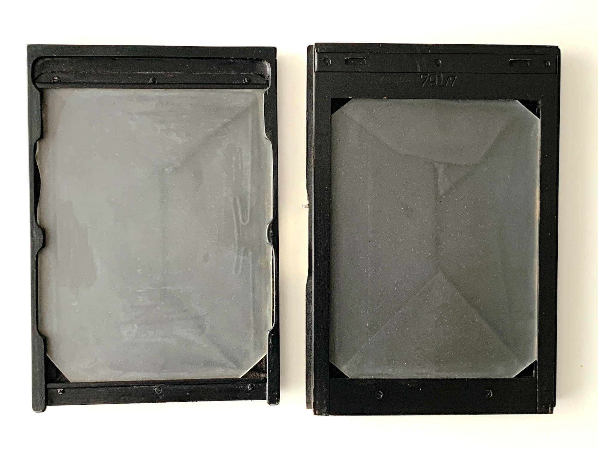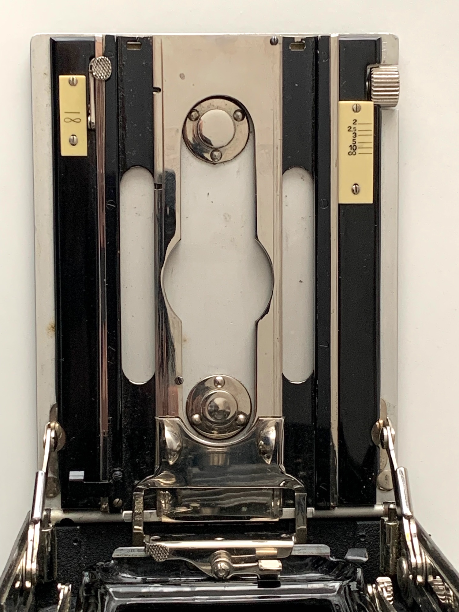 Dass der Platz besser ausgenutzt wird, sieht man beim direkten Vergleich der Mattscheibenrahmen – die vorliegende Kamera hat eine beinahe randlose Mattscheibe; rechts die 250/7. Beide belichten 9x12!