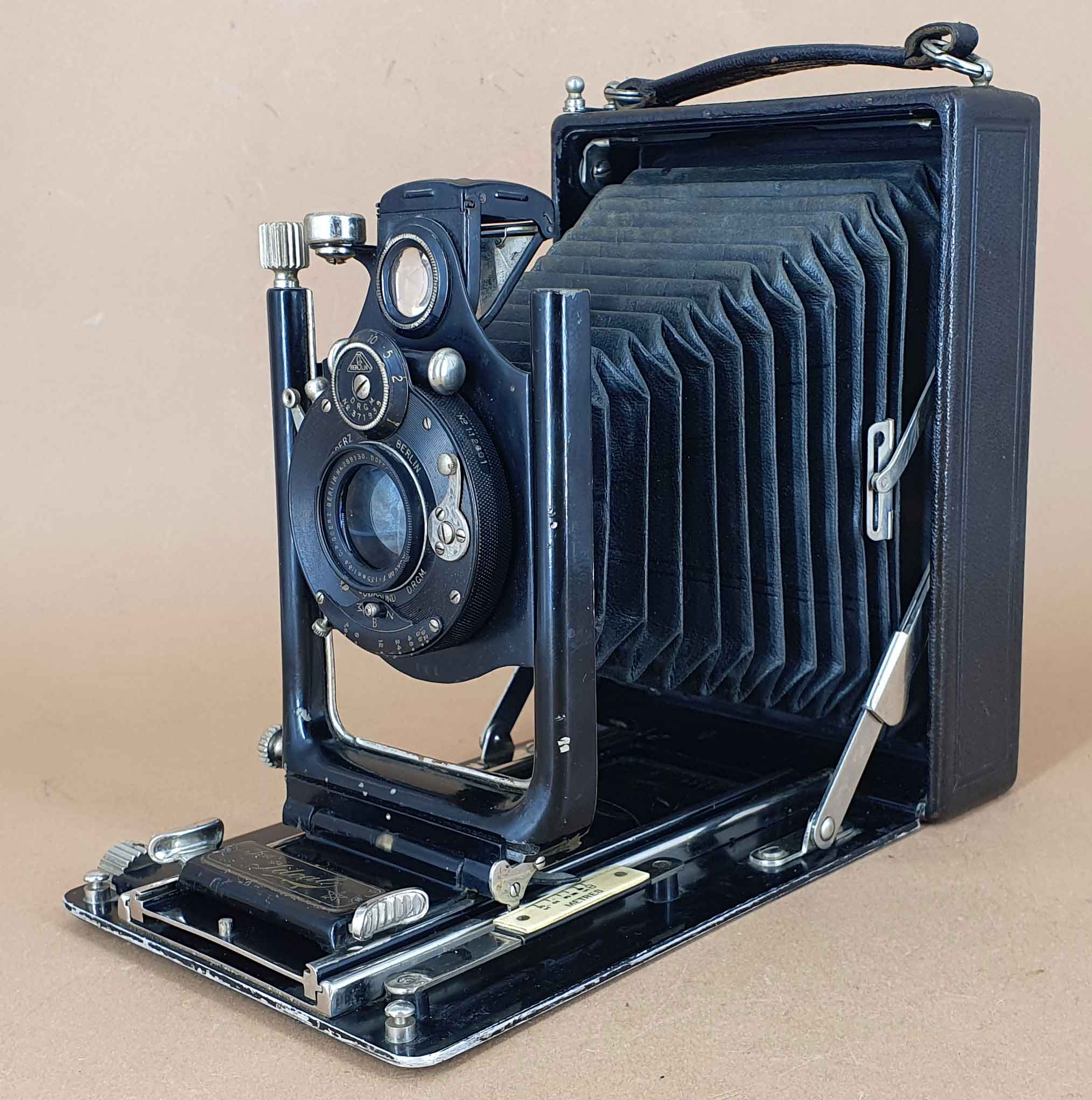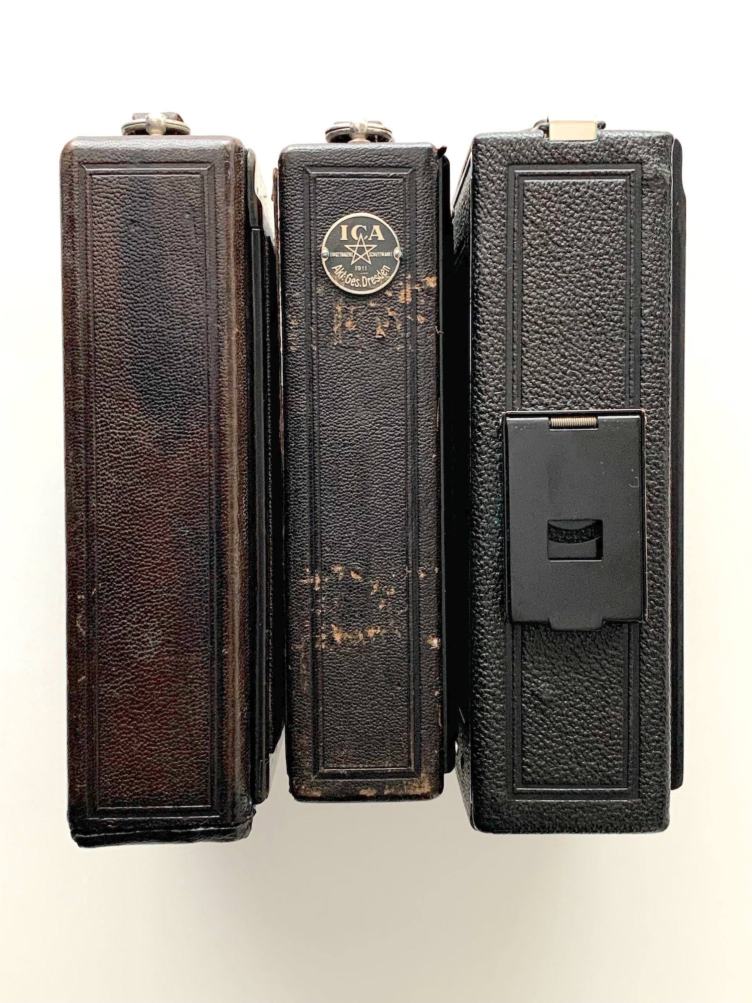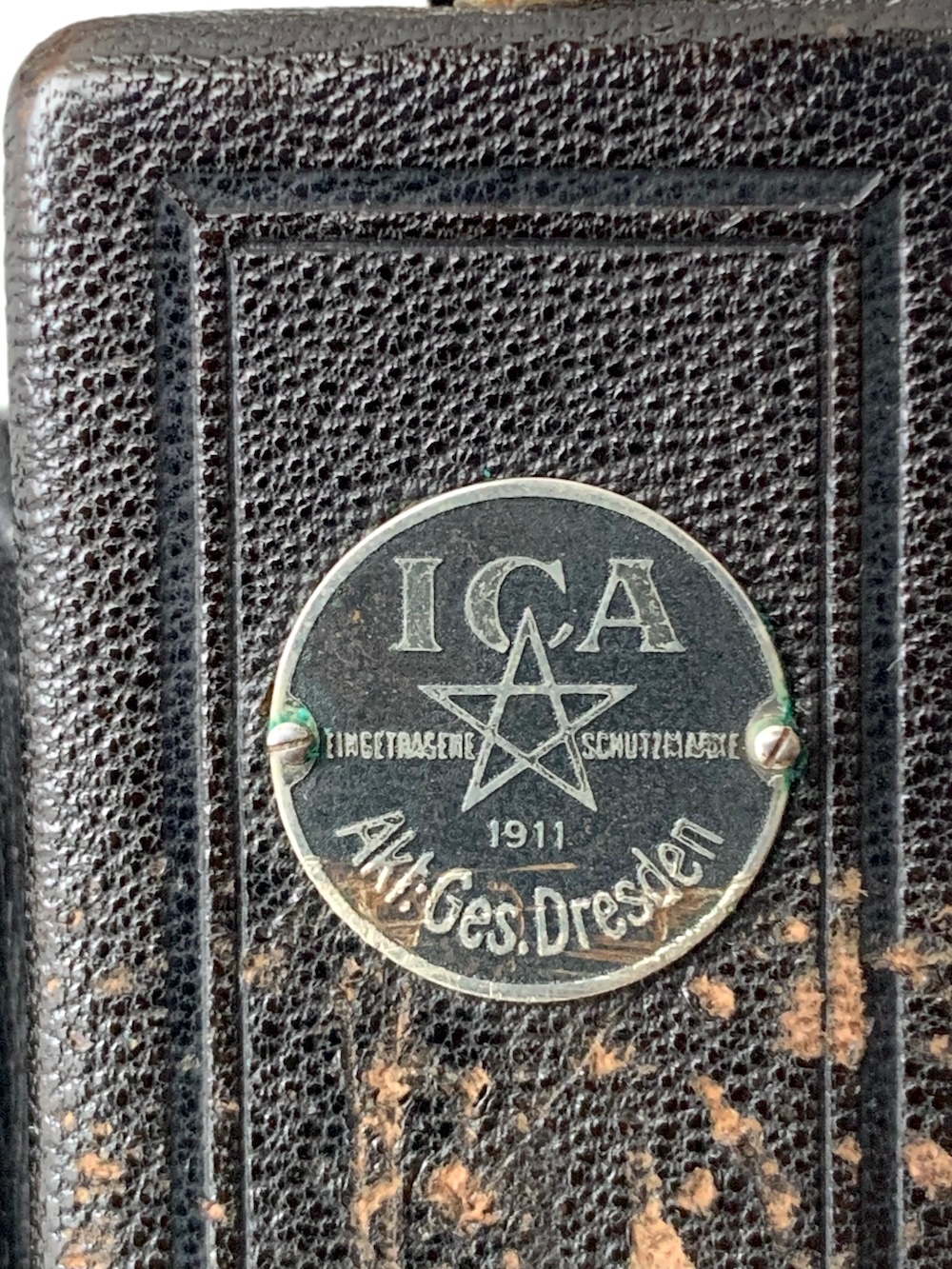 hier mal noch Bilder der von Pavel erwähnten Modellvariante von 1911/1912 mit den Sichelgriffen. Verschluss und Objektiv (Compound/Dagor 6.8) waren zu Hüttigs Zeiten die Bestausstattung, wurden aber zu ICA-Zeiten meines Wissens nicht serienmäßig angeboten. Die hier gezeigte Kamera datiert laut Seriennummer ins Jahr 1912.