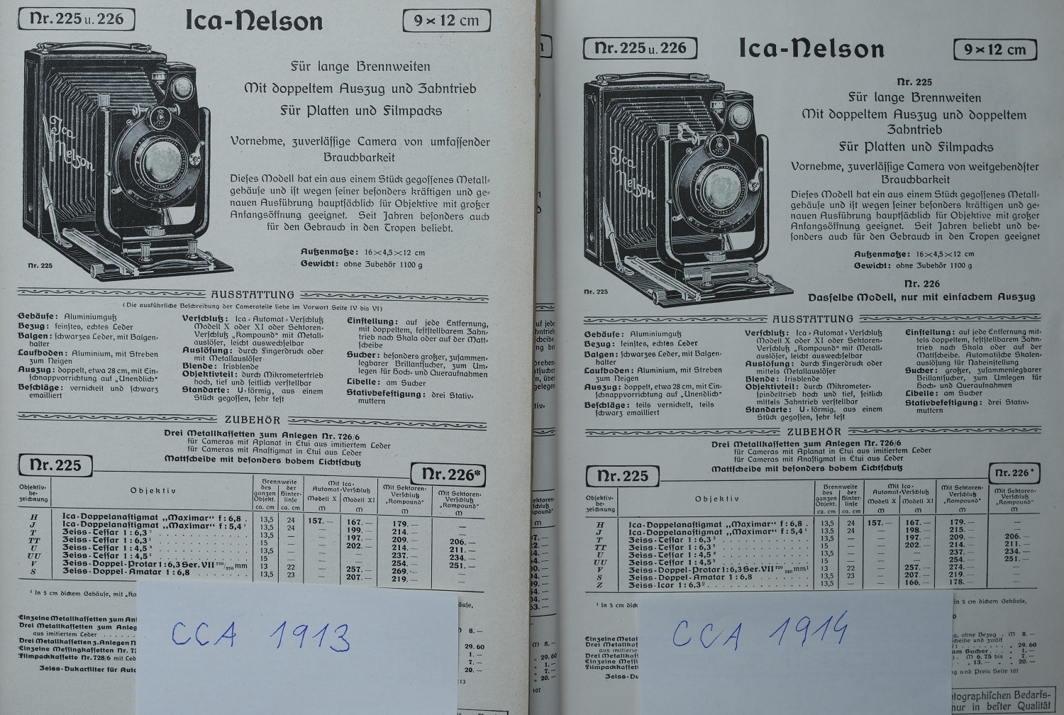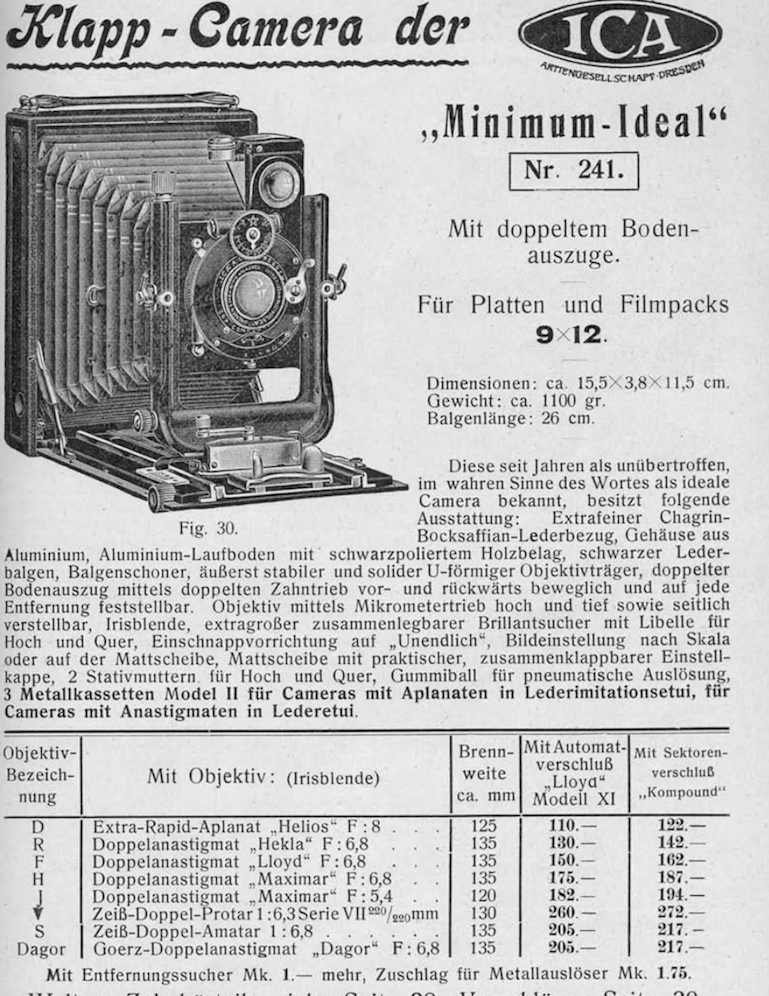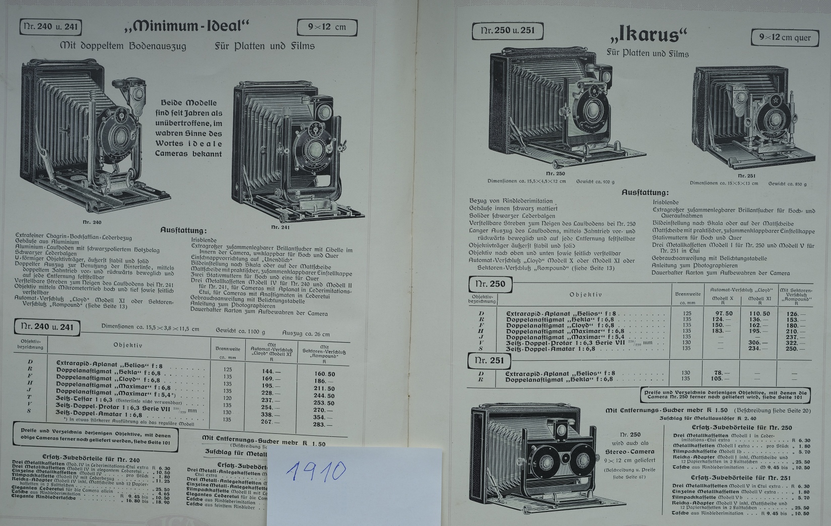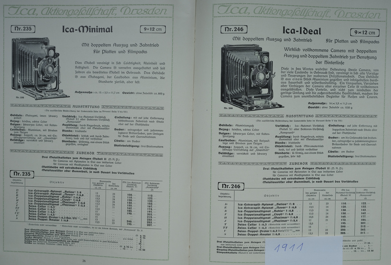 Hilfreich zur Bestimmung sind zeitgenössische Prospekte und Kataloge. In einem Verkaufskatalog des Hamburger Händlers Wiesenhavern wird 1910 eine Ica Minimum-Ideal 241 angeboten. Die Abbildung zeigt exakt die hier vorgestellte Kamera, auch die Maße und die technischen Spezifikationen passen genau. Einzige Abweichung ist die Gestaltung der Balgenstrecker – in der Katalogabbildung sind noch einfache Spanner mit Ösen zu sehen, die an Häkchen an der Standarte zu befestigen sind. Hier dürfte es sich allerdings um eine technische Weiterentwicklung handeln. Die gleiche Abbildung wie im Wiesenhavern-Katalog findet sich in der mitgelieferten (leider undatierten) Bedienungsanleitung. Nach der Plakette lässt sich die Kamera aber ins Jahr 1911 datieren. Im Beitrag unten weist Pavel darauf hin, die fragliche im Ica-Hauptkatalog 1911 als Ideal 246 geführt wird. In der hier zu sehenden Ausführung mit Maximar 6,8 war die Kamera im Jahr 1911 für 177 Mk. zu haben.