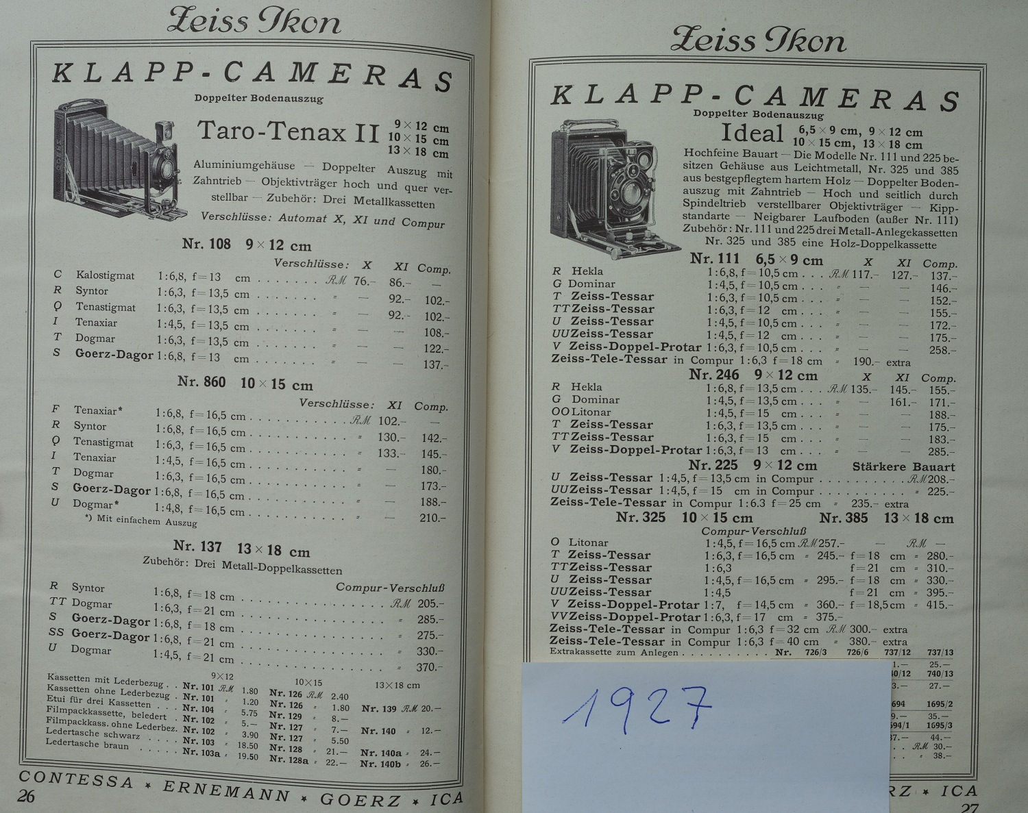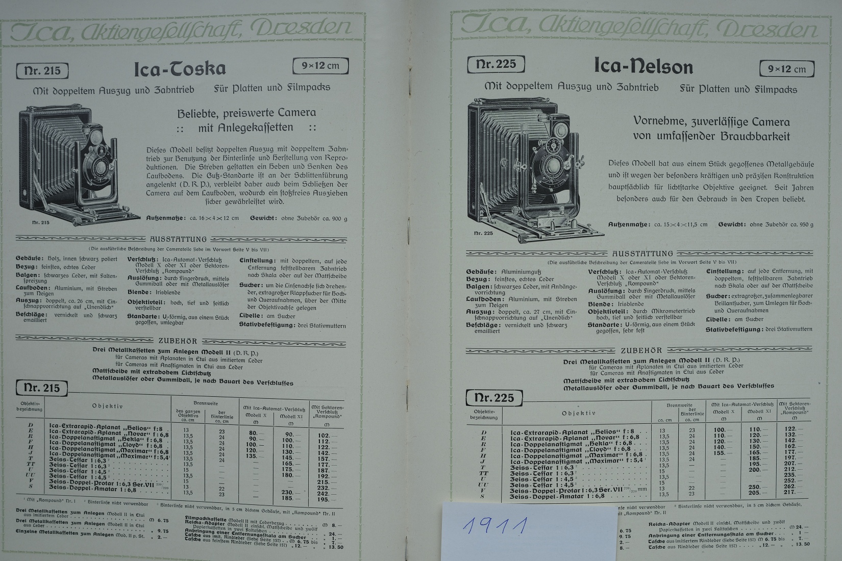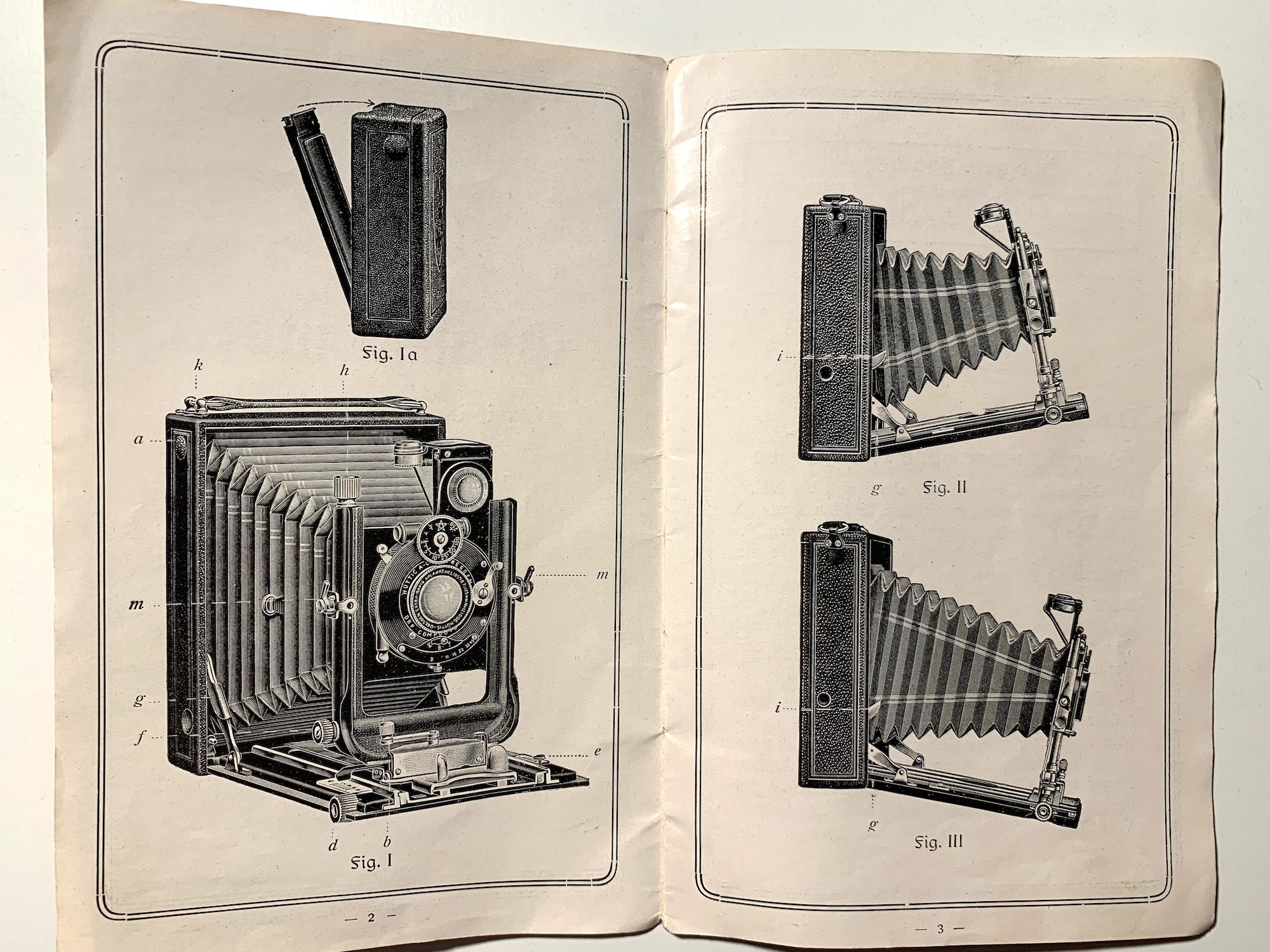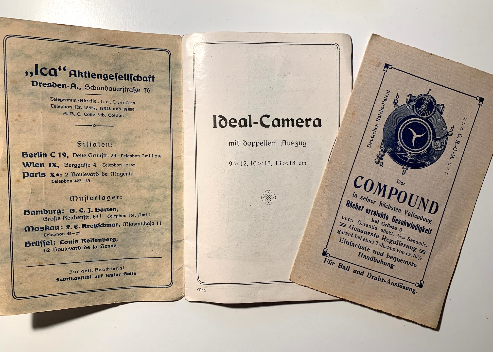 Hilfreich zur Bestimmung sind zeitgenössische Prospekte und Kataloge. In einem Verkaufskatalog des Hamburger Händlers Wiesenhavern wird 1910 eine Ica Minimum-Ideal 241 angeboten. Die Abbildung zeigt exakt die hier vorgestellte Kamera, auch die Maße und die technischen Spezifikationen passen genau. Einzige Abweichung ist die Gestaltung der Balgenstrecker – in der Katalogabbildung sind noch einfache Spanner mit Ösen zu sehen, die an Häkchen an der Standarte zu befestigen sind. Hier dürfte es sich allerdings um eine technische Weiterentwicklung handeln. Die gleiche Abbildung wie im Wiesenhavern-Katalog findet sich in der mitgelieferten (leider undatierten) Bedienungsanleitung. Nach der Plakette lässt sich die Kamera aber ins Jahr 1911 datieren. Im Beitrag unten weist Pavel darauf hin, die fragliche im Ica-Hauptkatalog 1911 als Ideal 246 geführt wird. In der hier zu sehenden Ausführung mit Maximar 6,8 war die Kamera im Jahr 1911 für 177 Mk. zu haben.