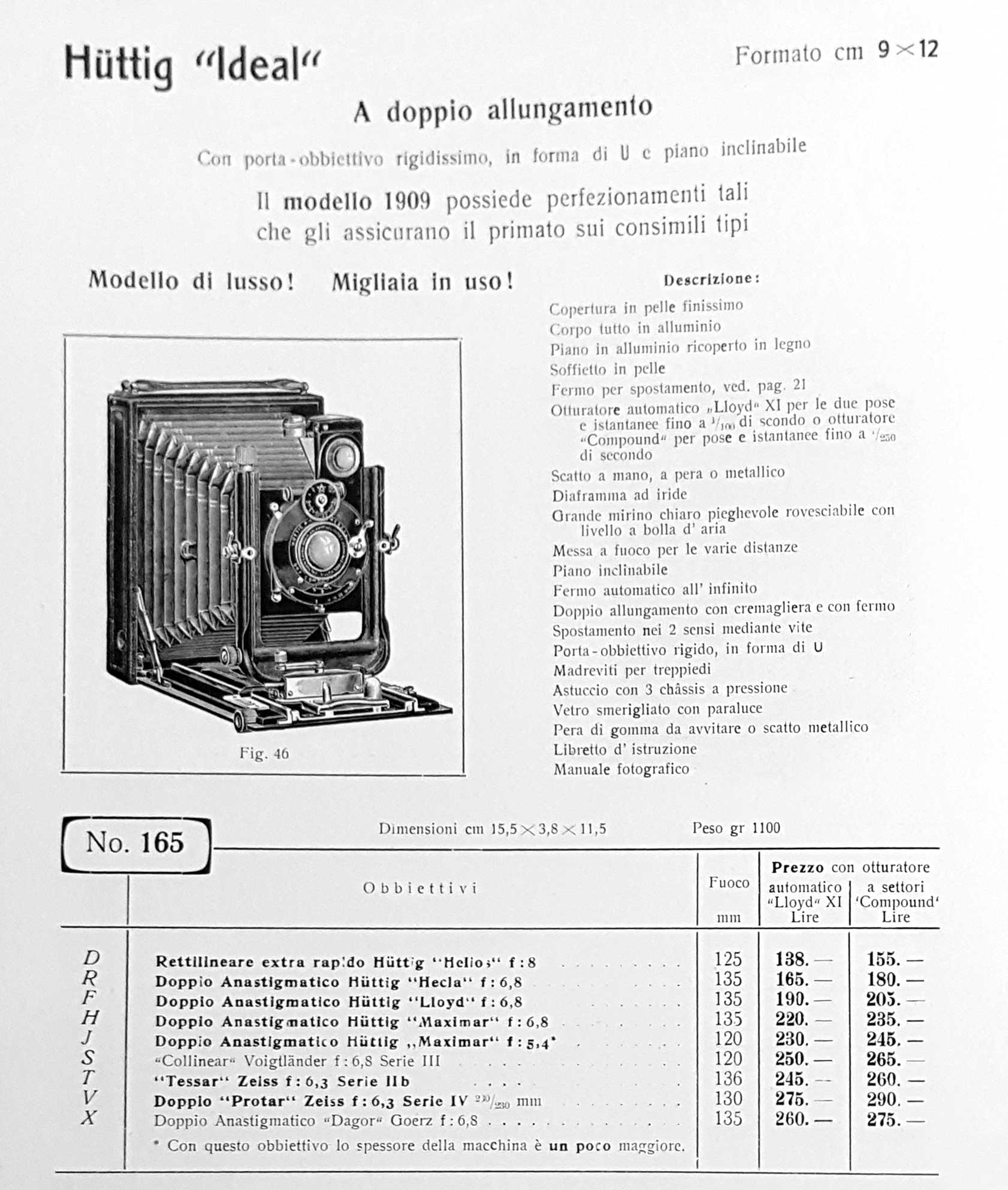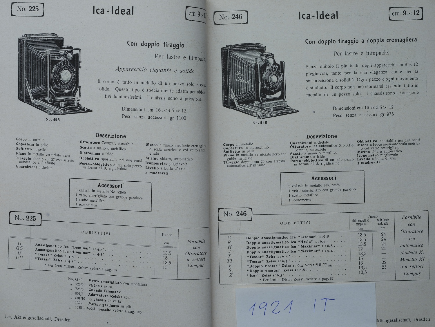 Ich glaube, es handelt sich um einen Ideal 246 von Anfang 1911. Im Hauptkatalog von 1911 ist das Bild des Ideal 246 identisch mit dem Ideal 241 von 1910. Nur in der italienischen Preisliste von 1911 ist der modernere Ideal 246 abgebildet mit sichelförmigem Handhaben. Erst ab 1912 gibt es Handgriffe in der üblichen Zylinderform. Plakette mit der Aufschrift ICA 1911 ist selten. Seit 1911 ist auf Plakette mit der Inschrift ICA in der Regel keine Jahresangabe mehr angegeben. Dies ist ein weiterer Grund zu der Annahme, dass die Kamera vom Anfang des Jahres 1911 stammt. Die Seriennummer auf dem Objektiv (das Sie mir geschickt haben) ist ebenfalls ein Jahr 1911.